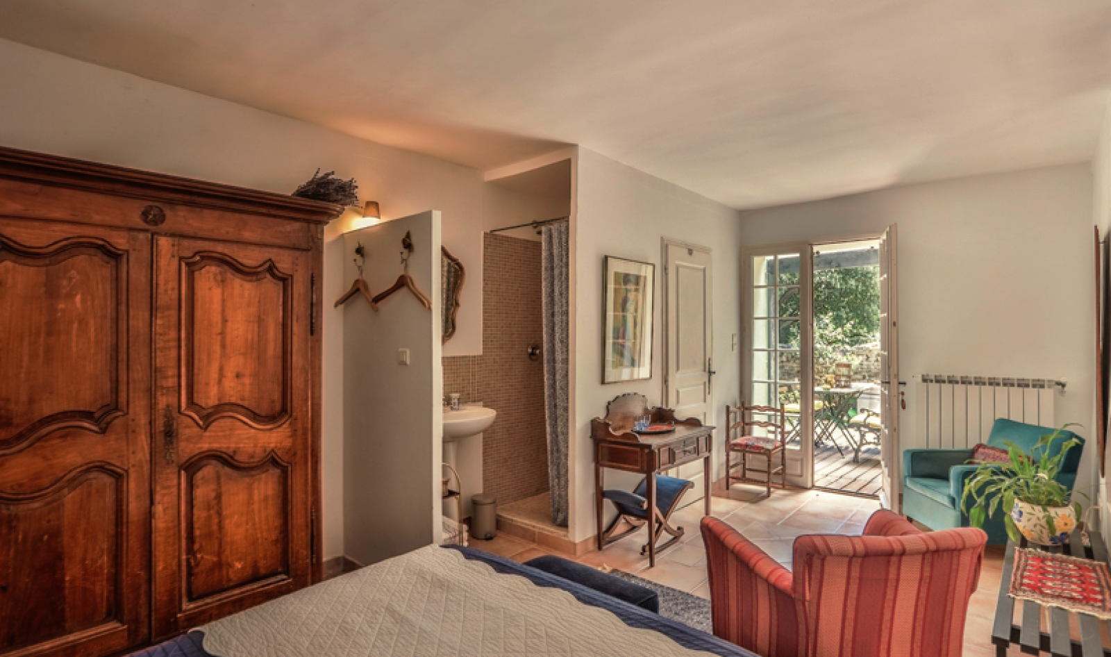 Ce mas se compose d’ une belle partie privative avec un vaste salon, cuisine et de 2 chambres en suites, ainsi que 3 chambres d’hôtes et 2 gites indépendants .