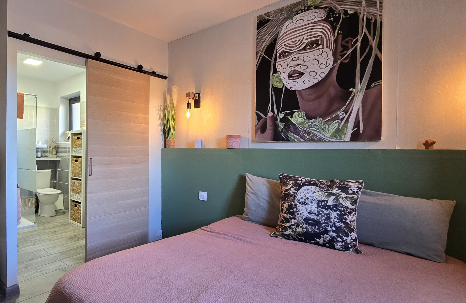 Il se compose d’un salon avec coin cuisine de 30 m², un cellier, suite parentale de 30 m² et dispose d’un espace jardin privatif