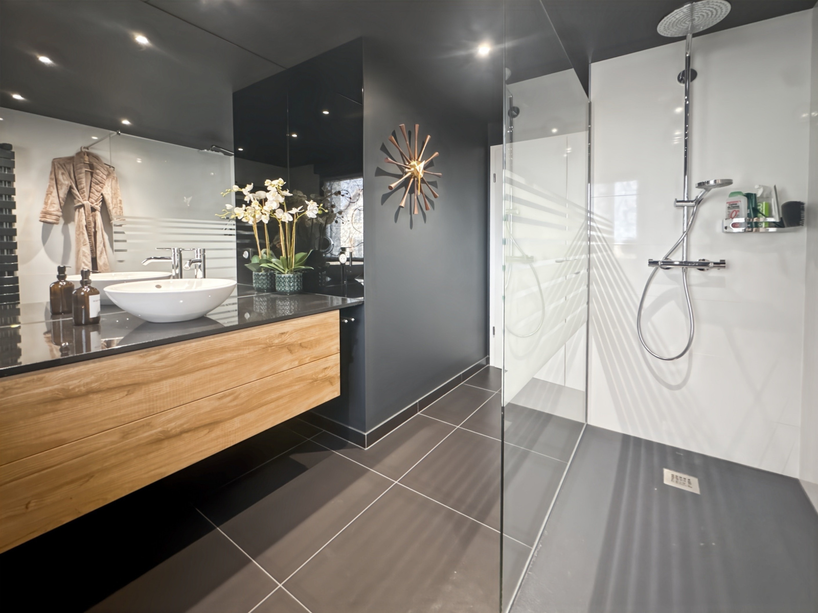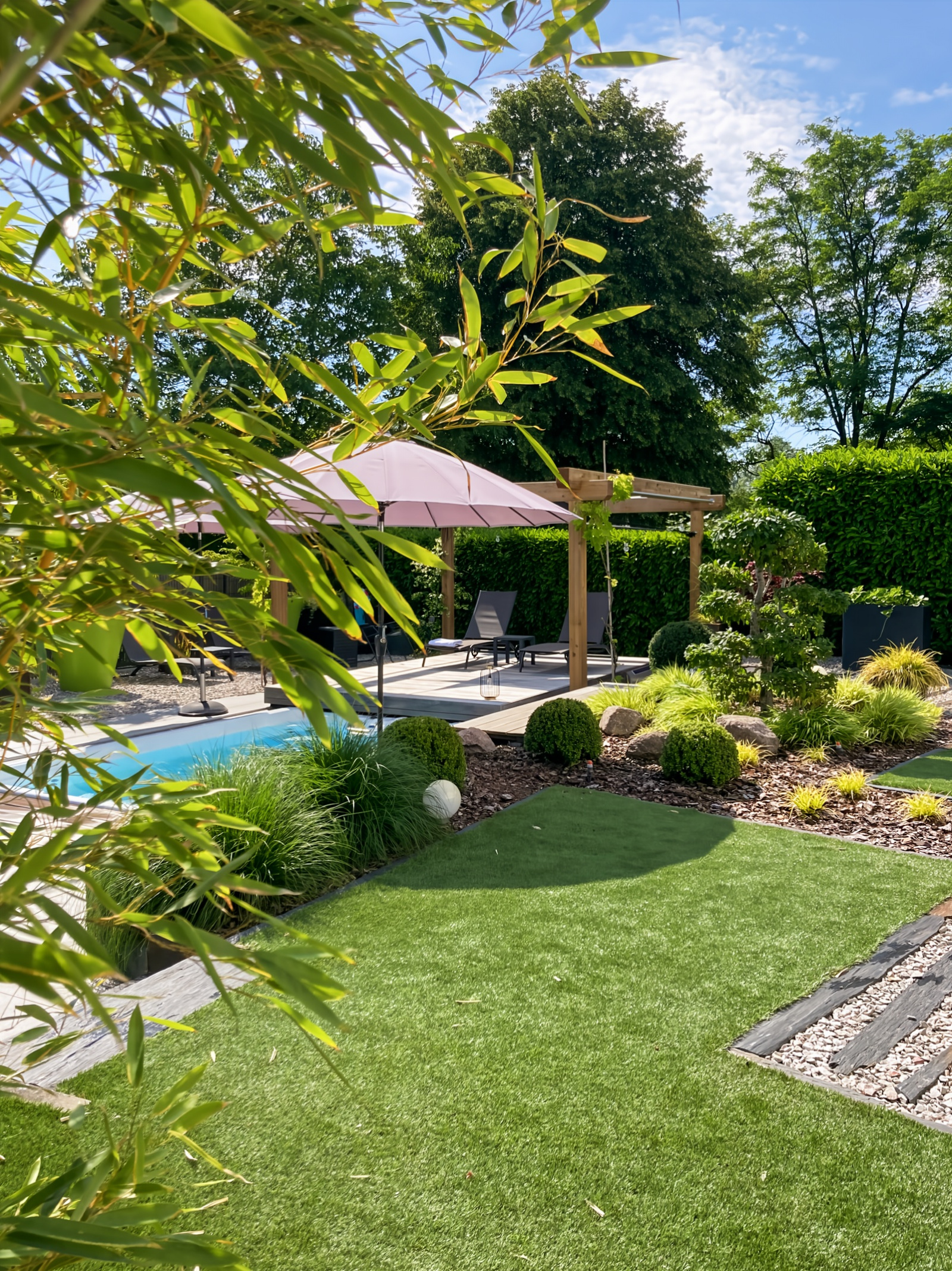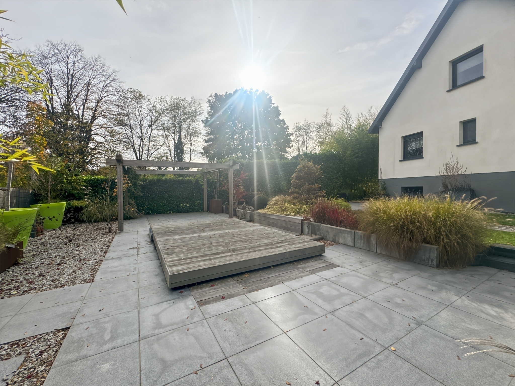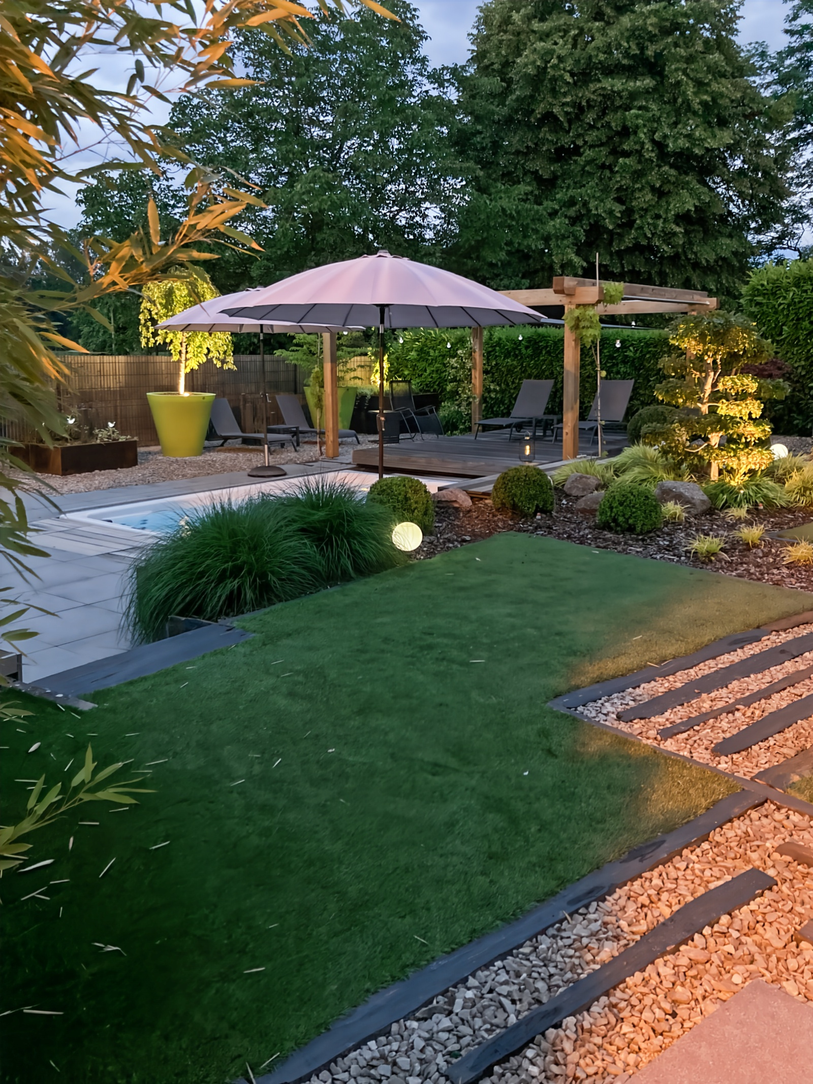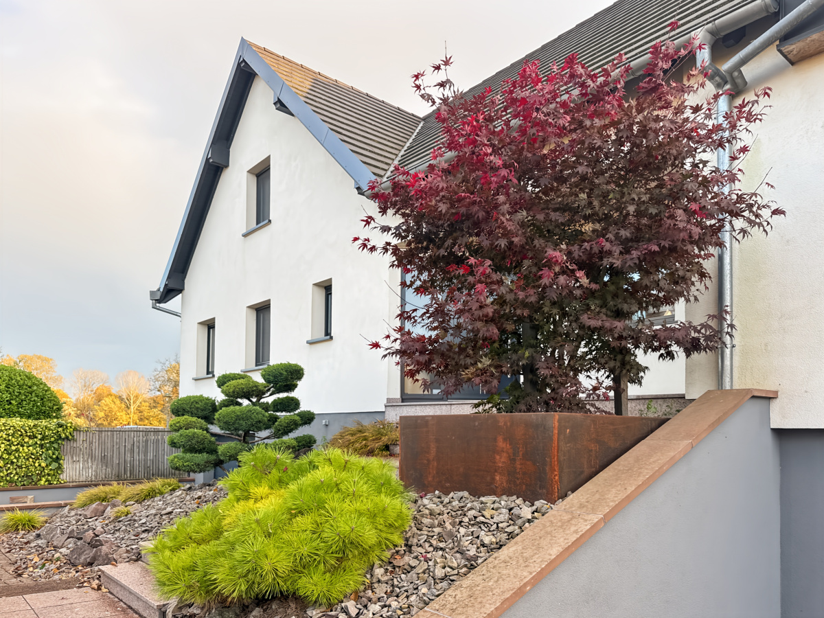Côté extérieur, tout a été pensé avec goût. Plusieurs terrasses et lieux de détente s'articulent autour de la maison. Le jardin est paysagé et équipé d'un spa de nage sécurisé. Il profite en outre de l'arrosage automatique et d'un éclairage sur mesure.
