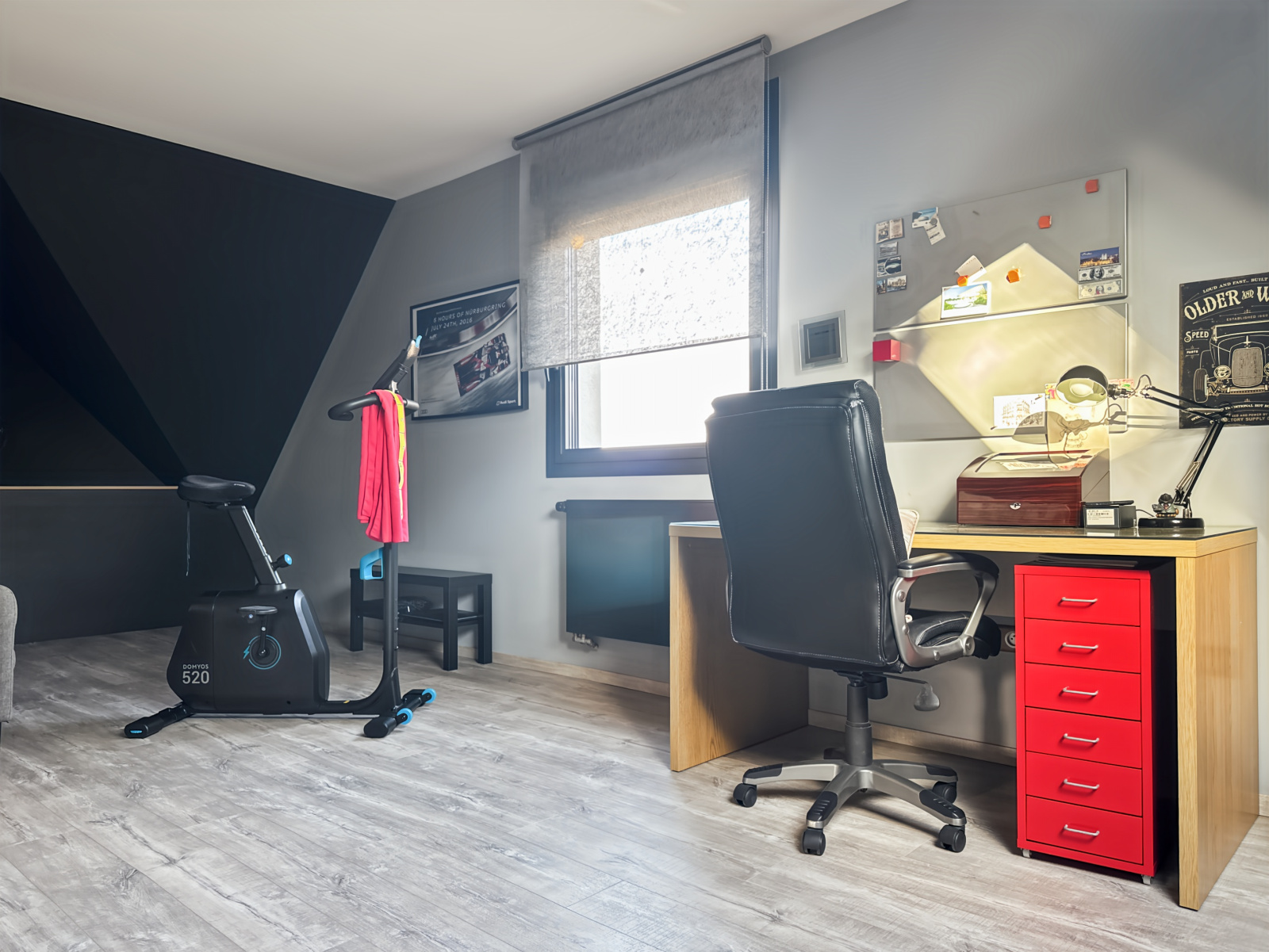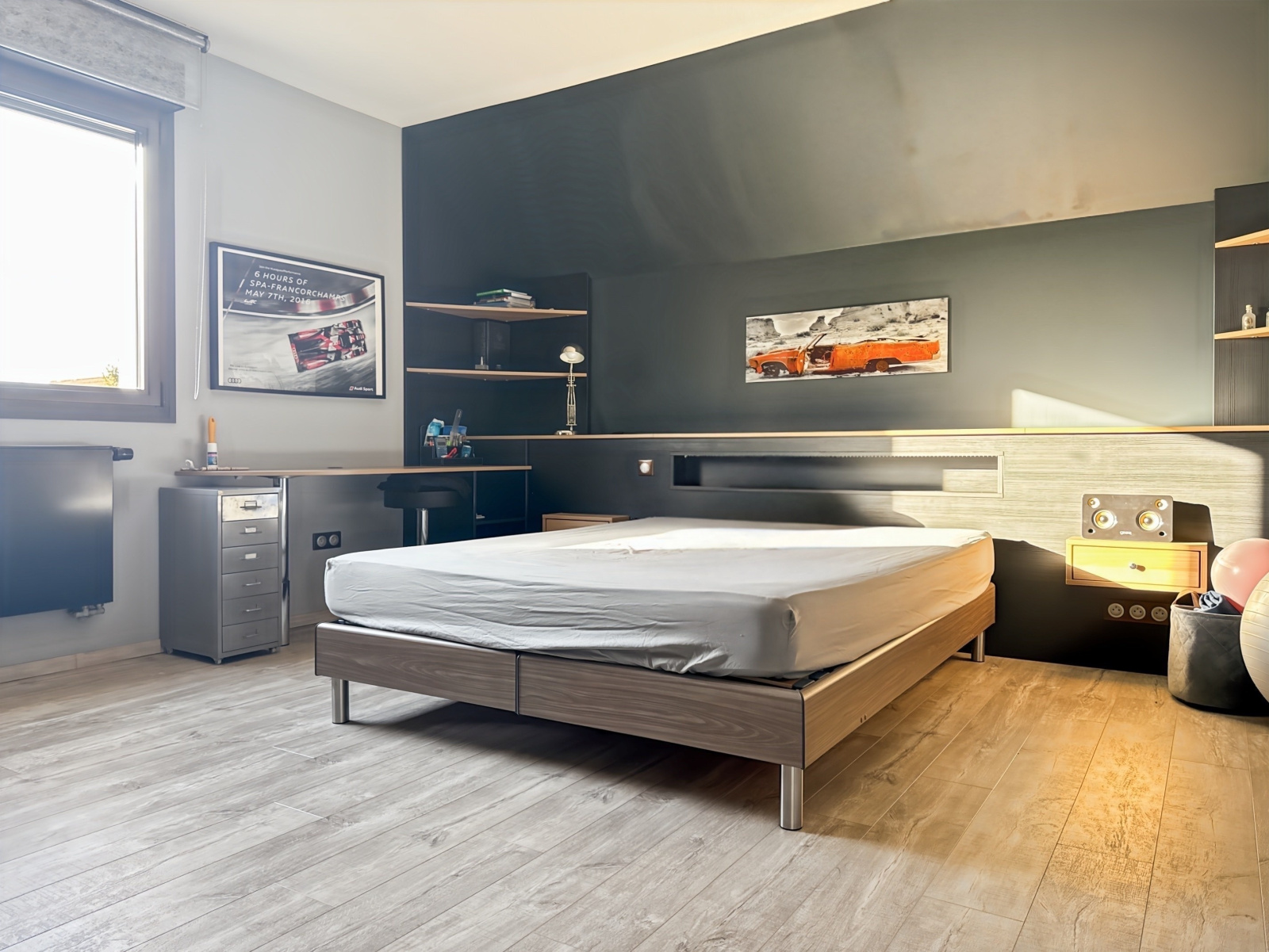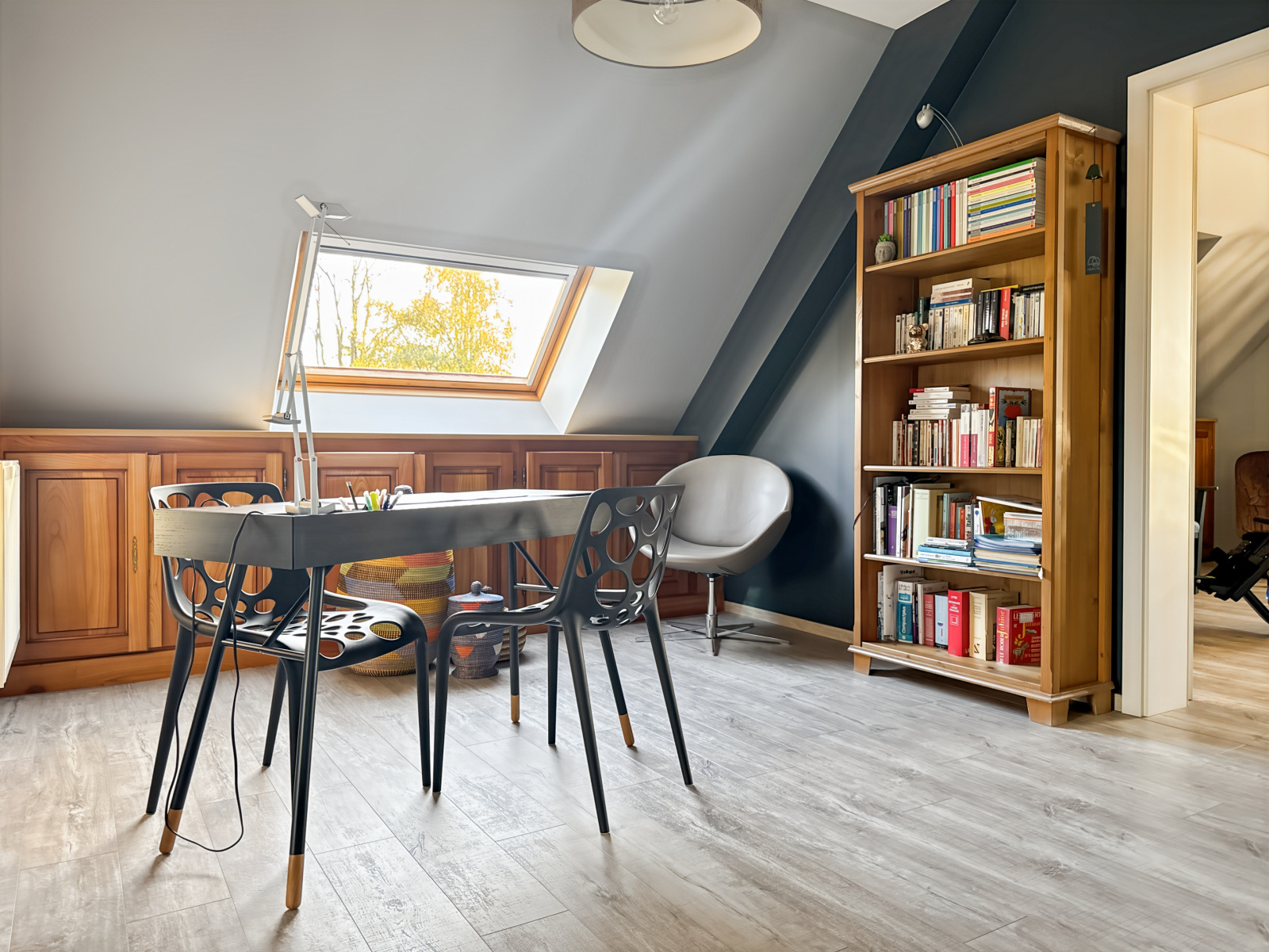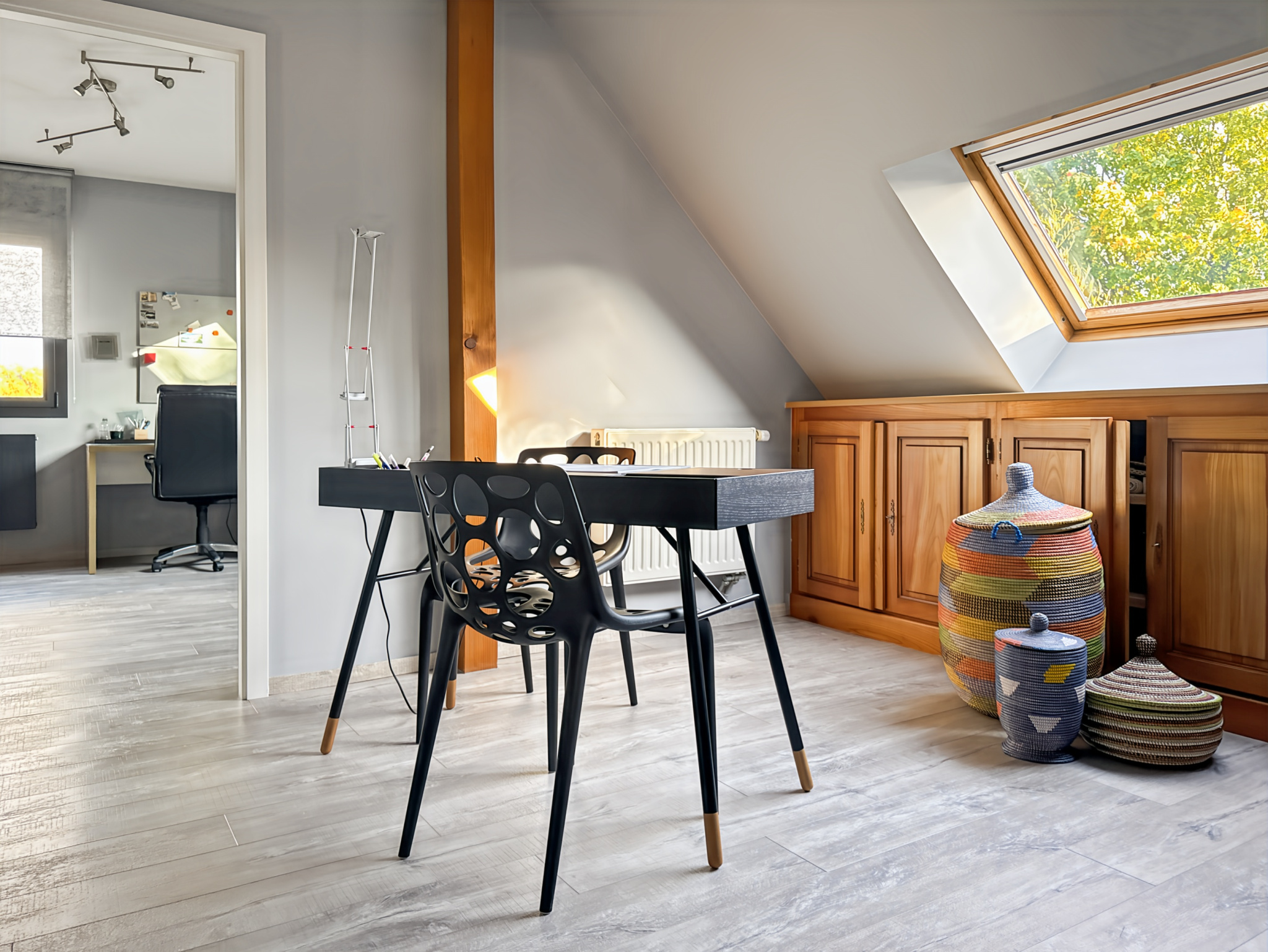 À l'étage, se trouvent un espace bureau, deux spacieuses chambres (23 et 20,3 m2 habitables), une salle d'eau avec toilettes et un débarras.