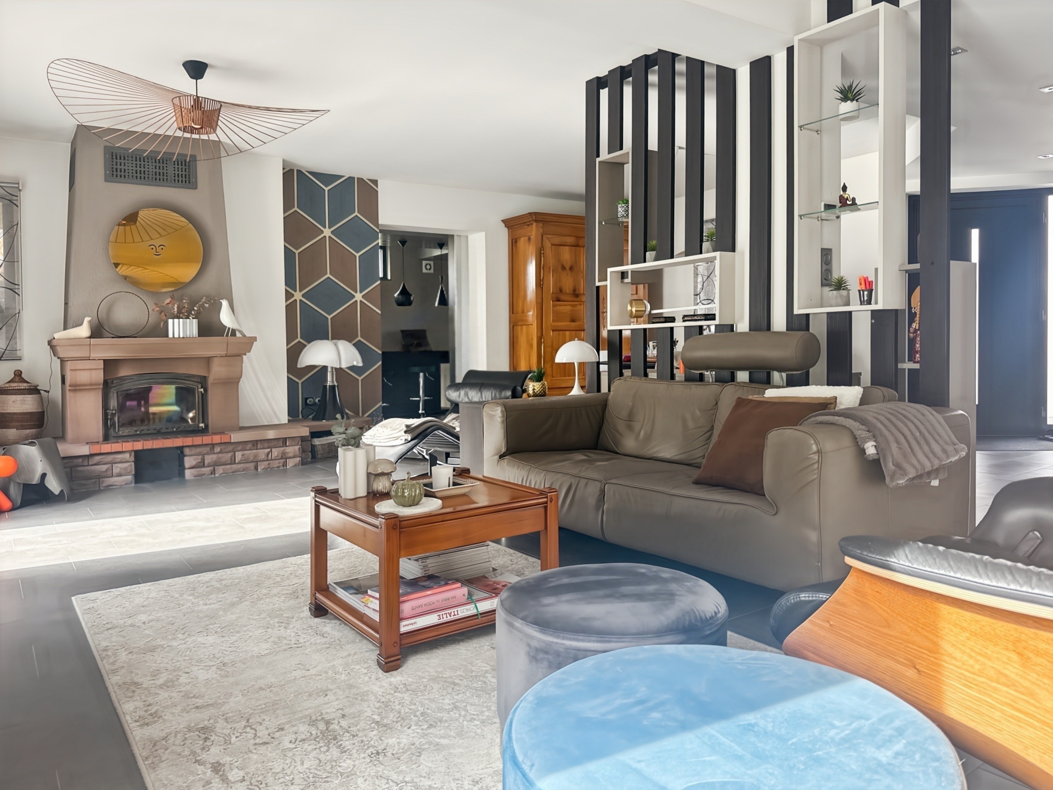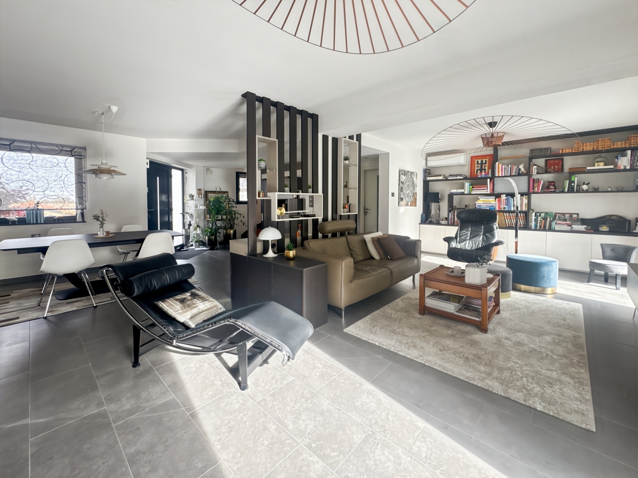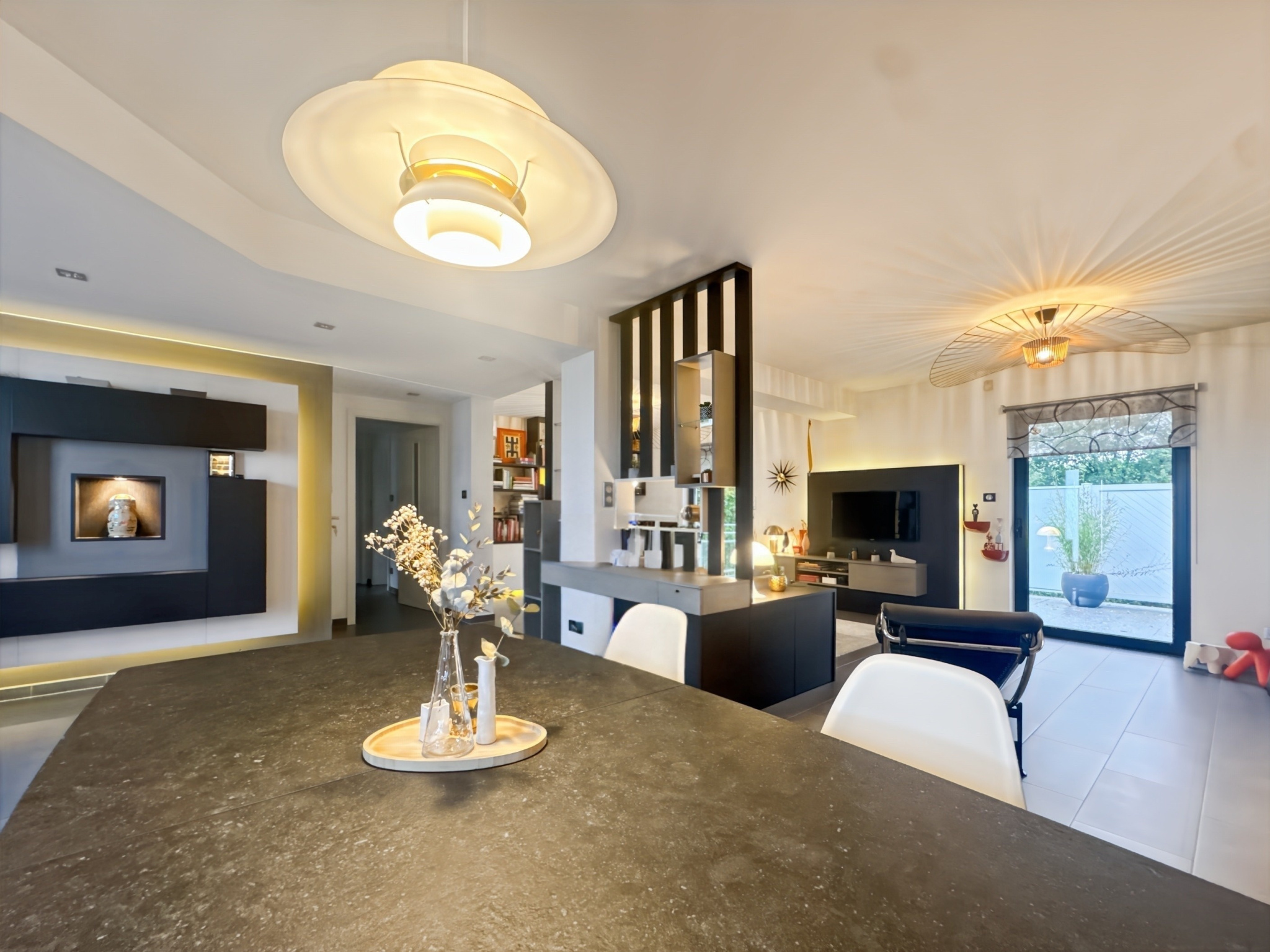 Il se compose, sur son niveau principal, d'une entrée, d'un vaste salon-séjour avec cheminée de 51 m2 (avec double accès terrasse), d'une cuisine dînatoire équipée et semi-ouverte de 20,8 m2 (avec accès pergola), d'un dégagement avec placard, d'une chambre, d'un bureau, d'une salle d'eau et de toilettes séparées. La terrasse et la pergola cumulent environ 40 m2 !