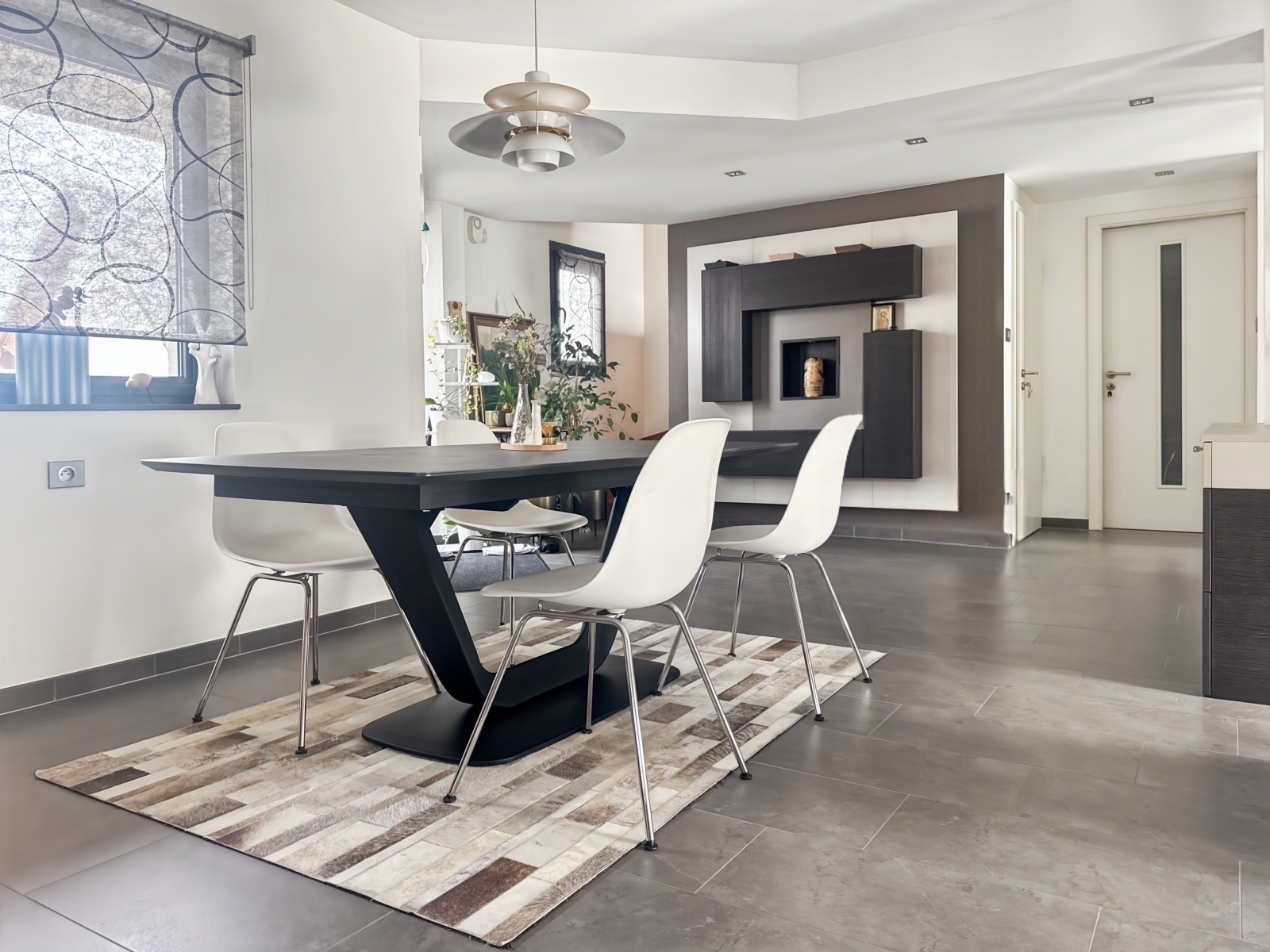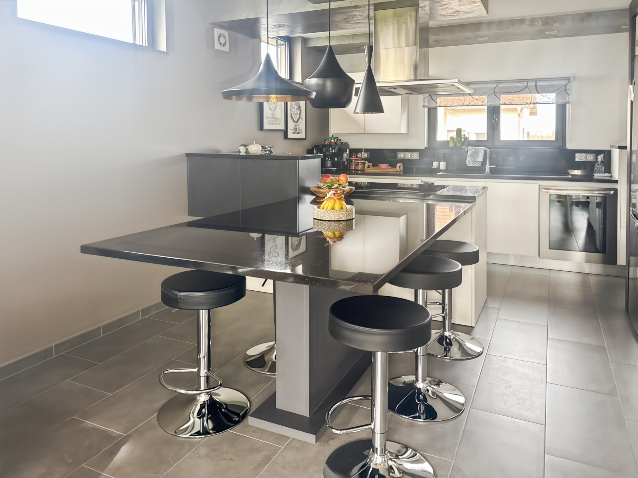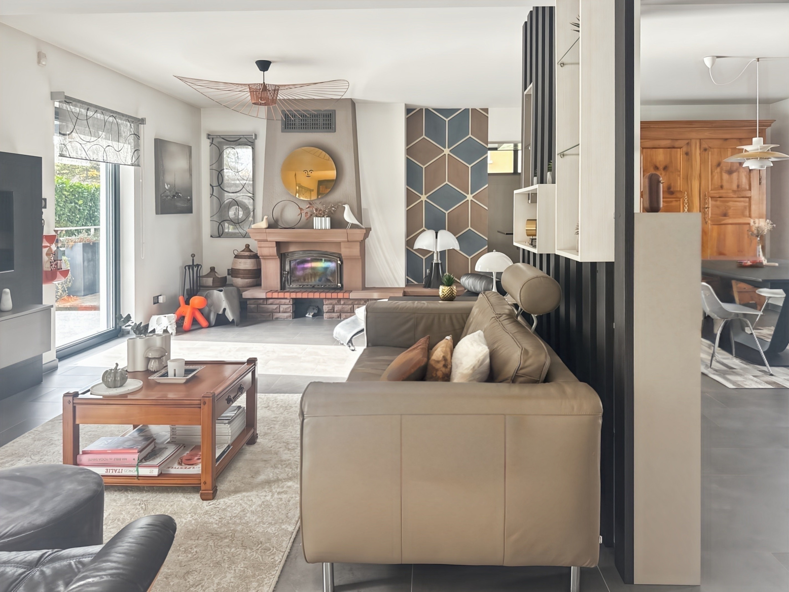 Il se compose, sur son niveau principal, d'une entrée, d'un vaste salon-séjour avec cheminée de 51 m2 (avec double accès terrasse), d'une cuisine dînatoire équipée et semi-ouverte de 20,8 m2 (avec accès pergola), d'un dégagement avec placard, d'une chambre, d'un bureau, d'une salle d'eau et de toilettes séparées. La terrasse et la pergola cumulent environ 40 m2 !