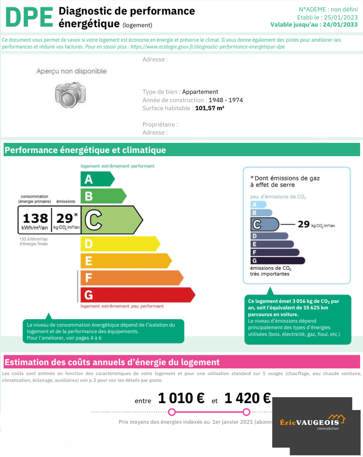 Montant estimé des dépenses annuelles d'énergie de ce logement pour un usage standard est compris entre 1 010 € et 1 420 € . 2021 étant l'année de référence des prix de l'énergie utilisés pour établir cette estimation.