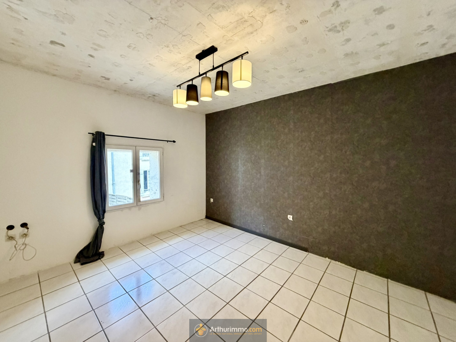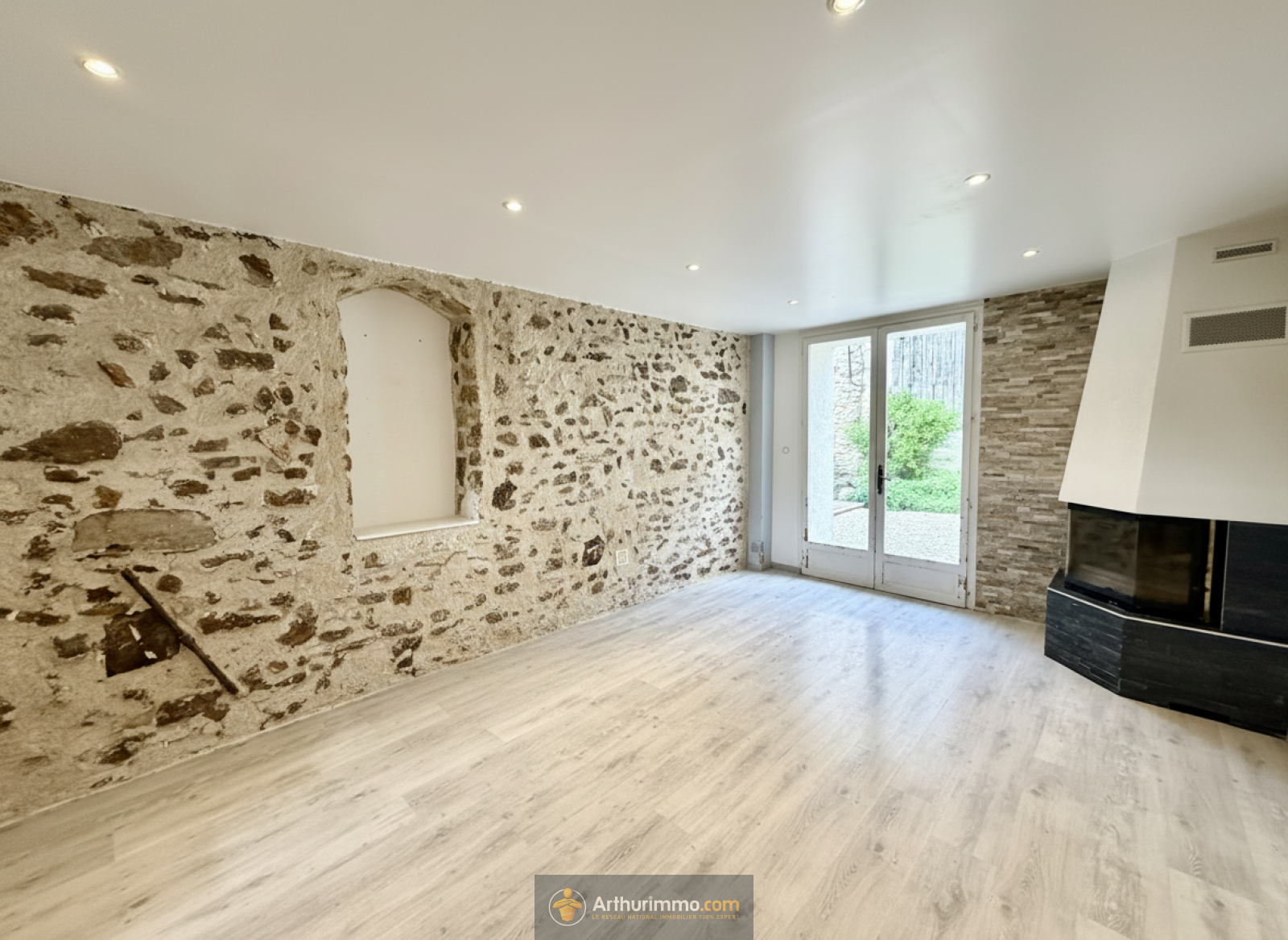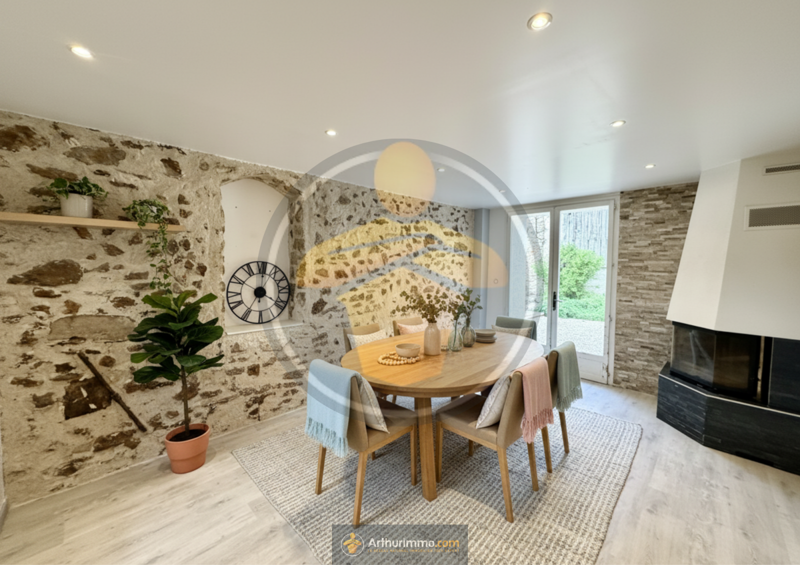 RDC : Un salon-séjour lumineux met en valeur de belles pierres apparentes Cuisine équipée WC séparé.