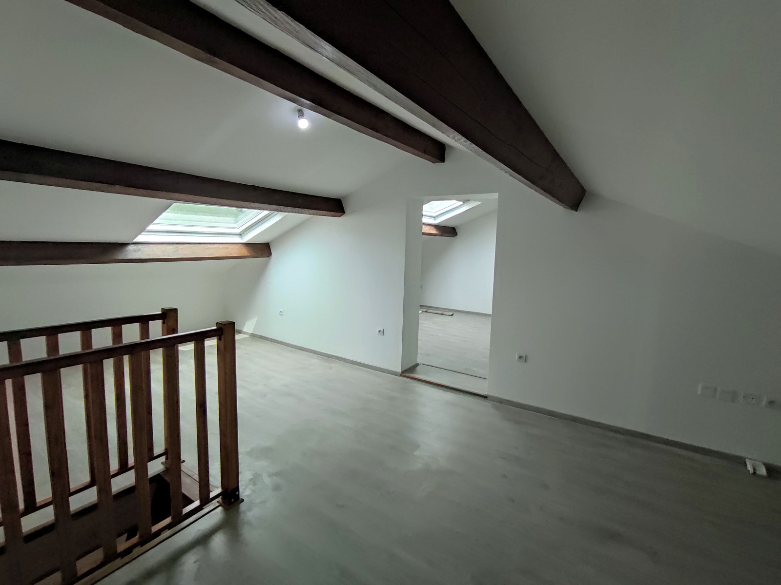 L’entrée se fait par une passerelle extérieure pouvant être aménagée en terrasse. Elle mène à la cuisine semi-équipée, avec la possibilité de l’ouvrir pour créer une grande pièce de vie lumineuse. Ce niveau comprend également deux chambres, chacune avec salle d’eau et WC, dont une suite avec baignoire. L’étage mansardé propose une pièce supplémentaire ainsi qu’une chambre.