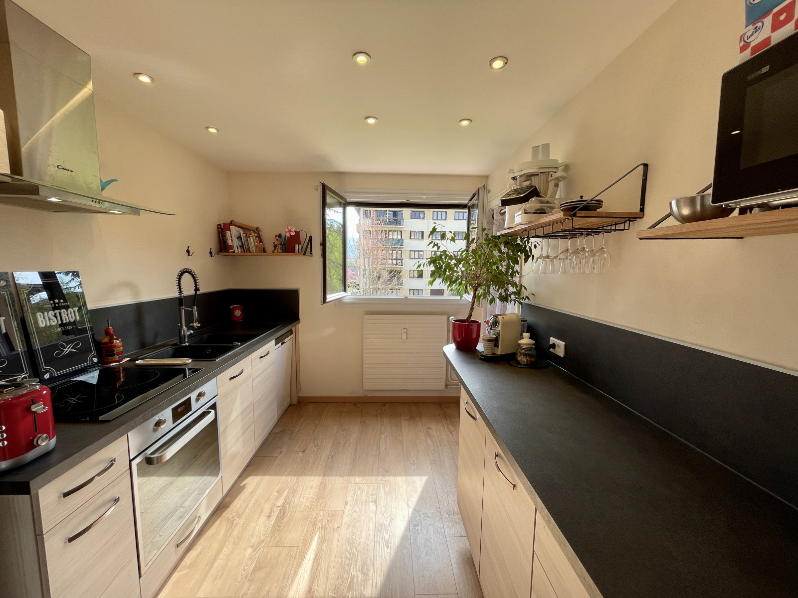- Cuisine entièrement aménagée et équipée : lave-vaisselle, four traditionnel, plaque cuisson à induction, hotte