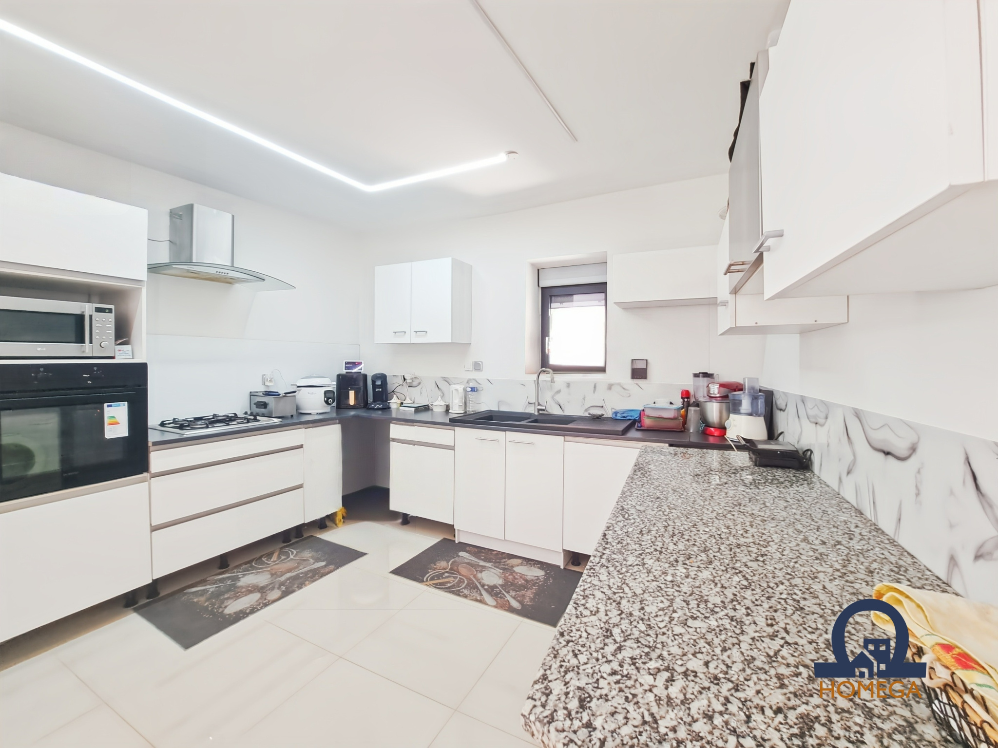 Au rez-de-cour, on découvre une grande pièce de vie en L, composée d’une cuisine équipée ouverte, d’un espace salle à manger et d’un salon spacieux donnant directement sur une première terrasse. Cet espace est agréable à vivre et bien agencé.