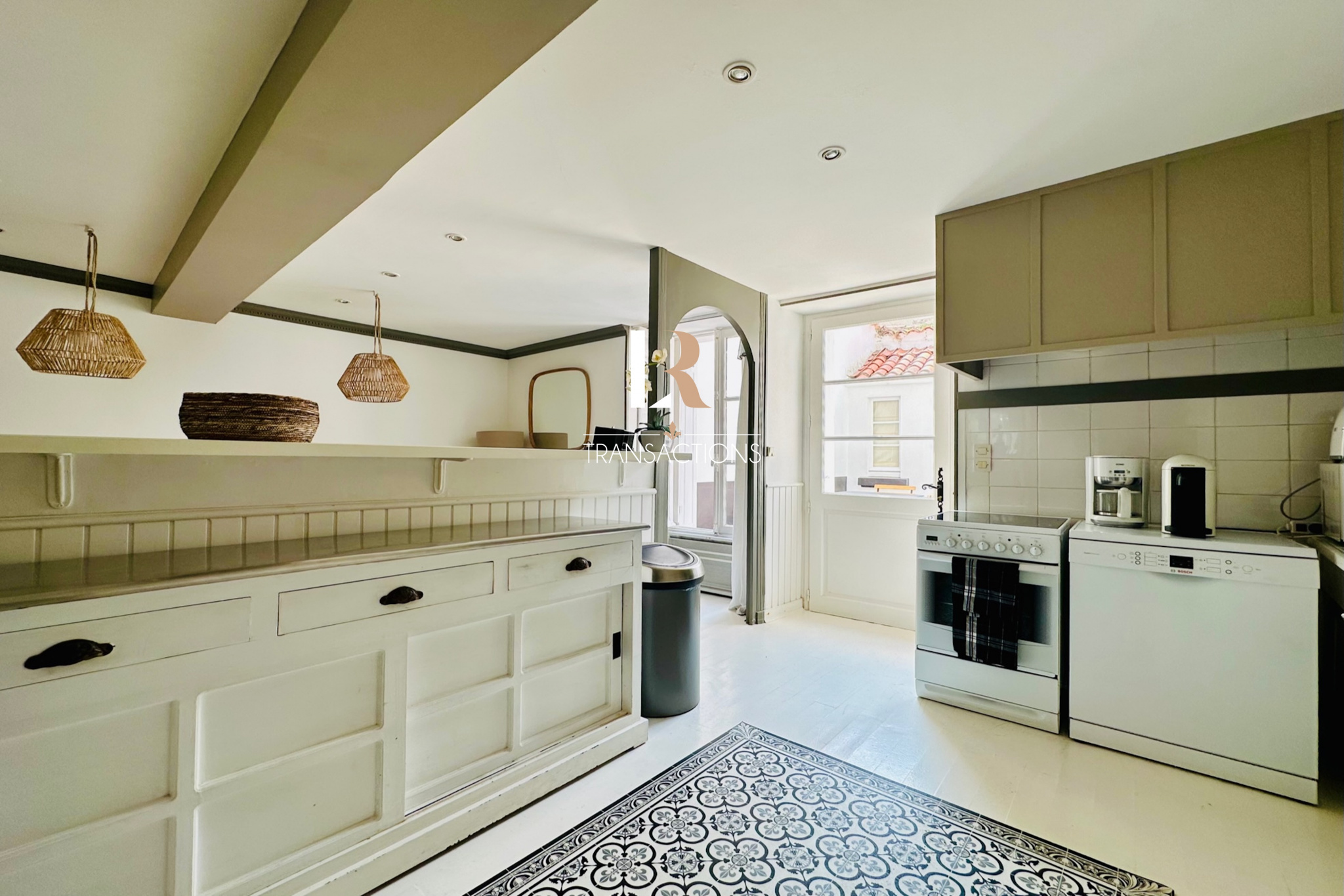 Une entrée dessert sur sa gauche, un salon avec cheminée, prolongé par l'espace séjour traversant Est-Ouest, ainsi qu'une cuisine ouverte donnant sur une joile cour intérieure exposée Ouest et sans vis-à -vis. Cette cour donne accès à un wc indépendant et à une buanderie.