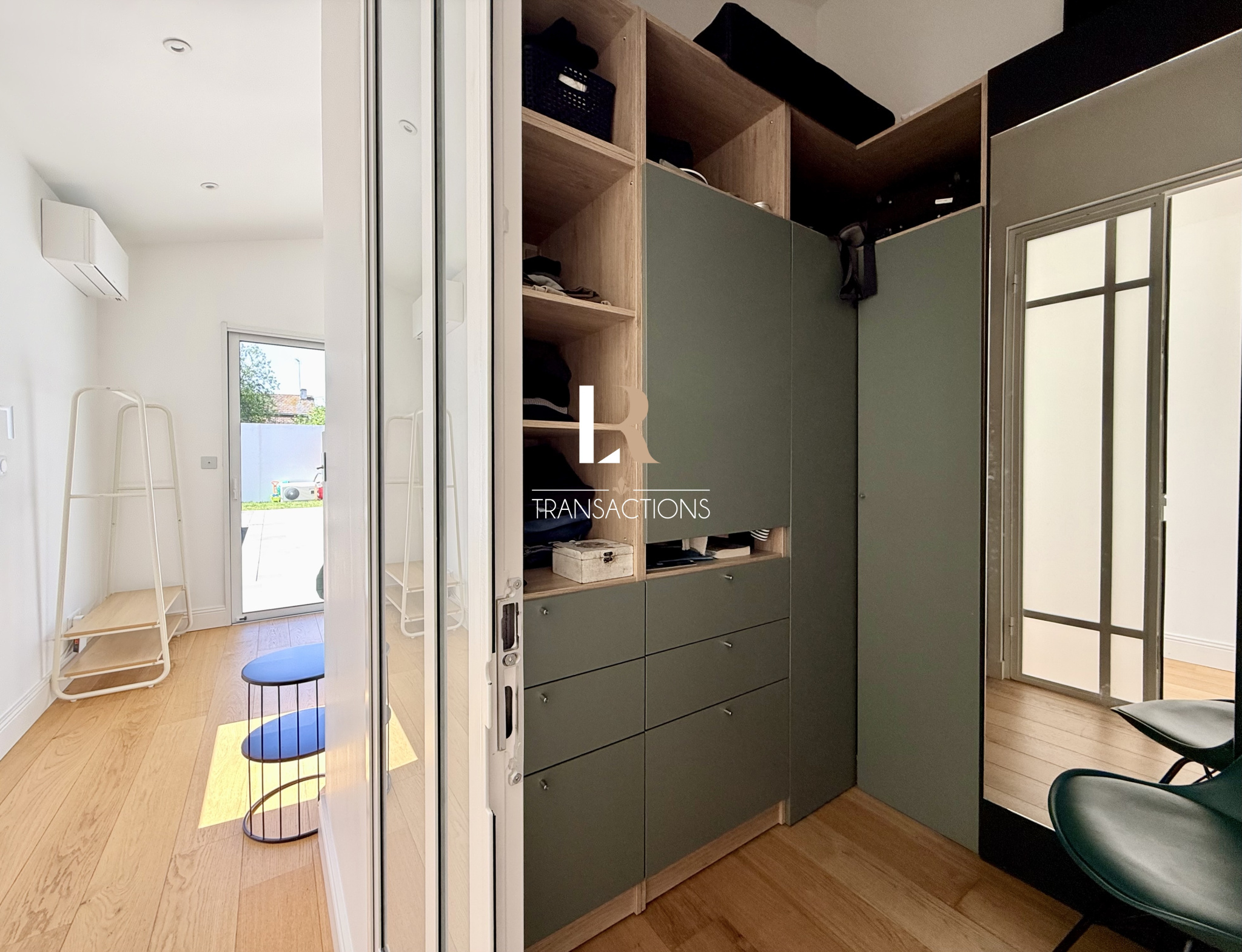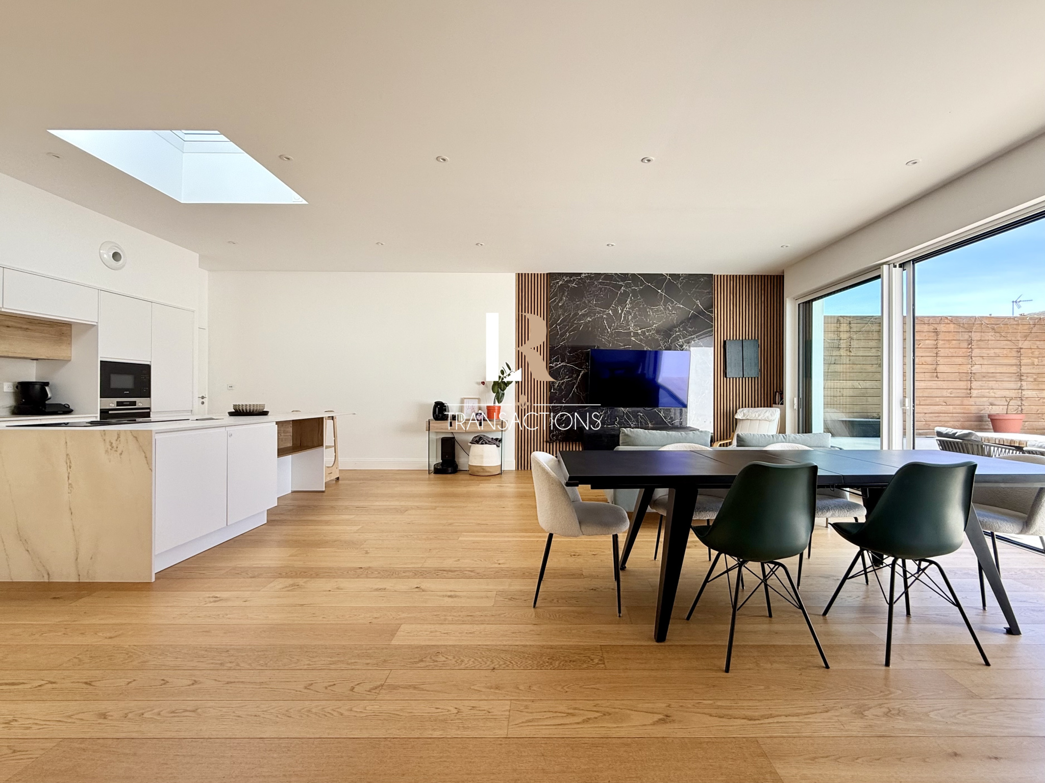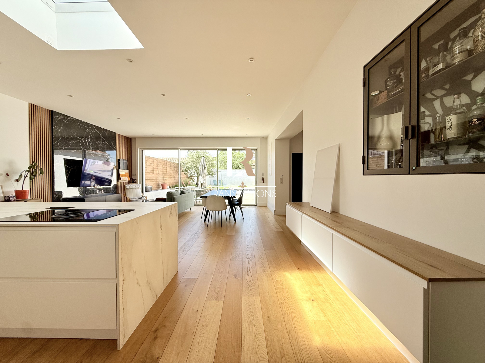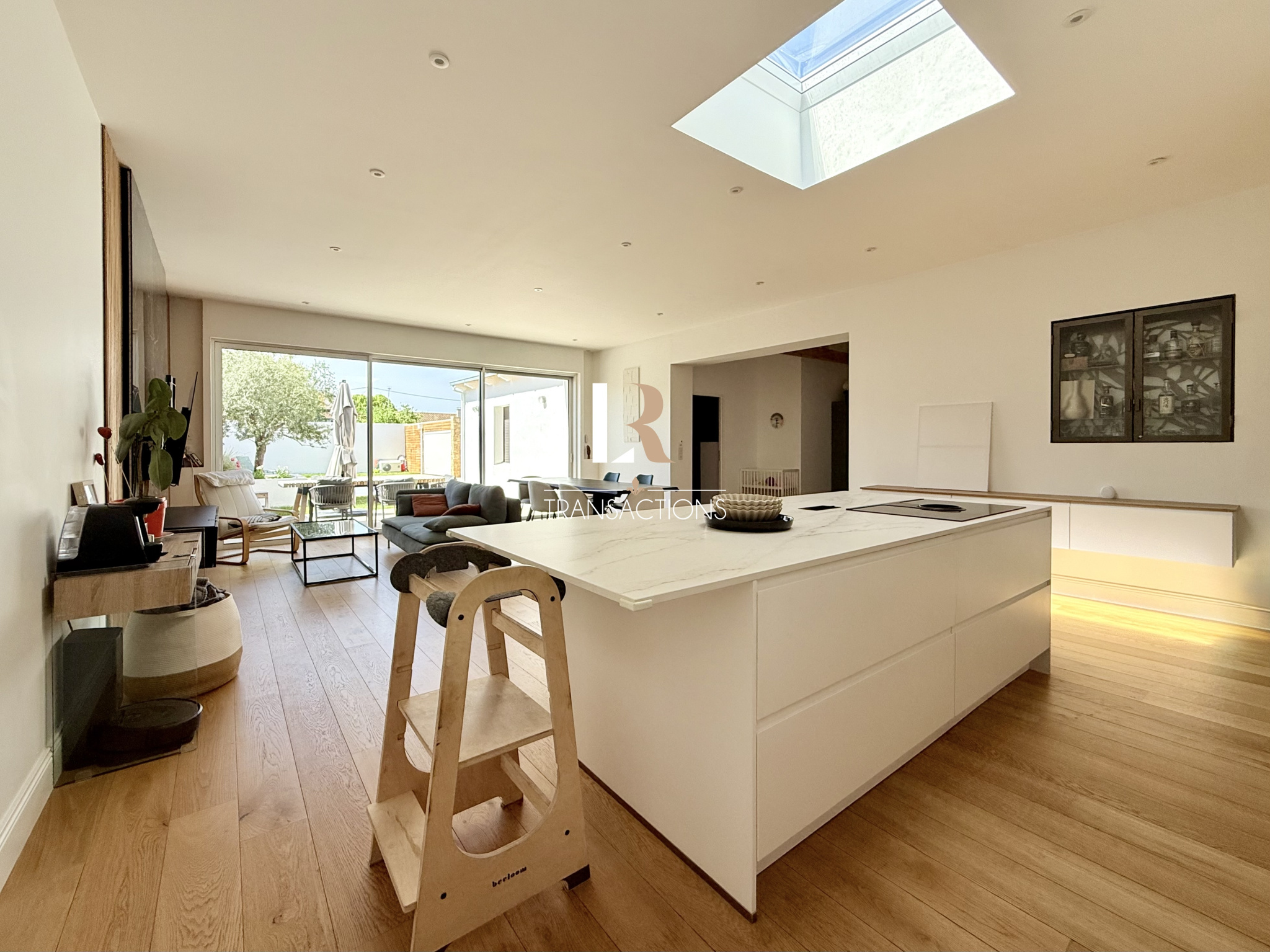 Une spacieuse entrée aménagée avec banc et penderie, s'ouvre sur la pièce de vie lumineuse grâce à son puit de jour et ses grandes baies offrant une vue très agréable sur le jardin. Elle abrite une jolie cuisine avec ilot central très fonctionnelle, et profite d'un accès directement au garage.