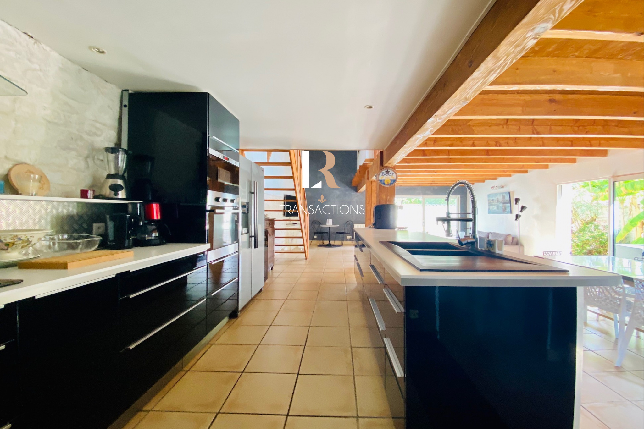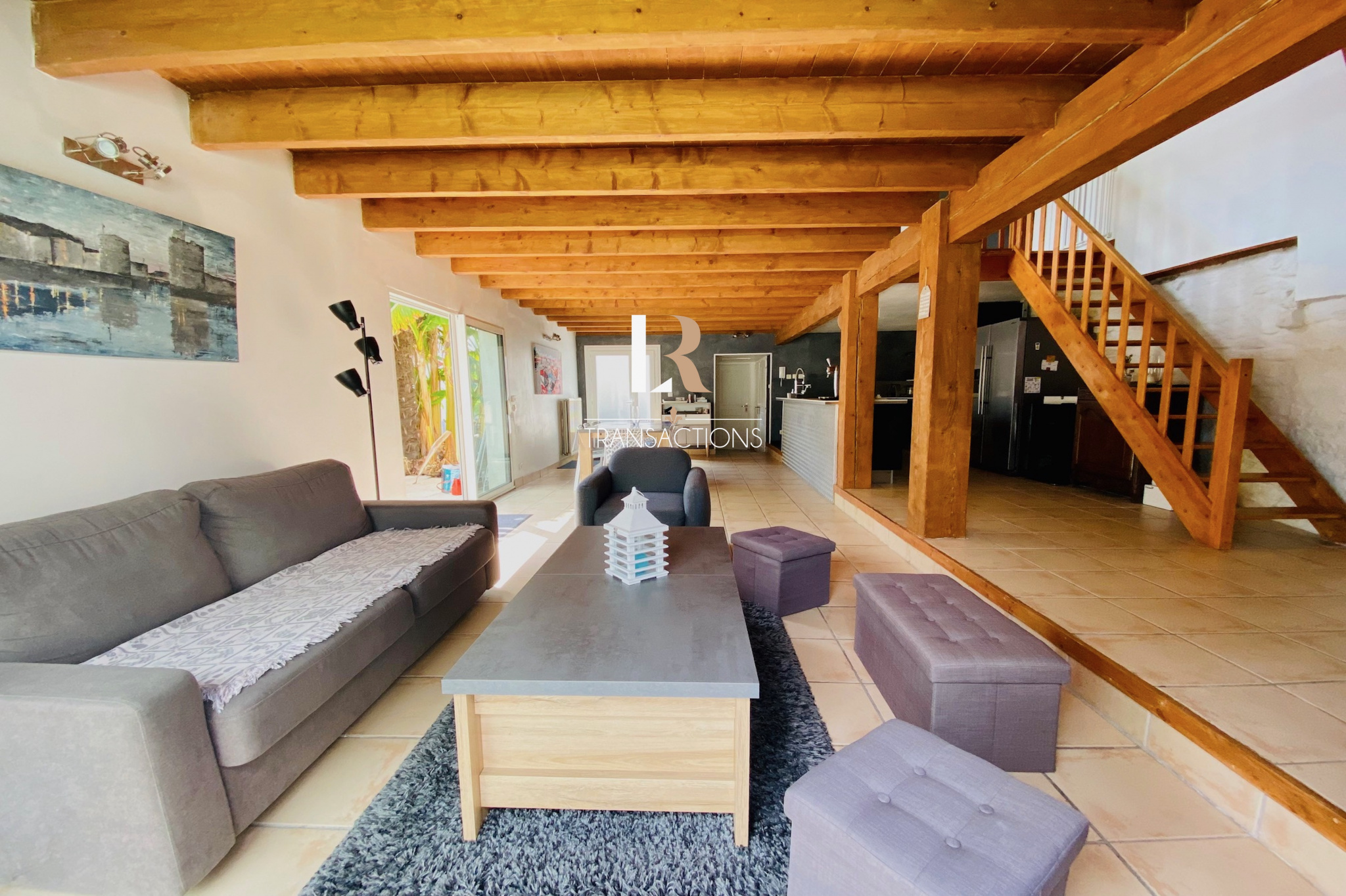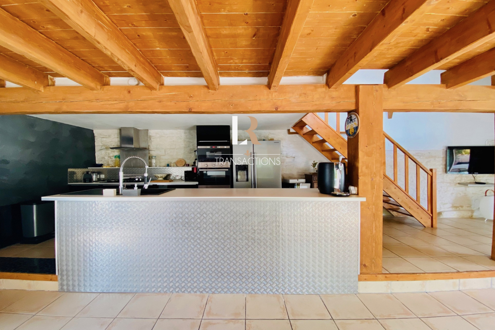 Une belle pièce de vie d'environ 55m² avec poutres apparentes et s'ouvrant l'extérieur. Cette dernière est composée d’un espace repas avec cuisine équipée ouverte, prolongé par le salon.