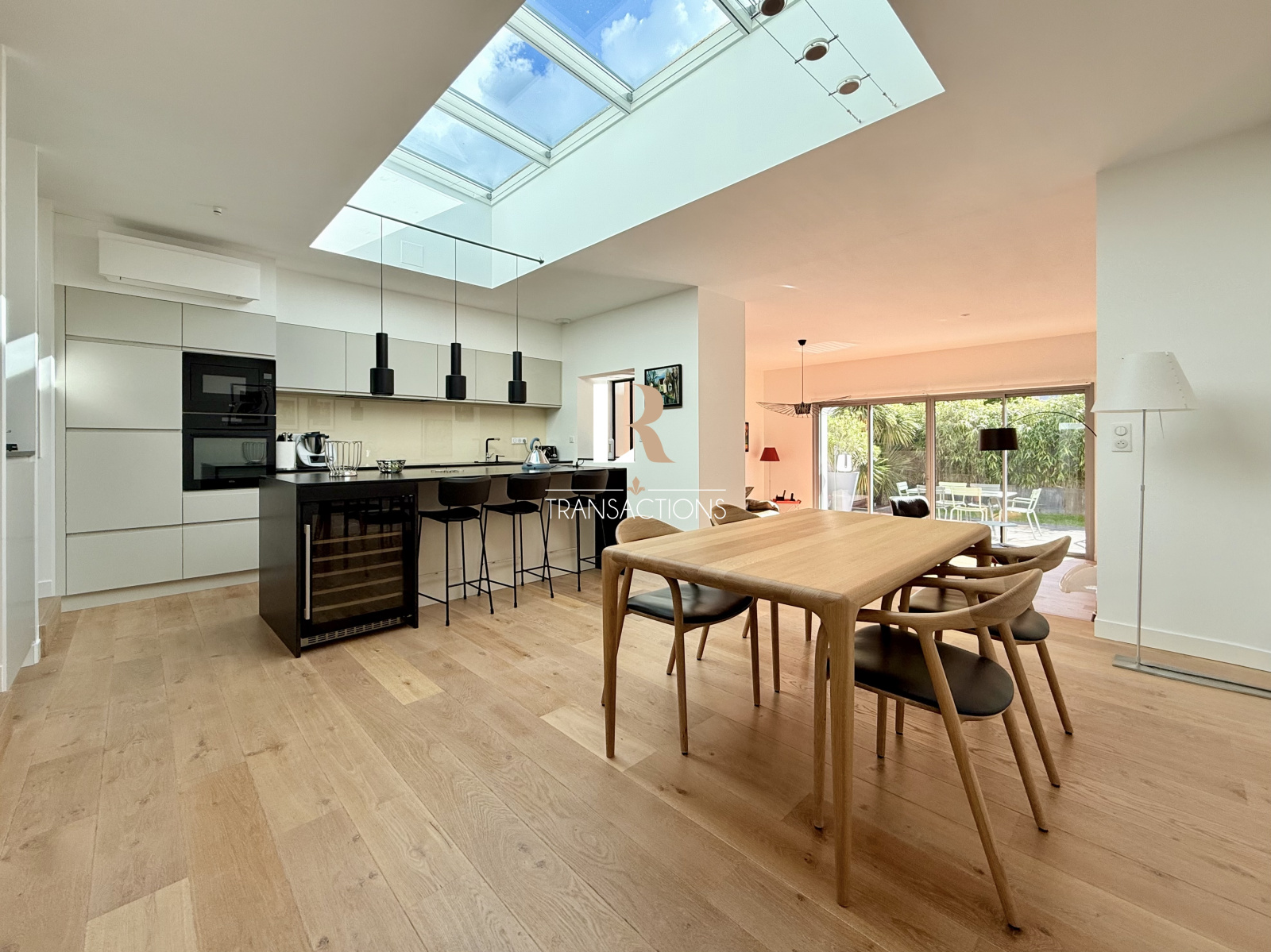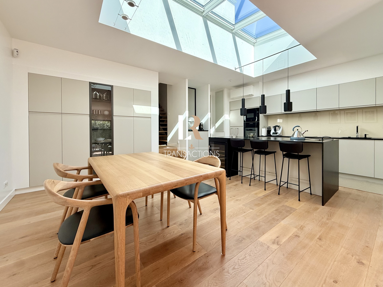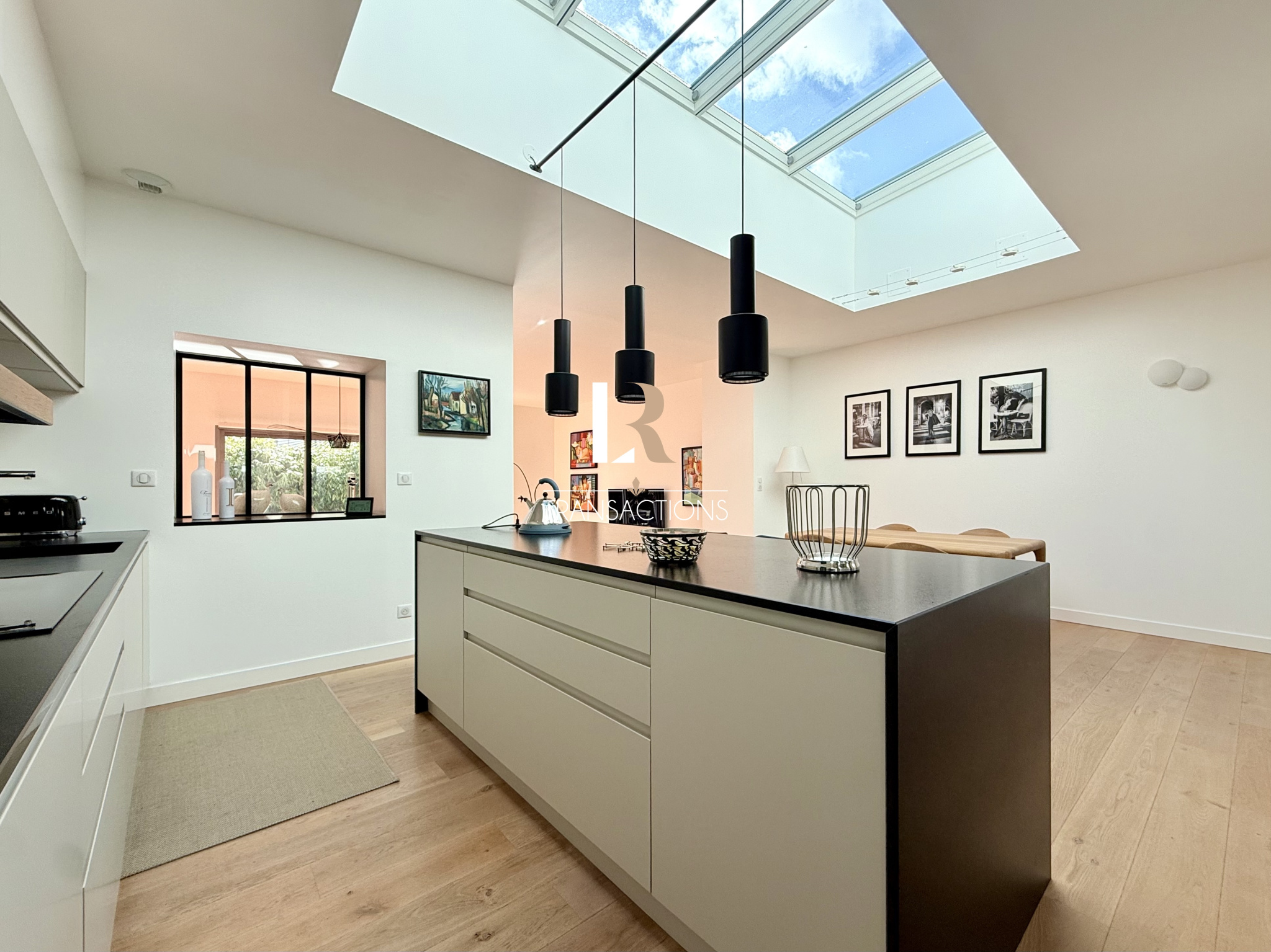 Une spacieuse cuisine avec îlot, entièrement equipée et aménagée, et son espace repas, profitent d'une magnifique lumière naturelle grâce à une verrière centrale. Elle profite d'un arrière-cuisine attenante, et très fonctionnelle.