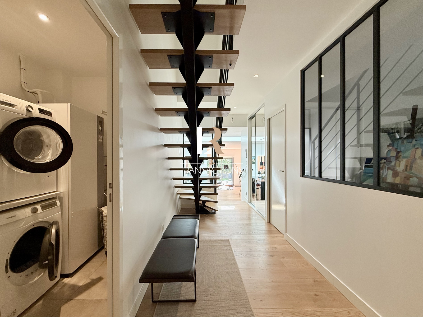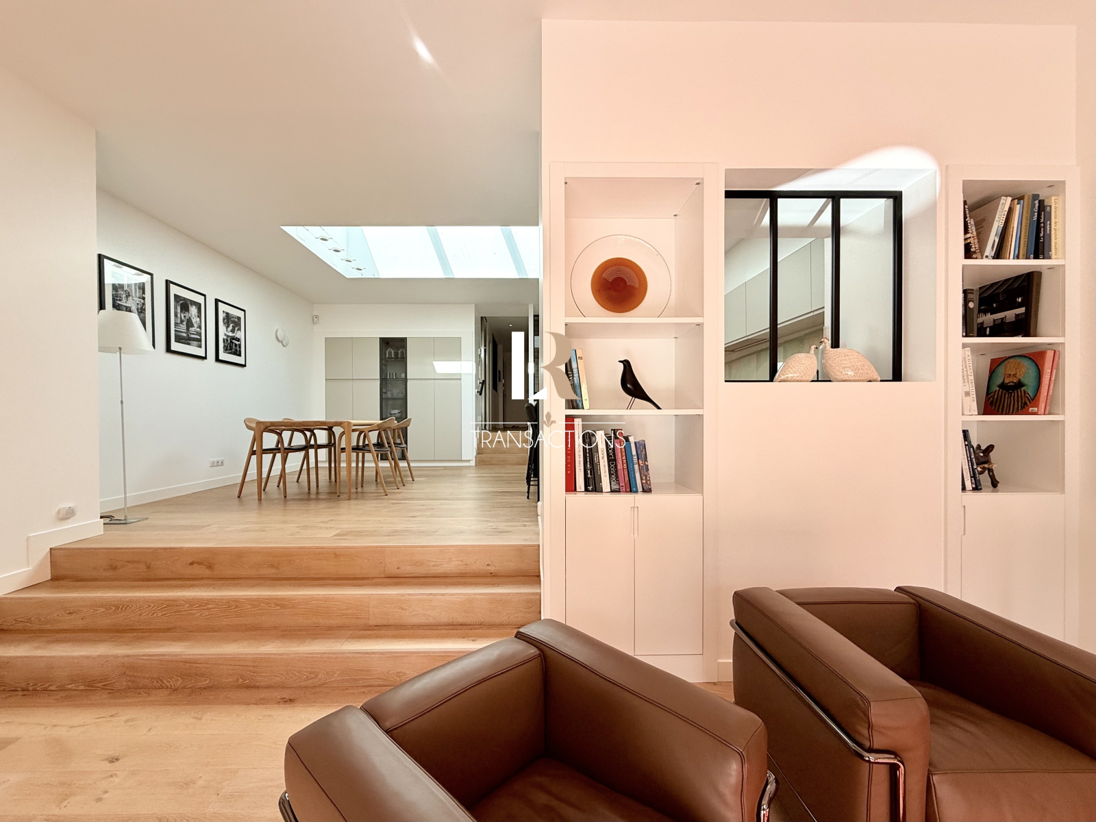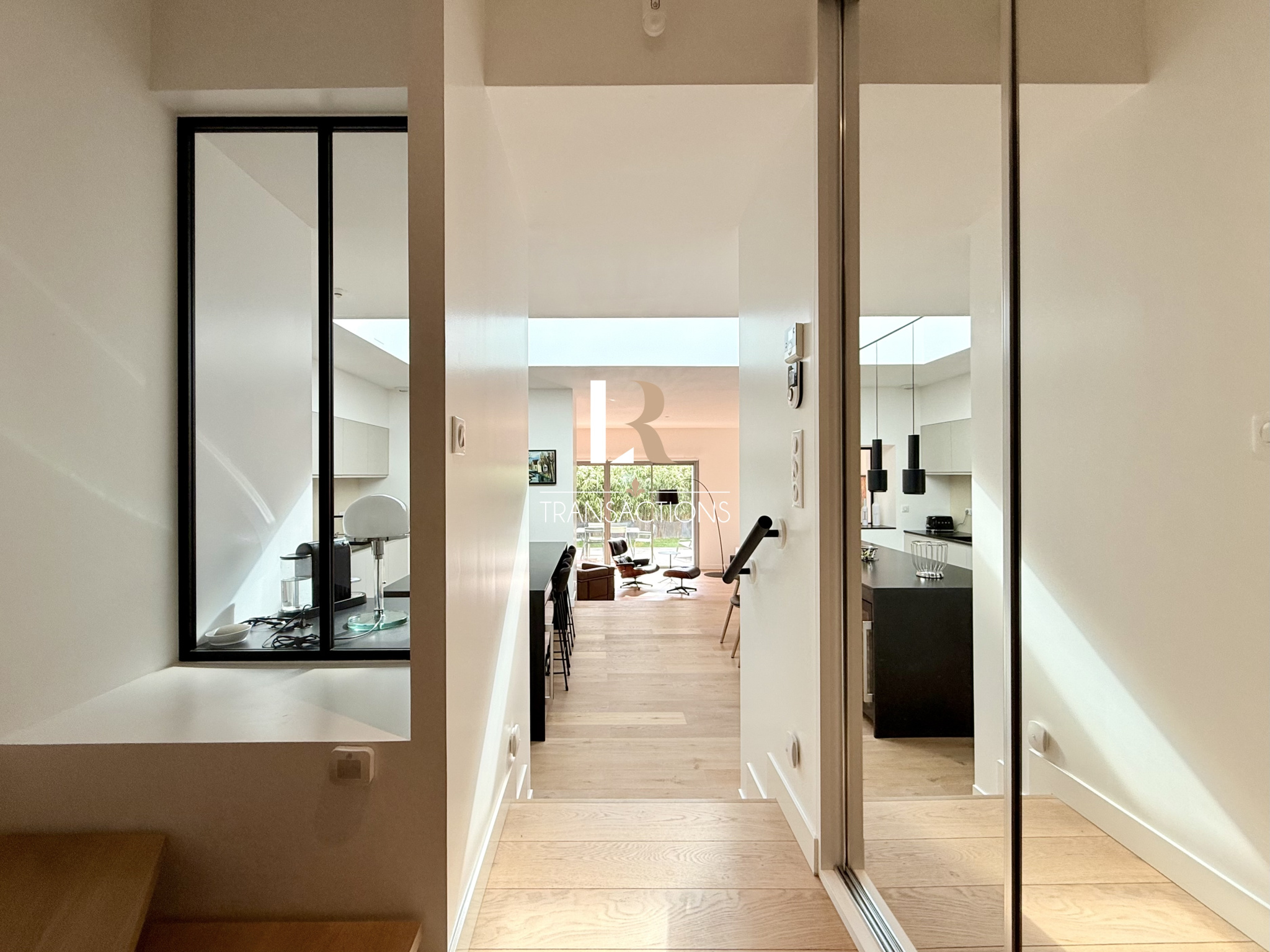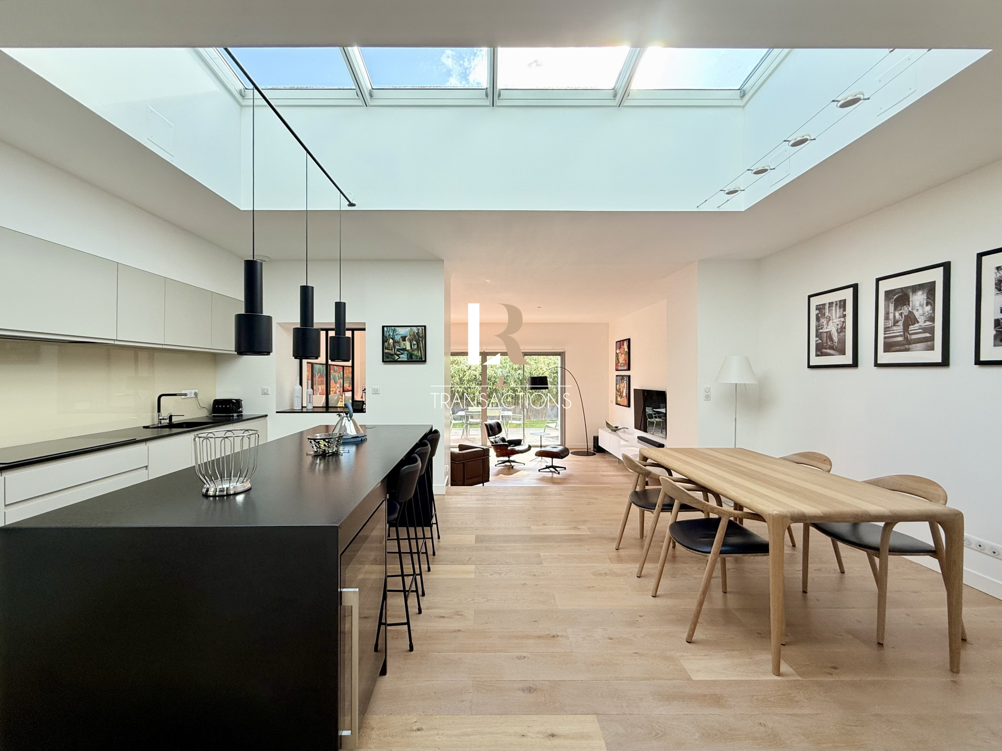 Une spacieuse cuisine avec îlot, entièrement equipée et aménagée, et son espace repas, profitent d'une magnifique lumière naturelle grâce à une verrière centrale. Elle profite d'un arrière-cuisine attenante, et très fonctionnelle.