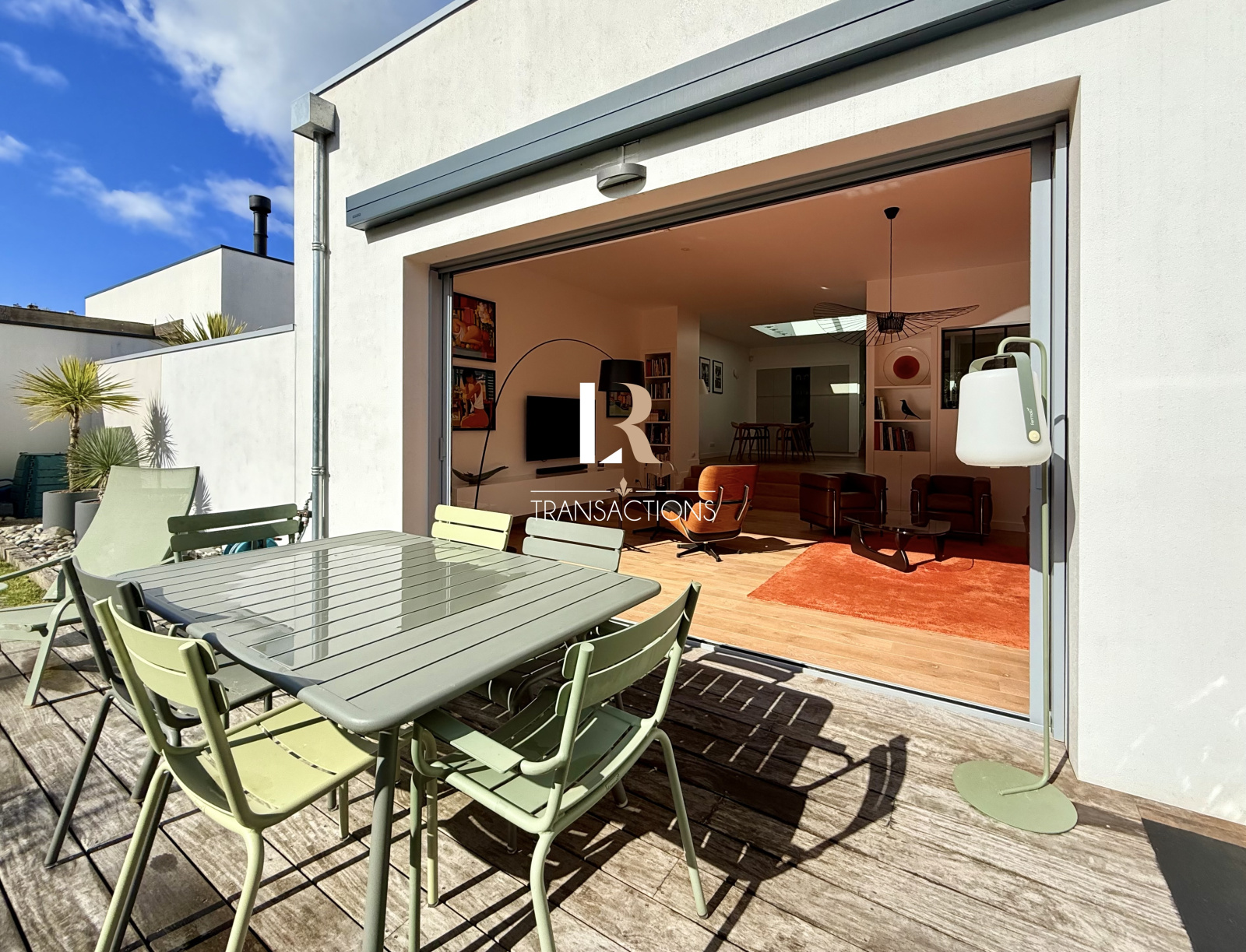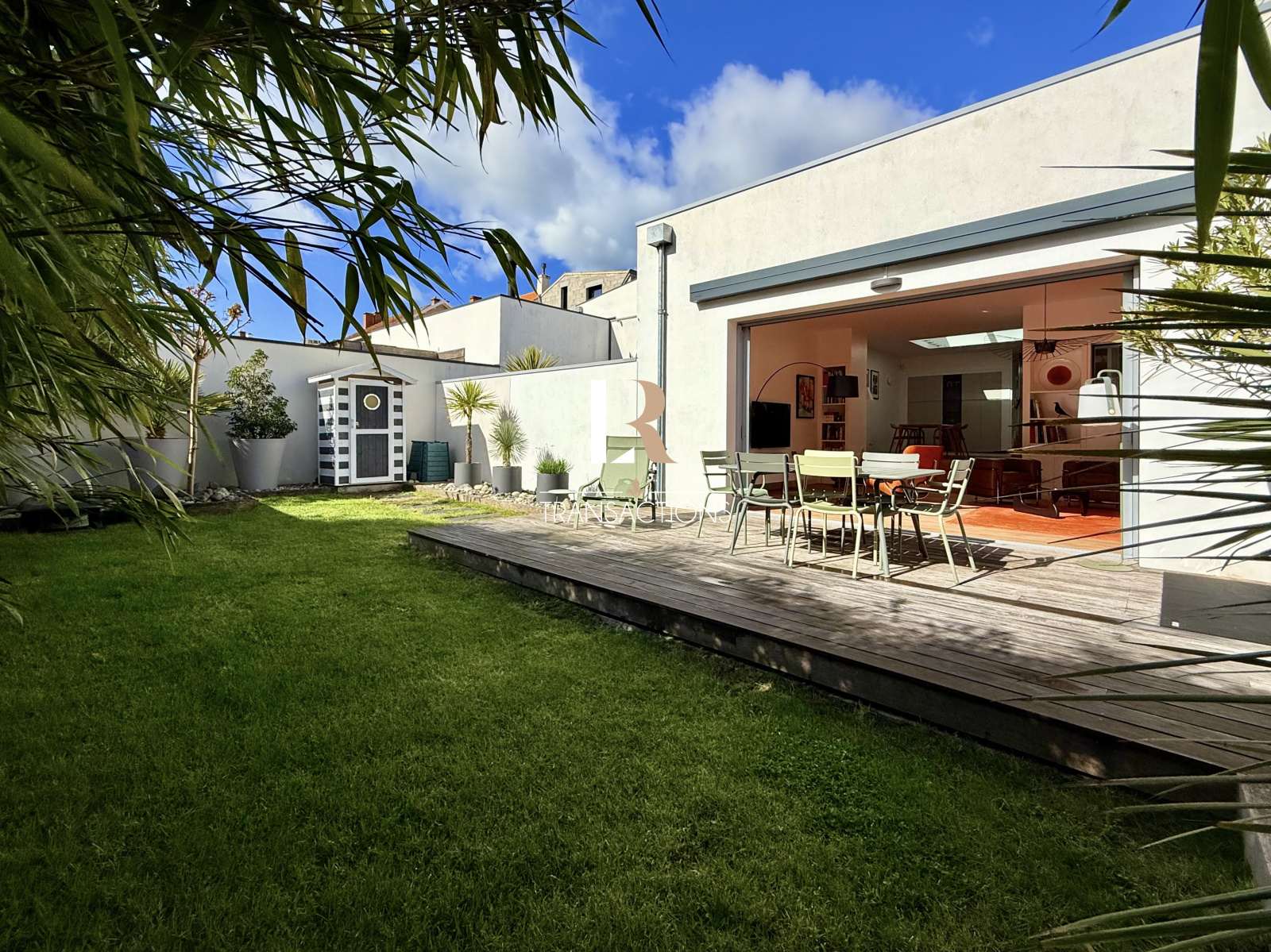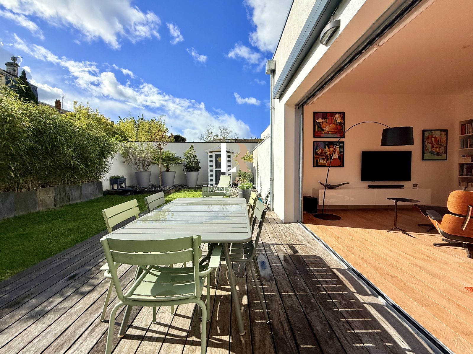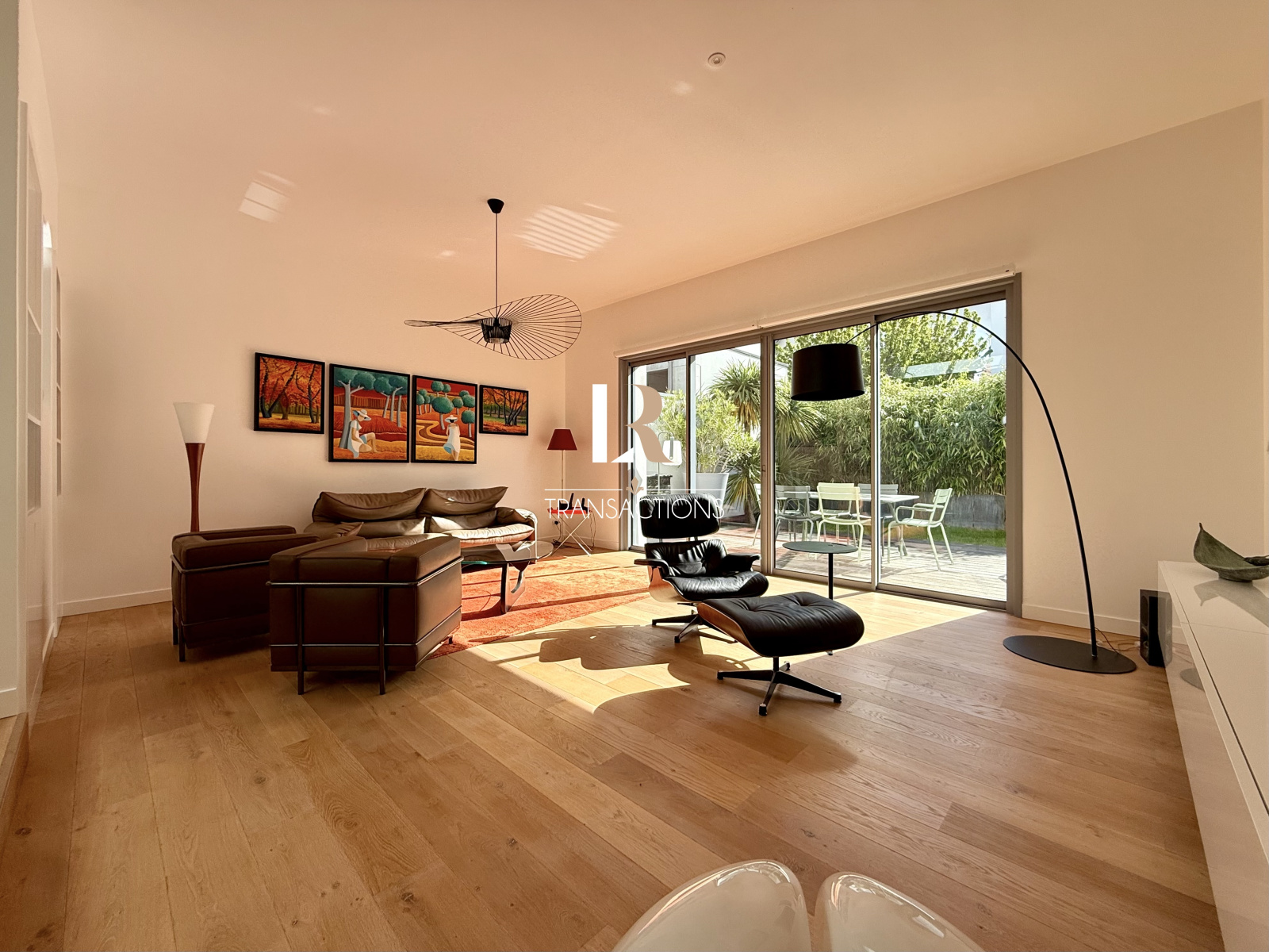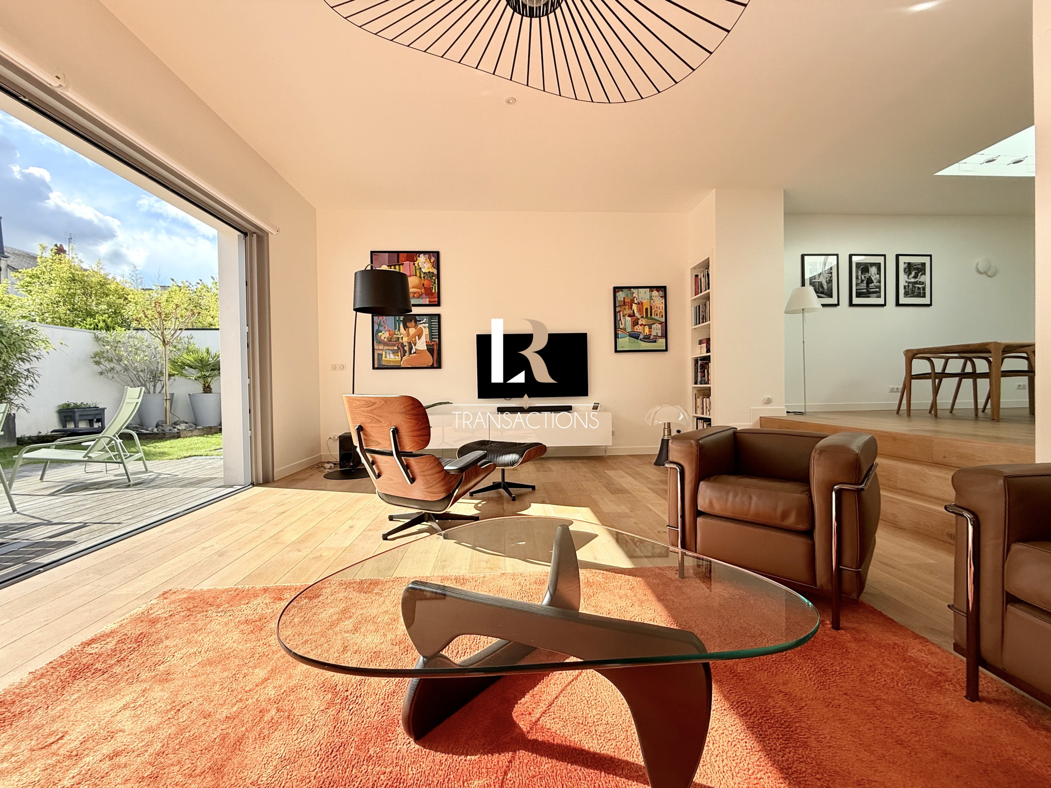Dans la continuité, vous accédez à un bel espace salon s'ouvrant sur le charmant extérieur par des baies à galandages.
