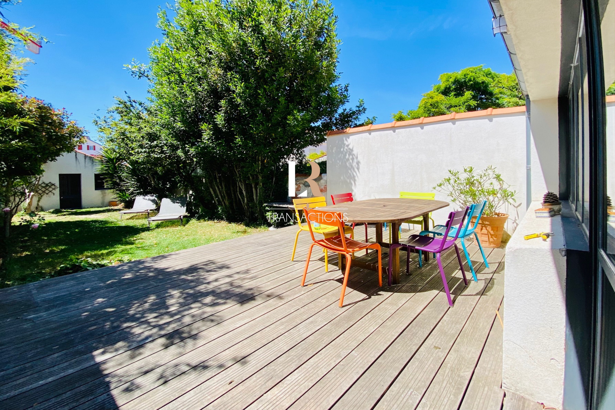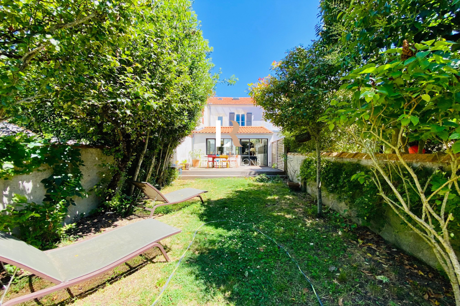 A l’extérieur, un beau jardin de ville exposé Ouest avec terrasse donne accès à un grand garage. Ce dernier est aussi accessible par la rue située à l’arrière de la maison.