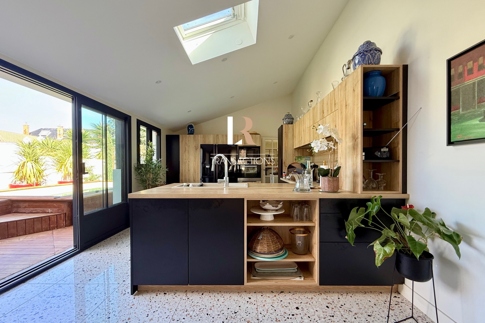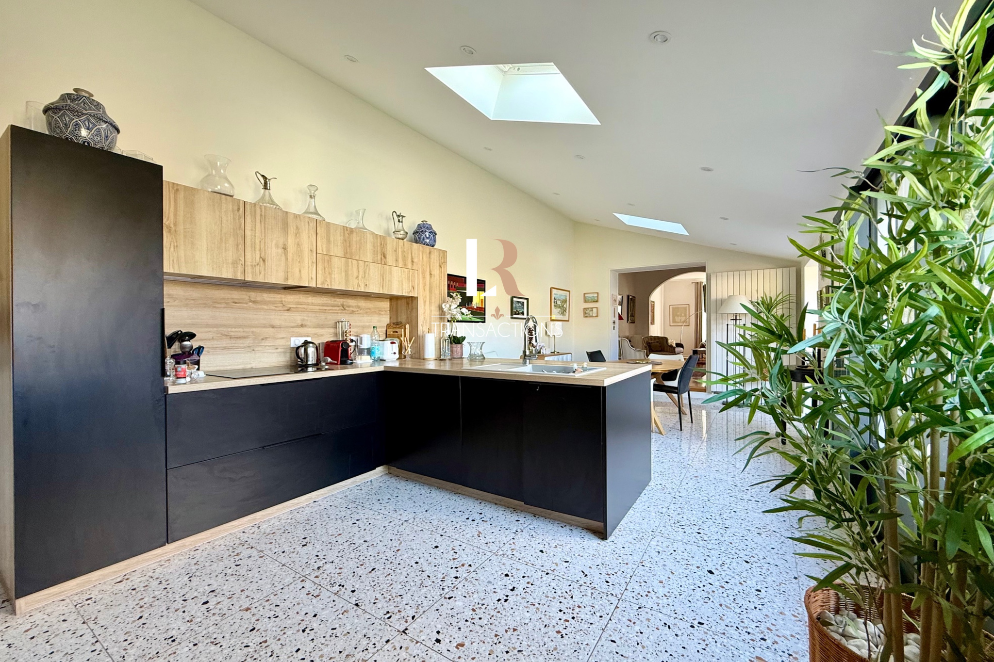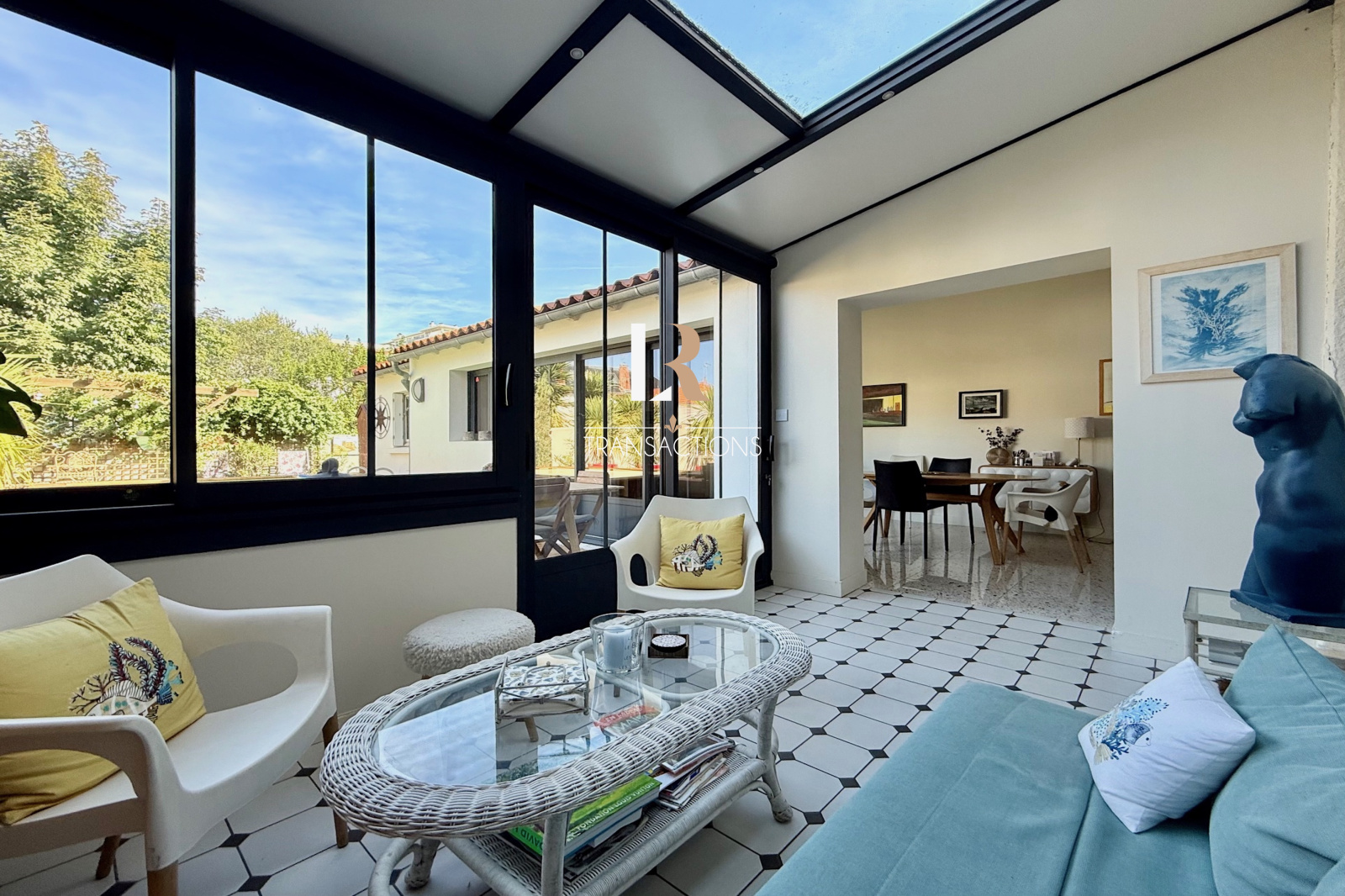 Une entrée centrale dessert sur sa droite un double salon très lumineux avec une belle hauteur sous plafond. Dans sa continuité, une vaste extension en L avec véranda, dispose d'une cuisine aménagée, et d’un bel espace repas. Vous profiterez d'une jolie perspective sur le jardin avec piscine grâce aux baies ateliers.