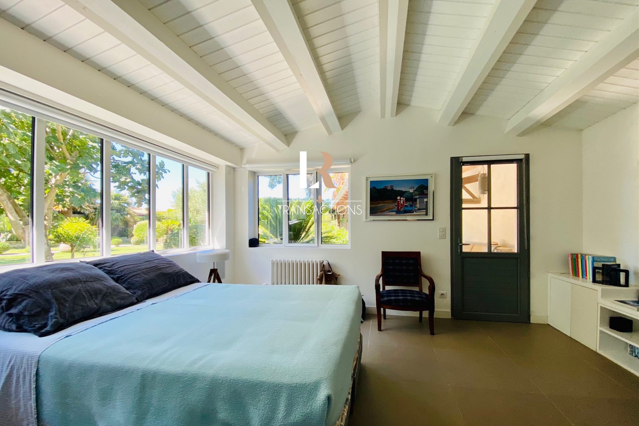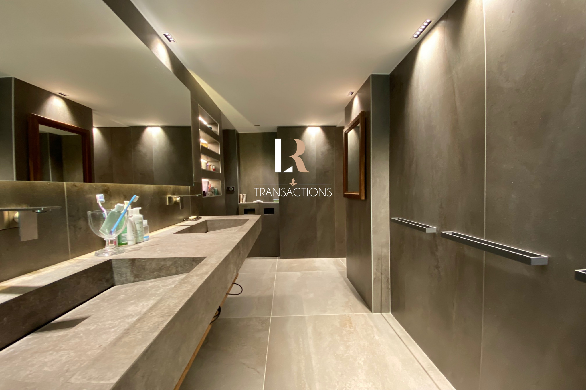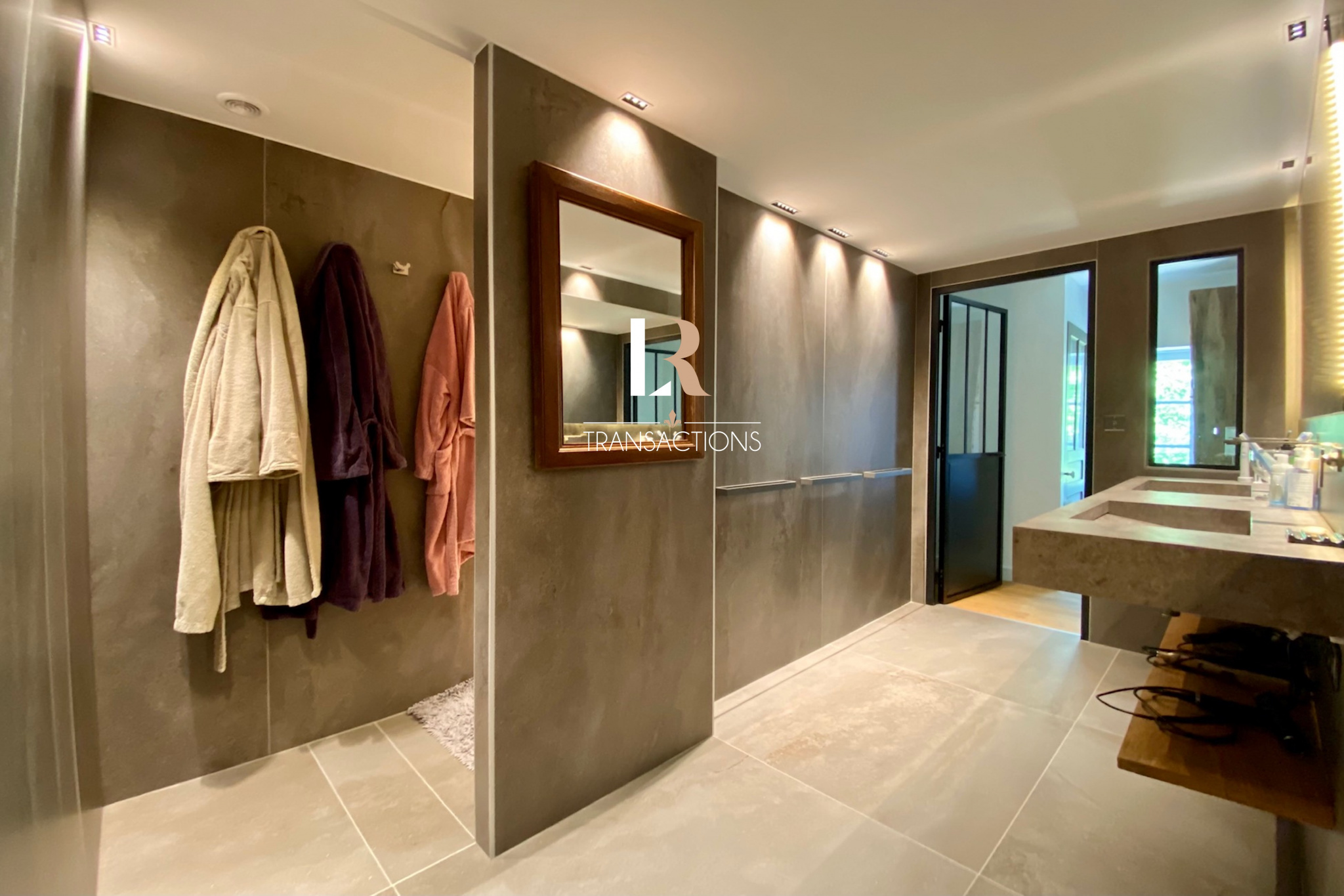 par une grande entrée traversante et lumineuse. Sur votre droite un premier salon avec cheminée donne accès à une grande suite parentale, et sa superbe vue sur le jardin et la jolie piscine en marbre noir.