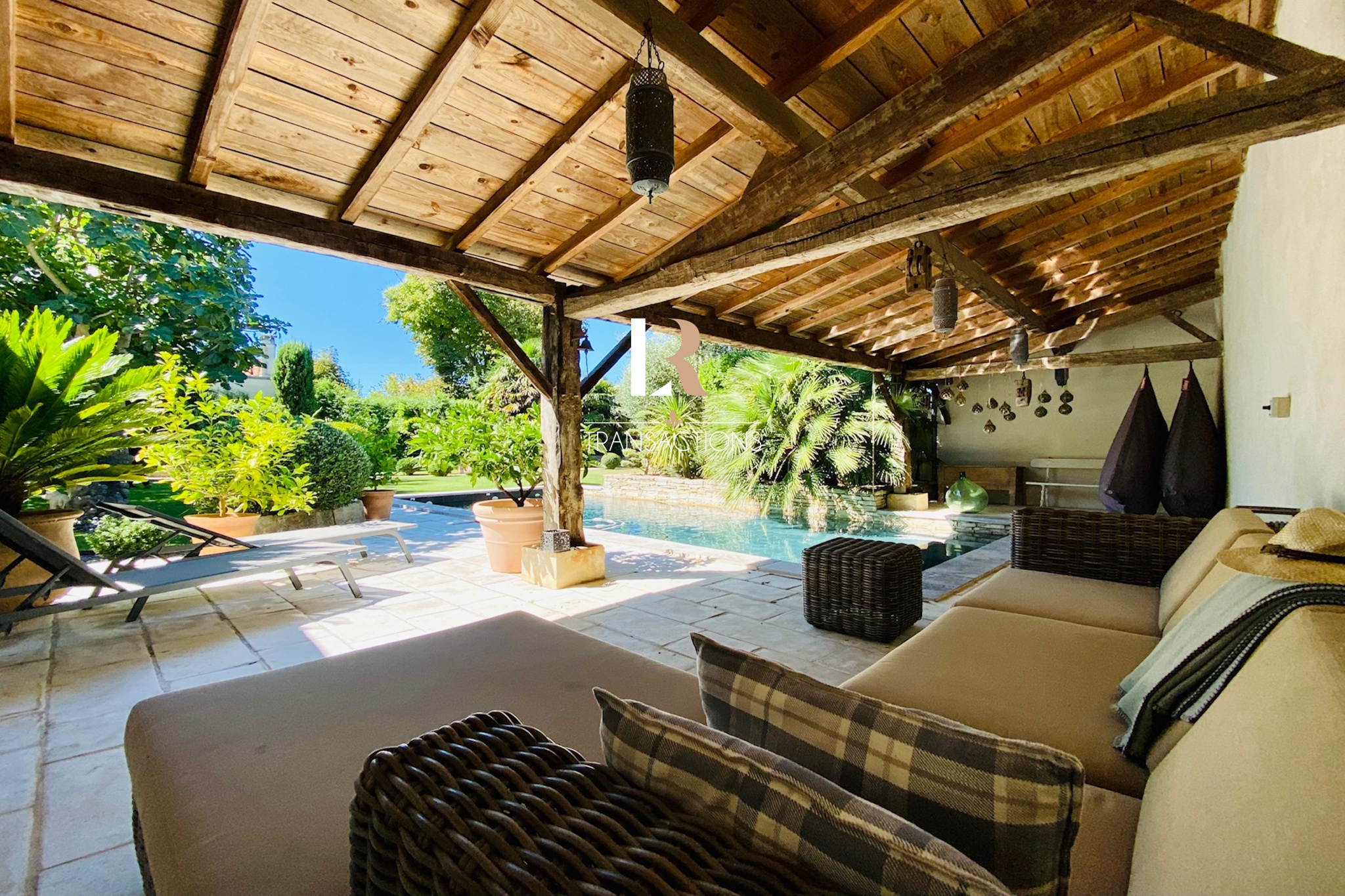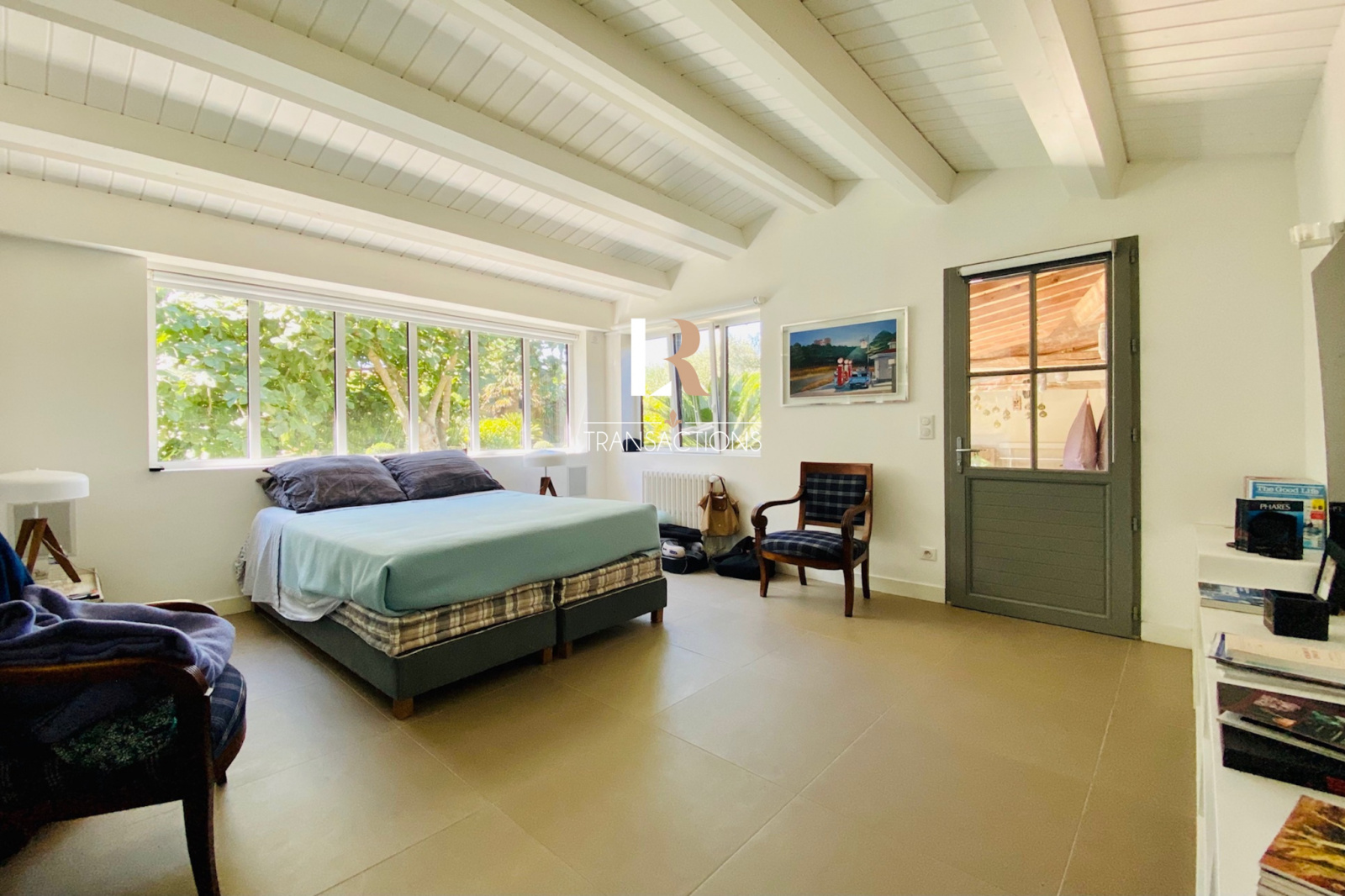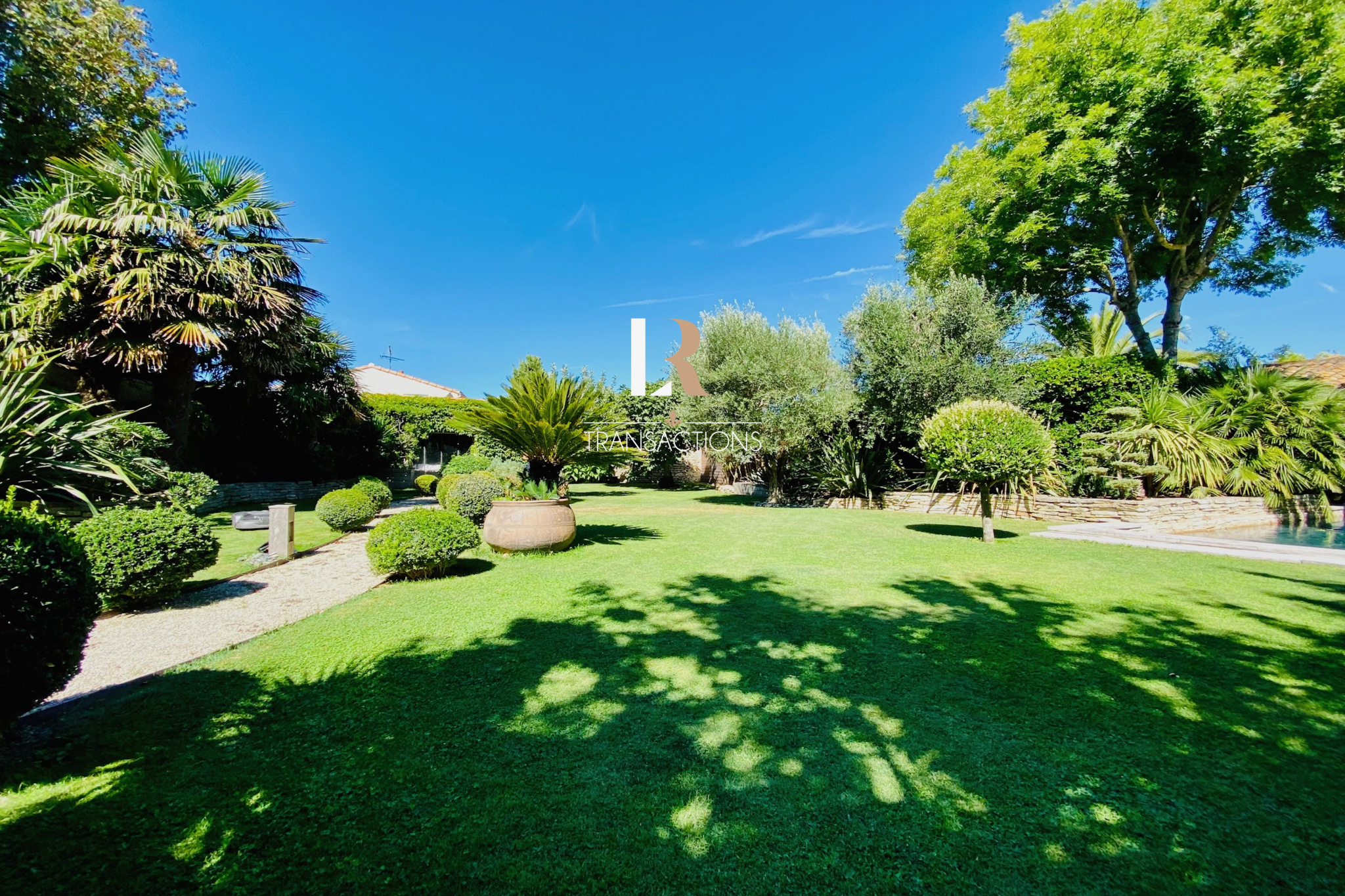par une grande entrée traversante et lumineuse. Sur votre droite un premier salon avec cheminée donne accès à une grande suite parentale, et sa superbe vue sur le jardin et la jolie piscine en marbre noir.