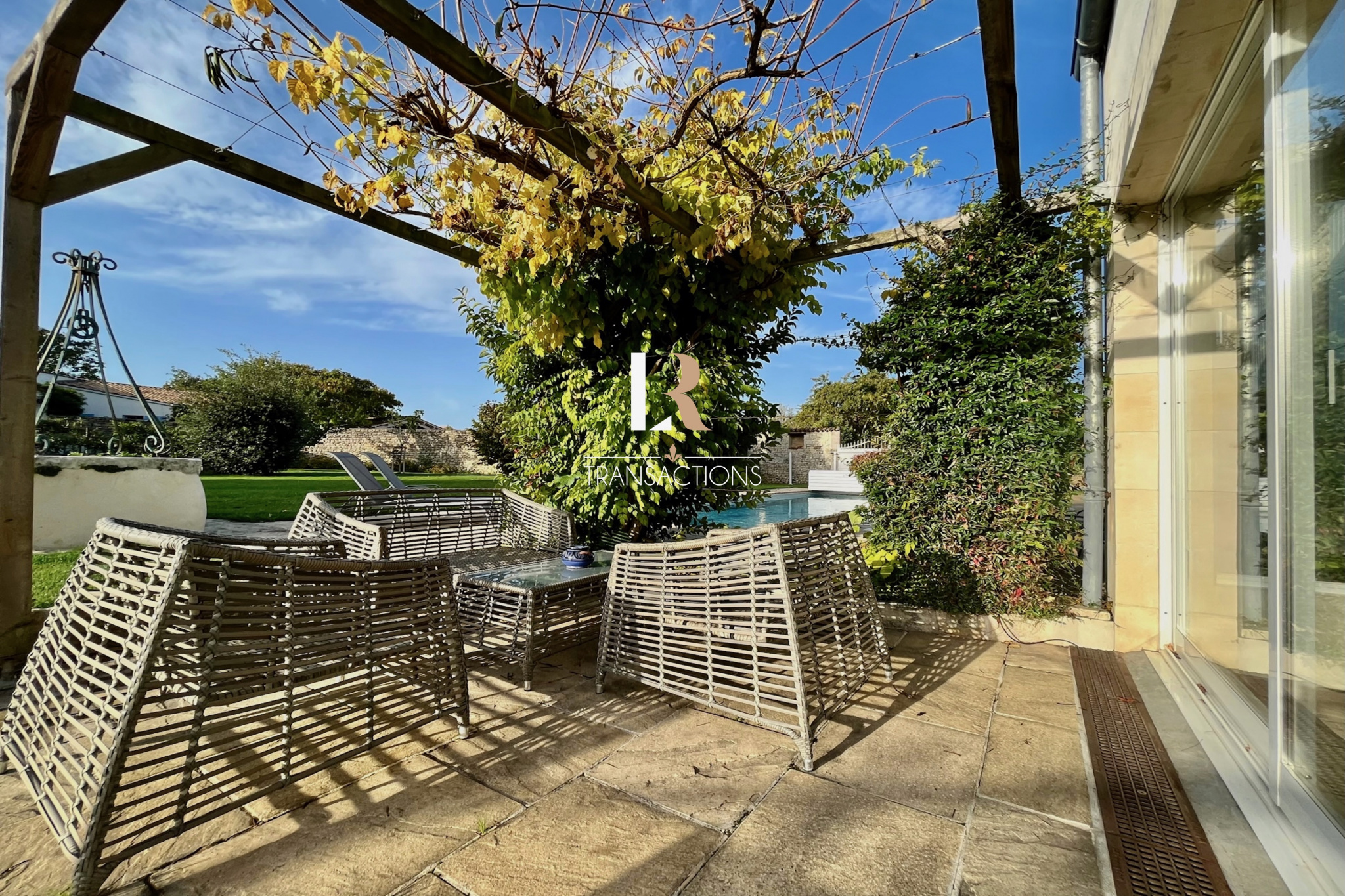 Côté extérieur, une magnifique parcelle avec piscine exposée plein Sud, dispose de plusieurs dépendances. Une annexe amenagée actuellement en salle de sport, ainsi qu’une petite maison d’amis en pierre à finir d’aménager.