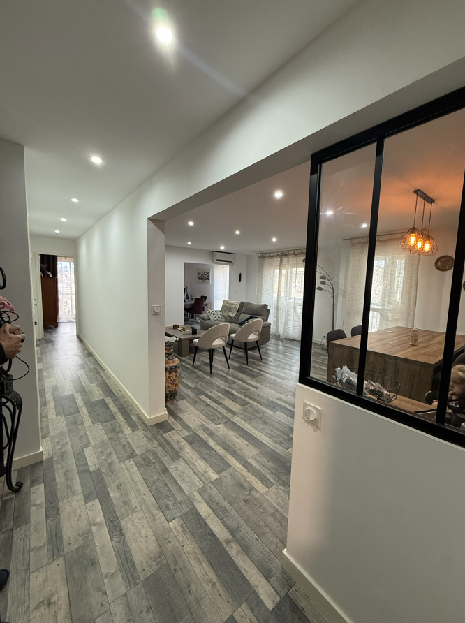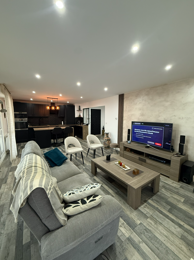 Grand salon lumineux avec cuisine ouverte, moderne et fonctionnelle