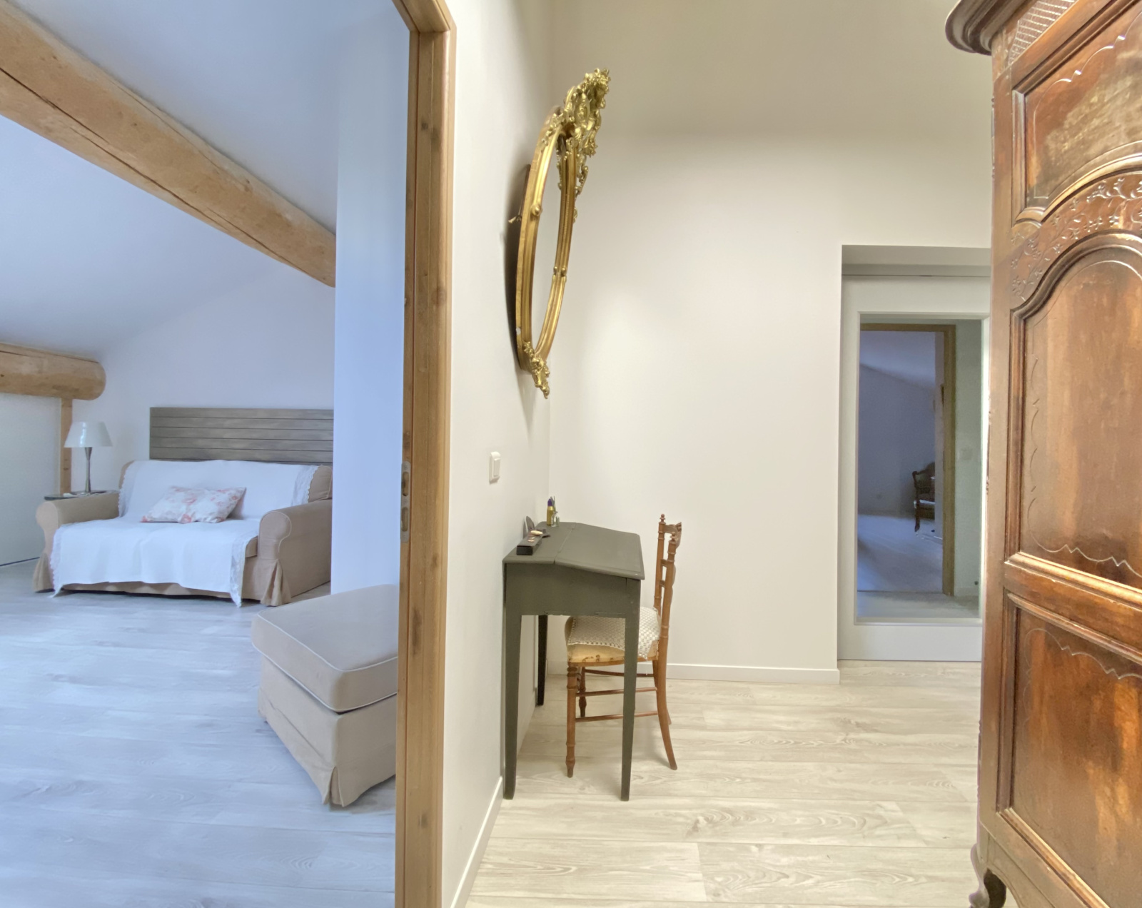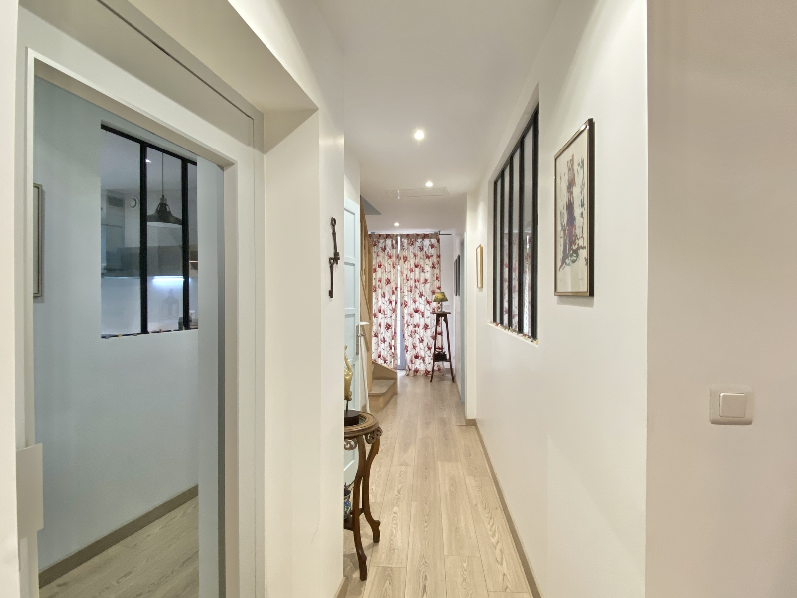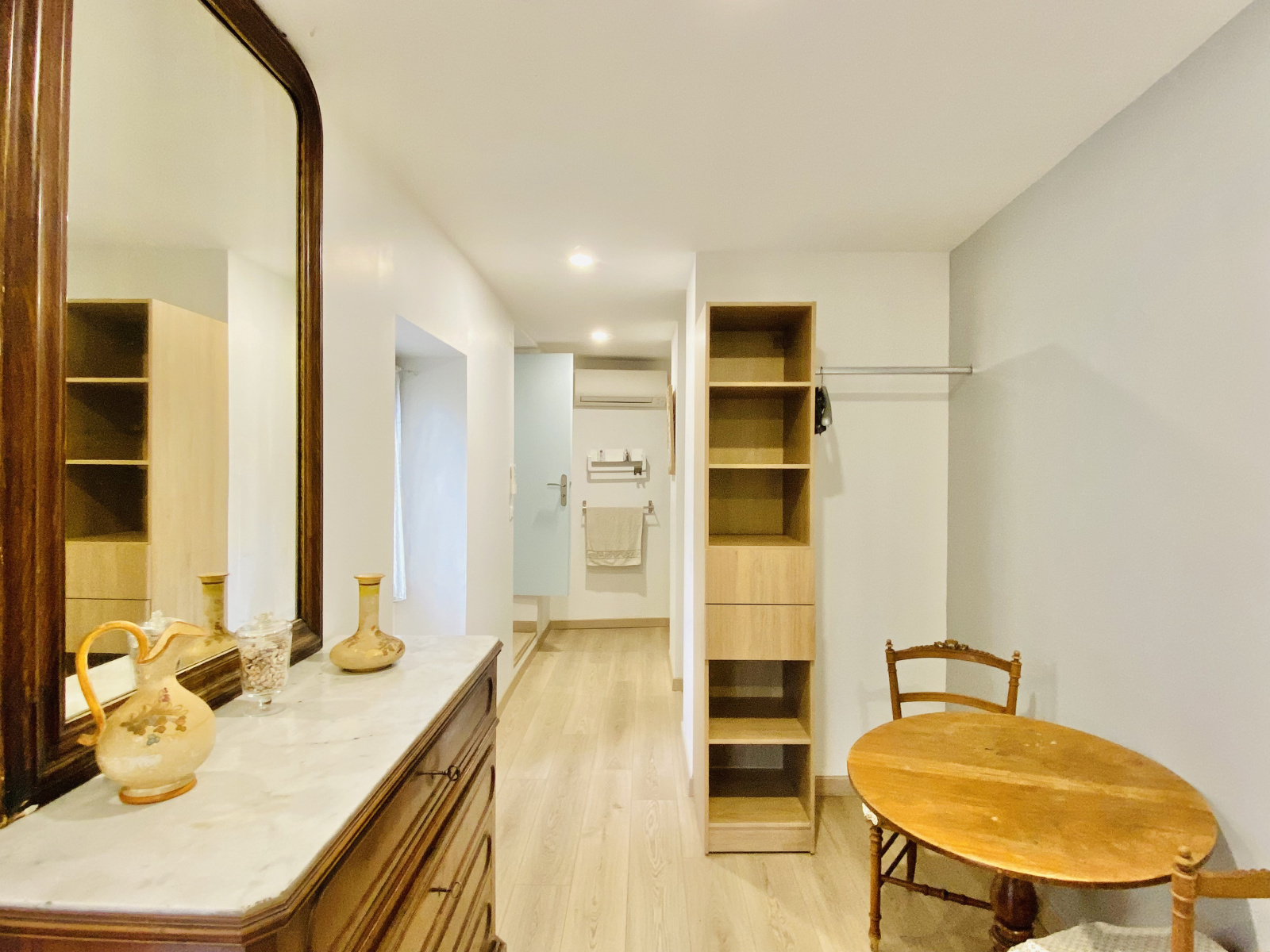 Un couloir élégant mène à une chambre intime, dotée d'une salle d'eau et d'une terrasse privative, ainsi qu'à un bureau, parfait pour un espace de travail inspirant.