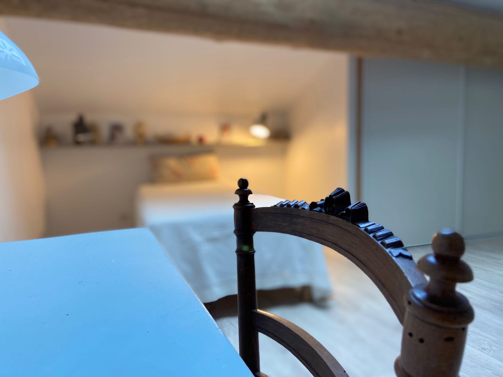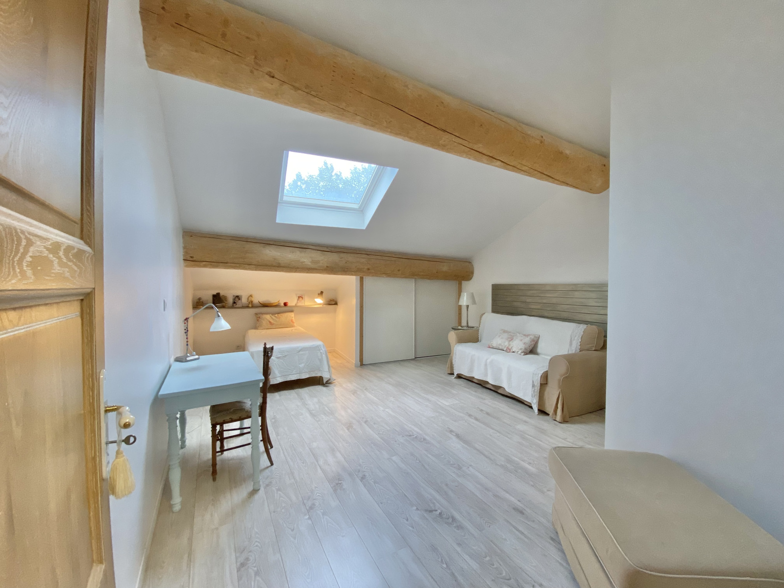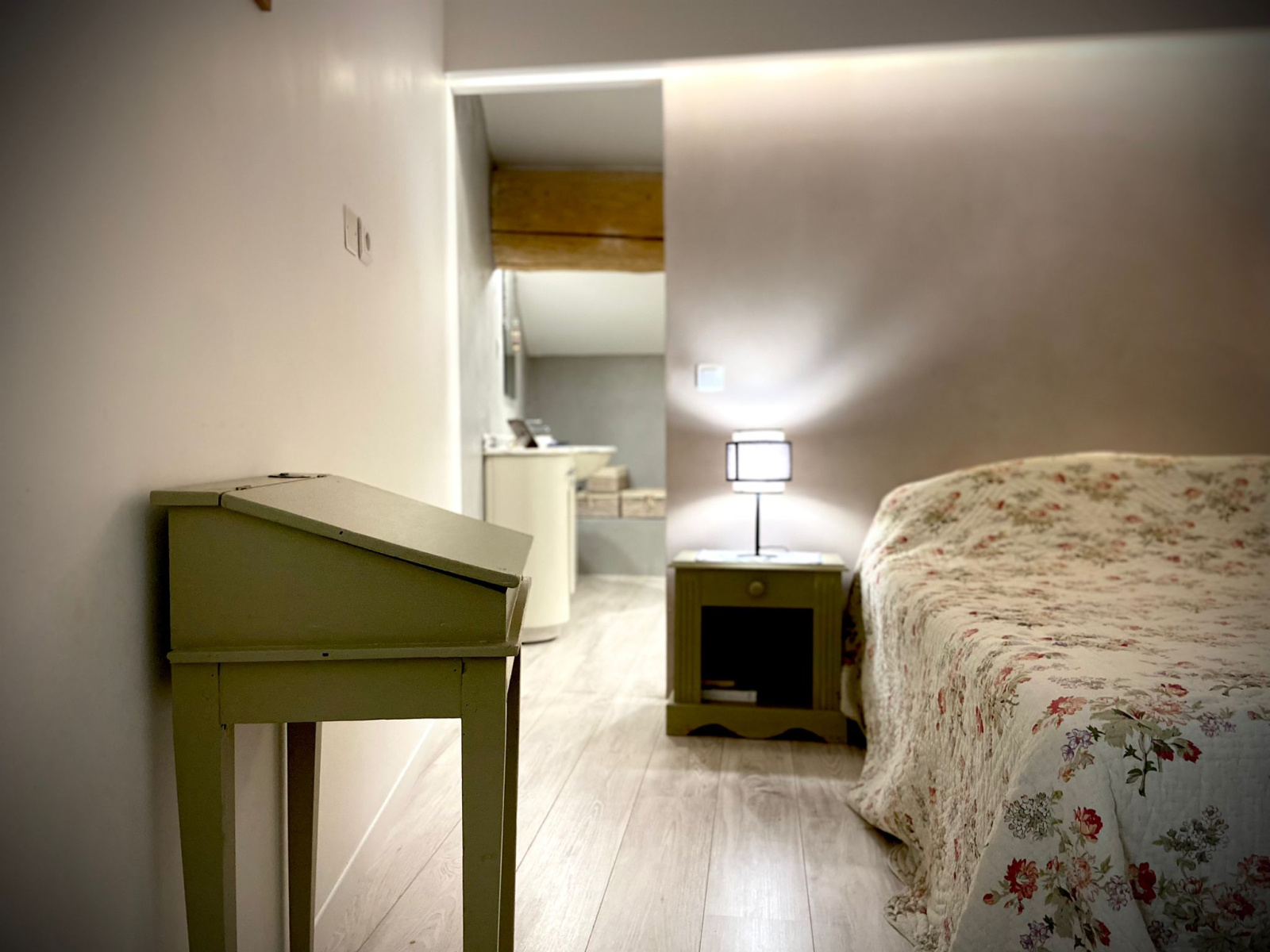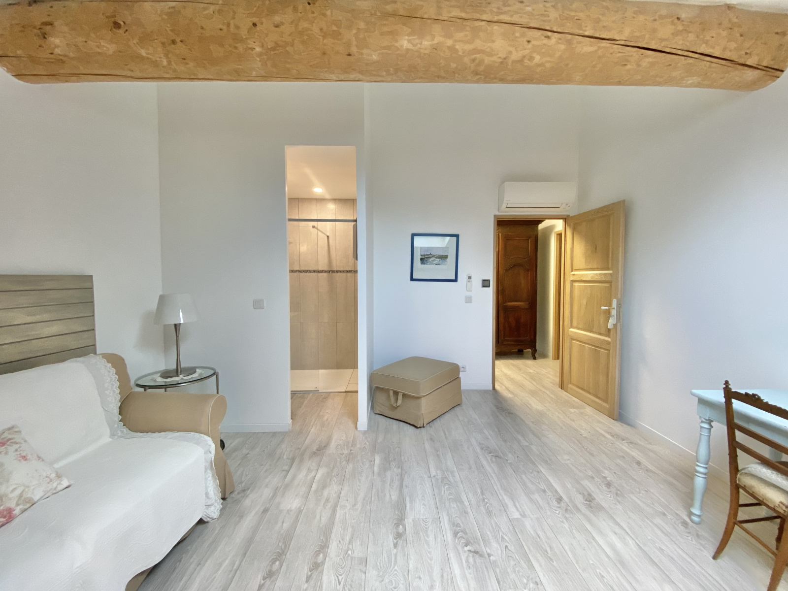 Un couloir élégant mène à une chambre intime, dotée d'une salle d'eau et d'une terrasse privative, ainsi qu'à un bureau, parfait pour un espace de travail inspirant.