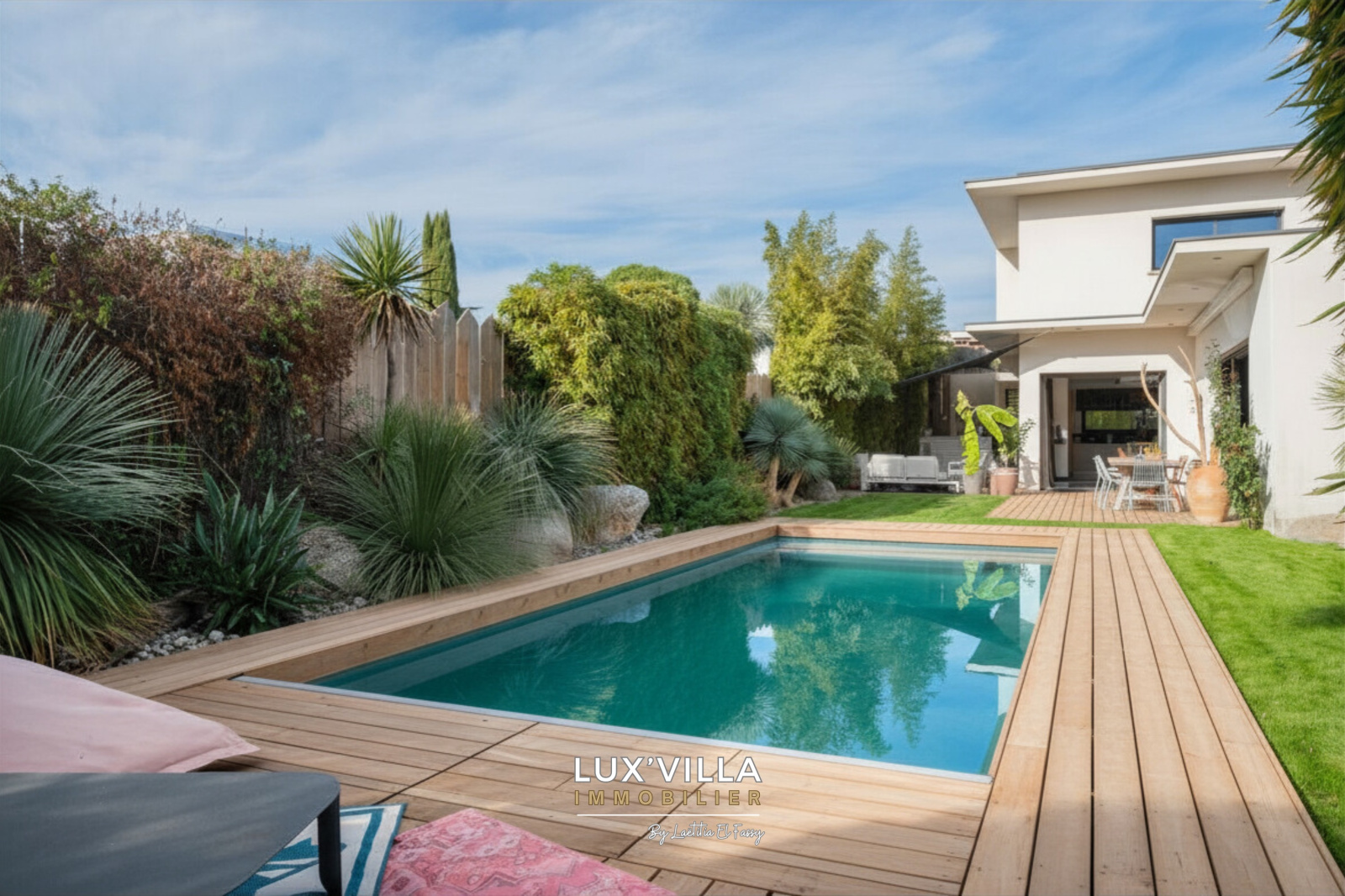 Le terrain plat de 1000 m², parfaitement intimiste, accueille une piscine chauffée au sel avec membrane armée et volet immergé. Un garage fermé et la possibilité de garer 3 voiture sur la propriété.