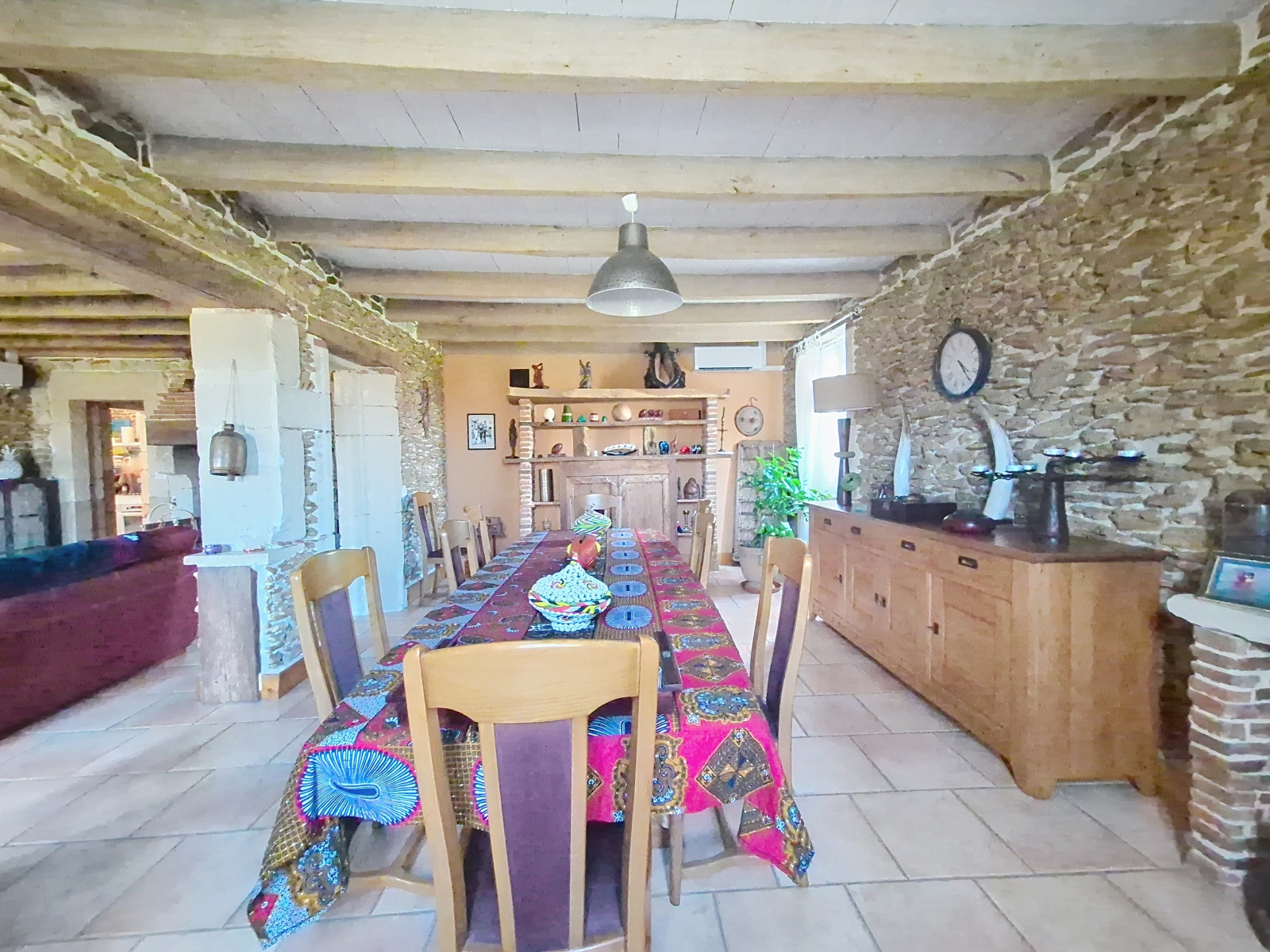 La maison, élevée sur deux niveaux, offre de beaux volumes avec une vaste pièce de vie d’environ 60 m², lumineuse et chaleureuse, idéale pour recevoir.