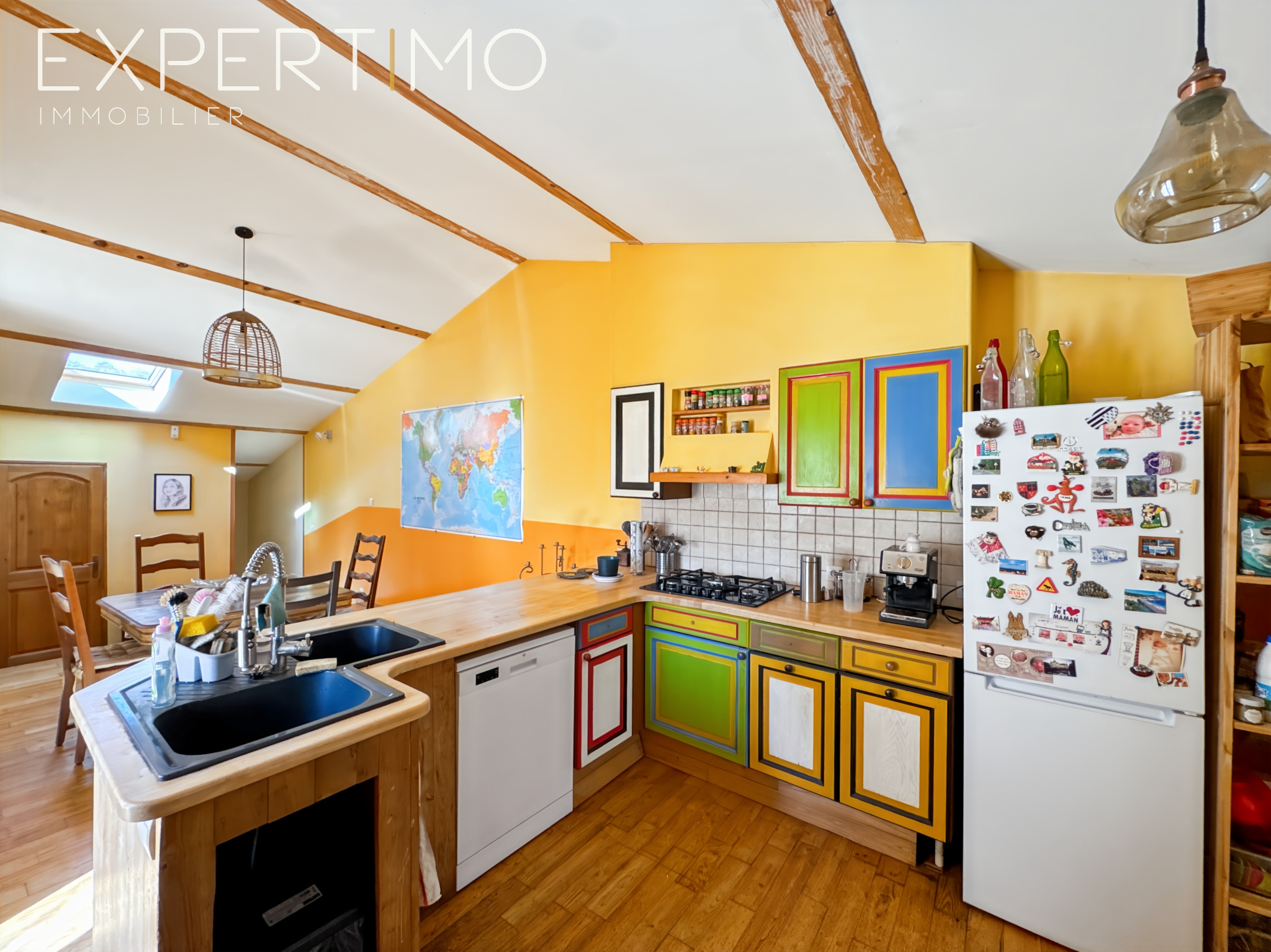 Au premier étage : Cuisine ouverte, salle à manger, salle de bain, wc, grande chambre avec dressing, et une belle terrasse accessible directement depuis la cuisine et la chambre