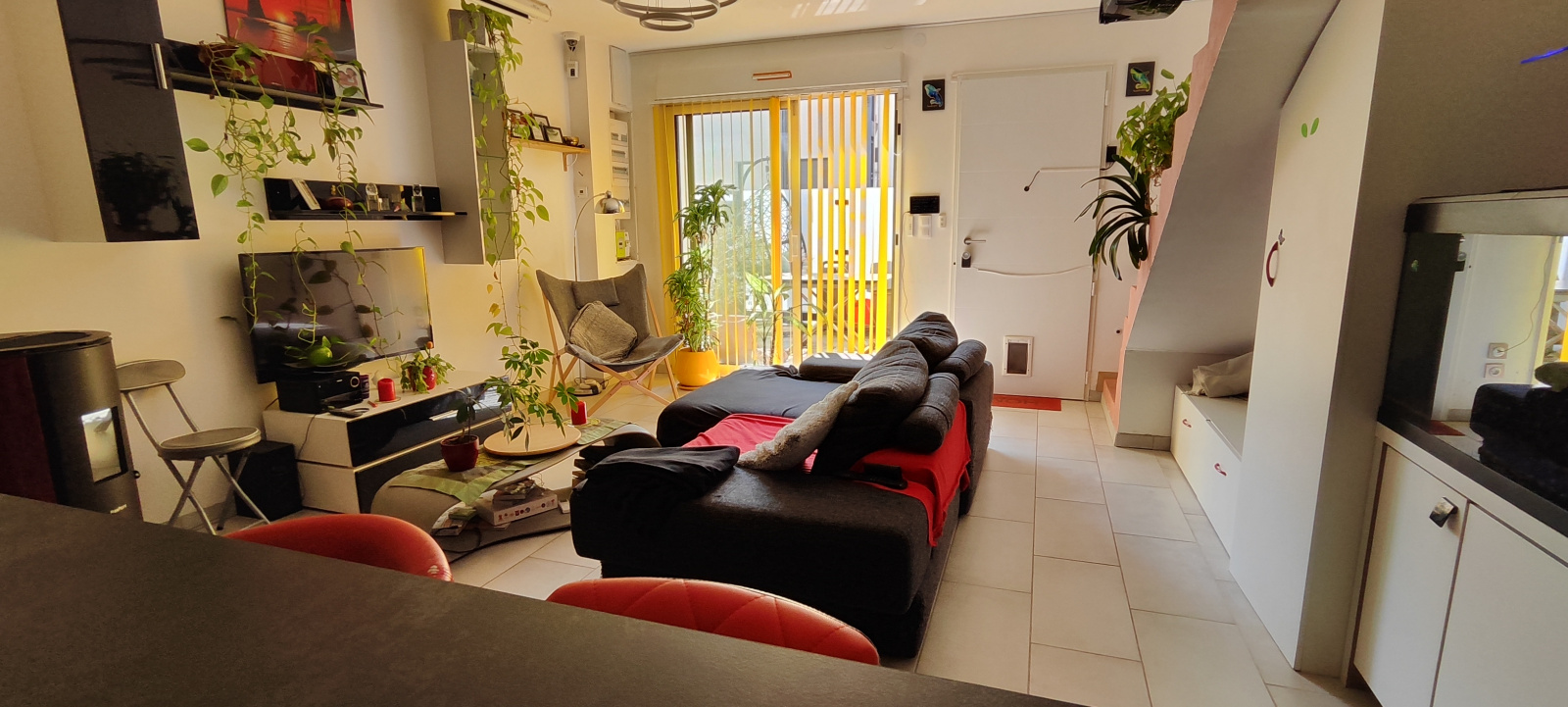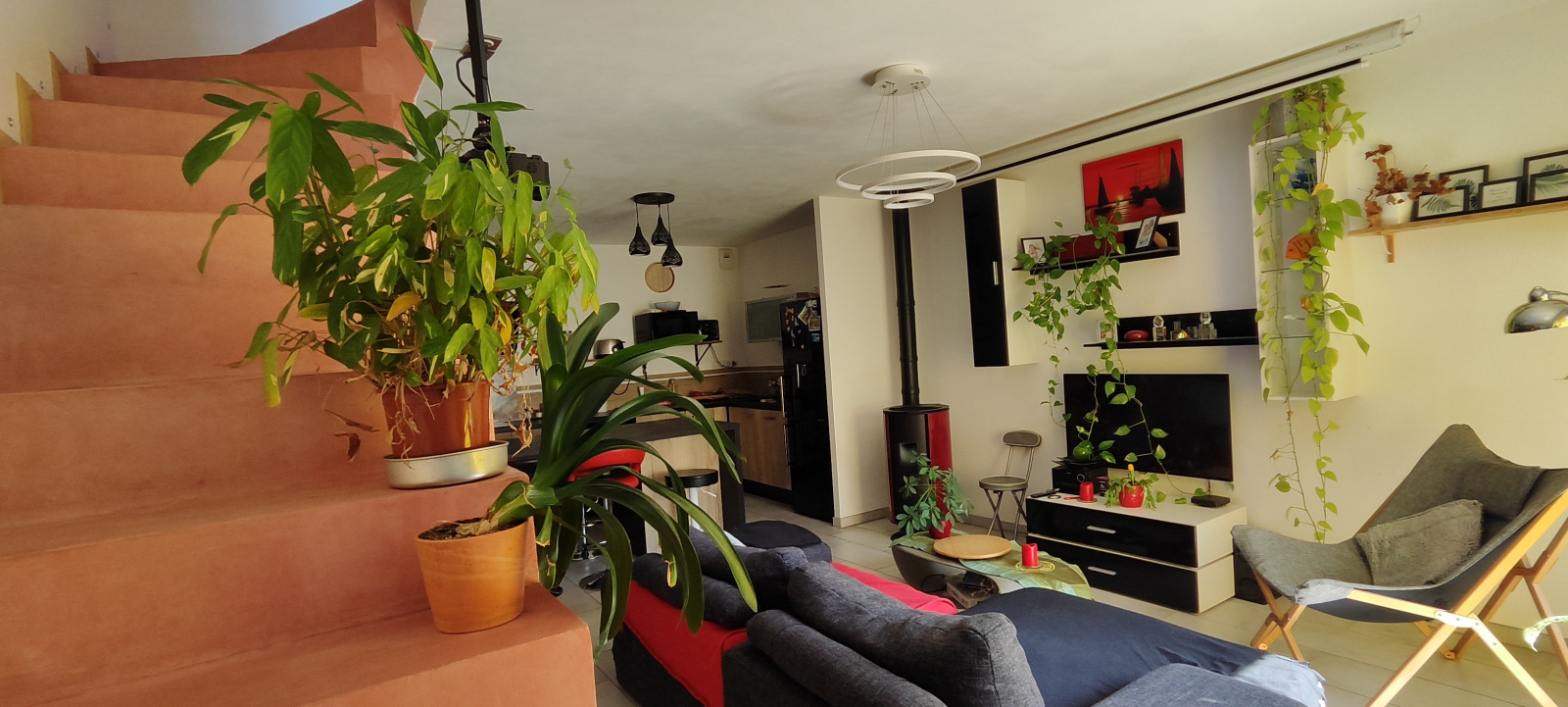 L’intérieur, soigneusement agencé, offre une belle pièce de vie lumineuse avec cuisine aménagée, donnant directement sur la terrasse.