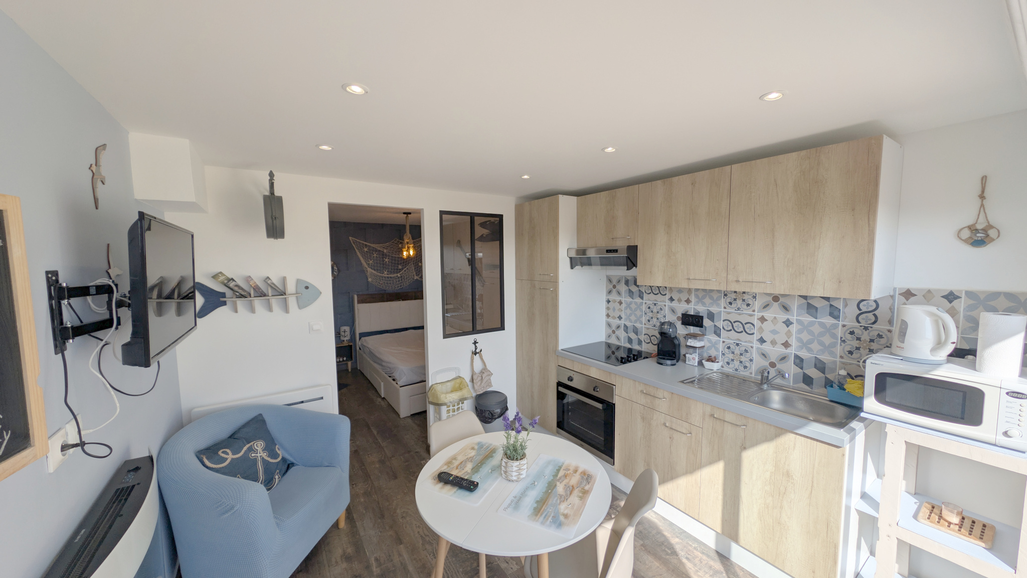 Une cuisine ouverte moderne et entièrement équipée, s'ouvrant directement sur une terrasse exposée ouest, offrant une vue panoramique imprenable sur la campagne environnante et la Baie de Somme. Imaginez-vous préparer vos repas tout en admirant des couchers de soleil spectaculaires !