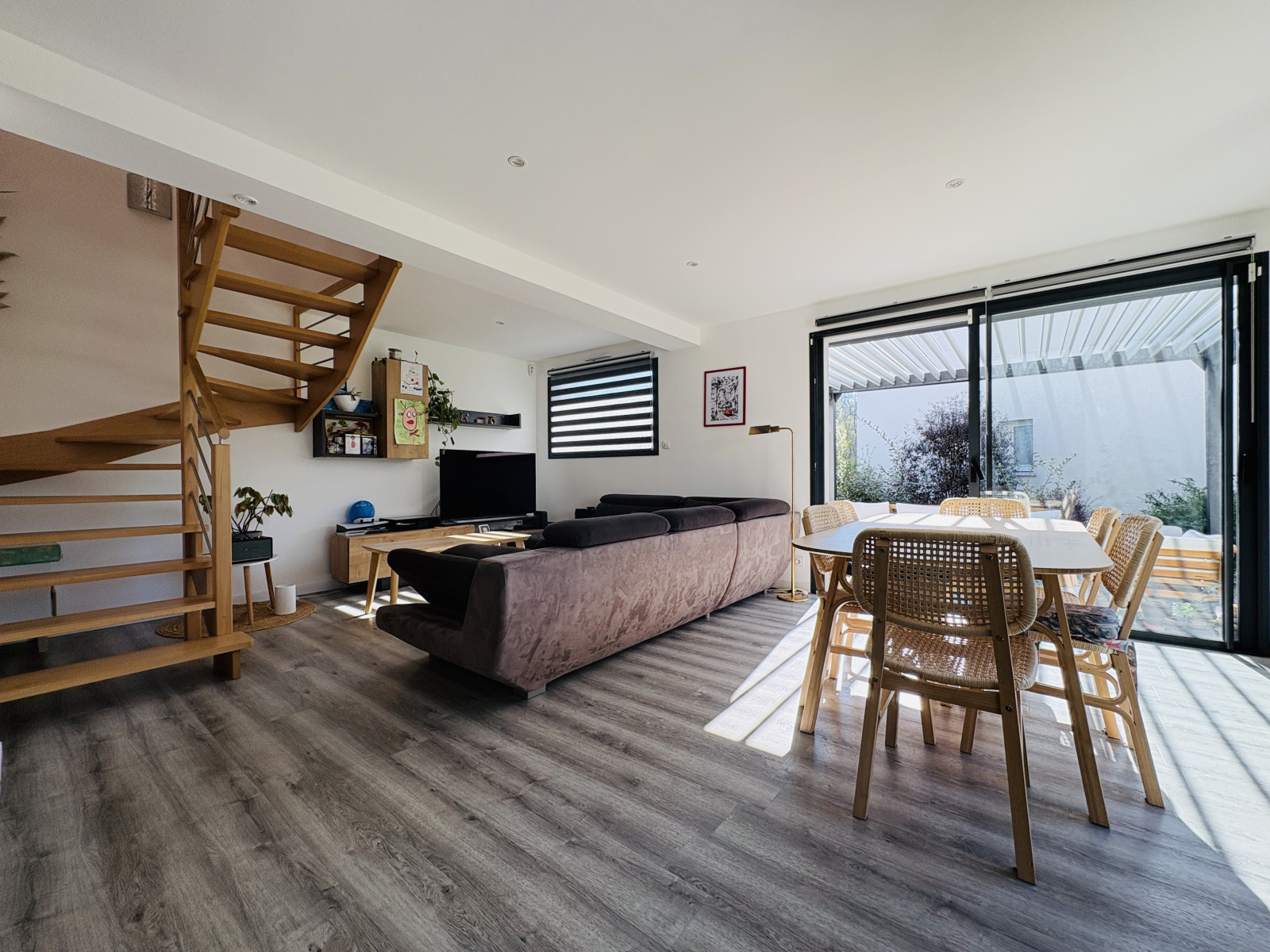 L’extérieur offre un jardin d’environ 520 m² et une belle terrasse avec pergola bioclimatique, idéale pour profiter pleinement des beaux jours.