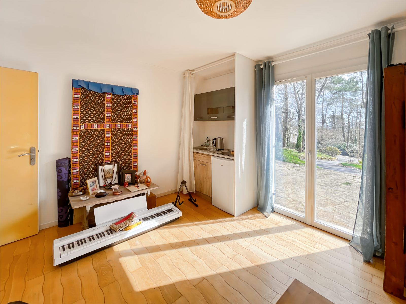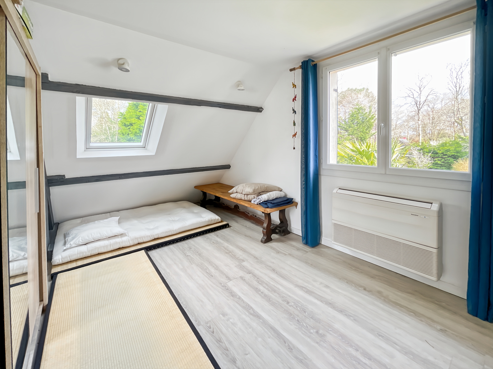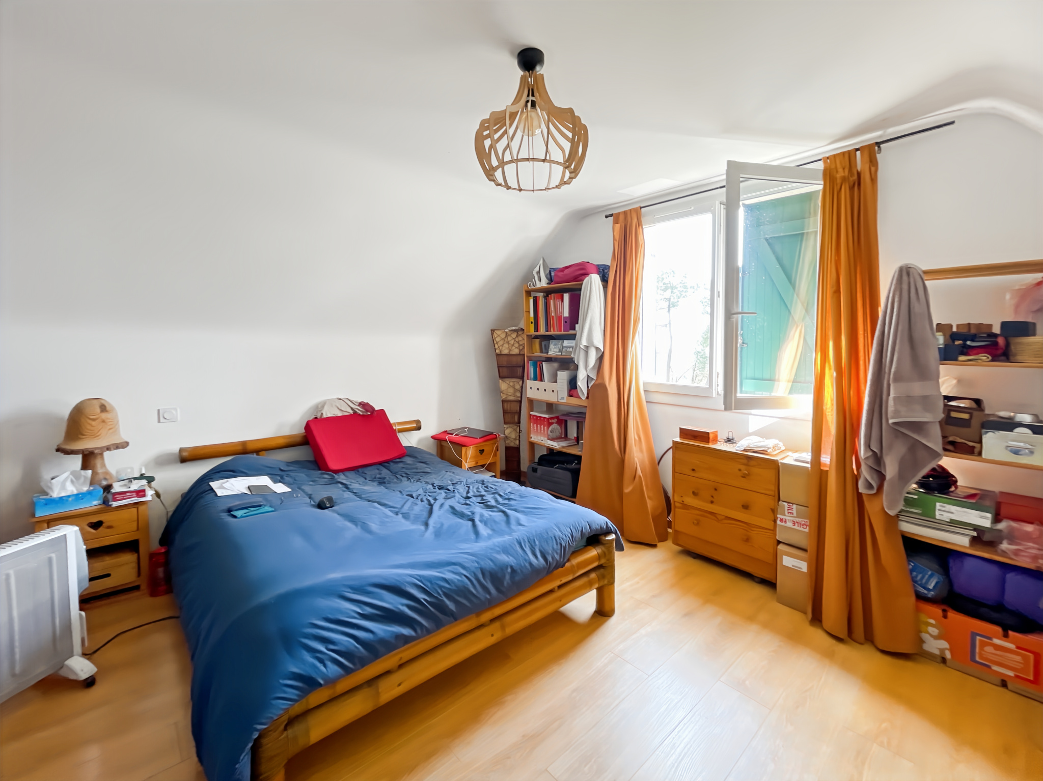 Elle se compose d'un hall d'entrée avec penderie, un salon-séjour cathédrale avec une cheminée, une cuisine aménagée et équipée, deux chambres dont une avec kitchenette, une salle de bains et un wc.