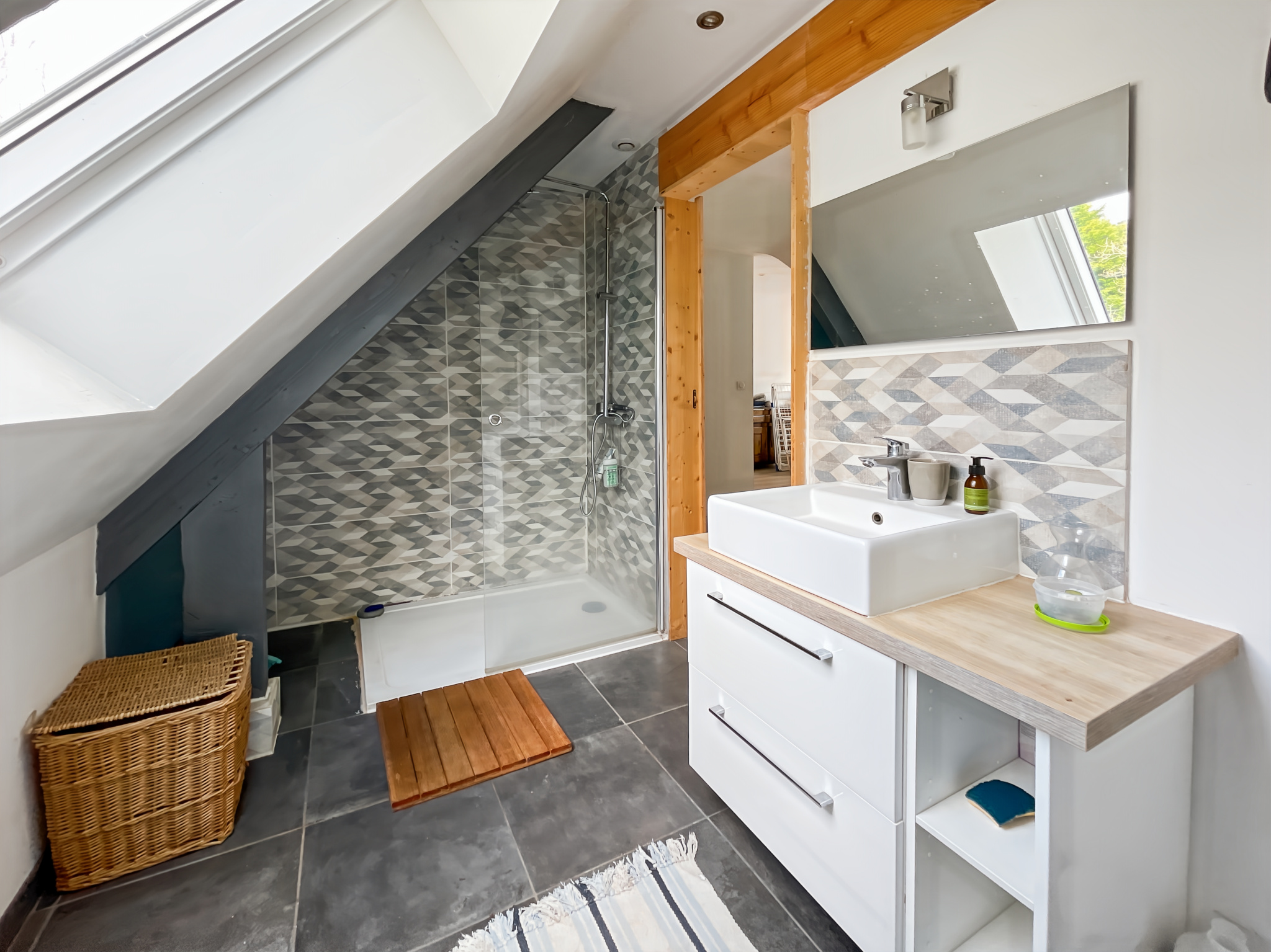 À l'étage, une mezzanine donnant une vue sur la pièce de vie du rez-de-chaussé, deux chambres, une salle de douches et un wc.