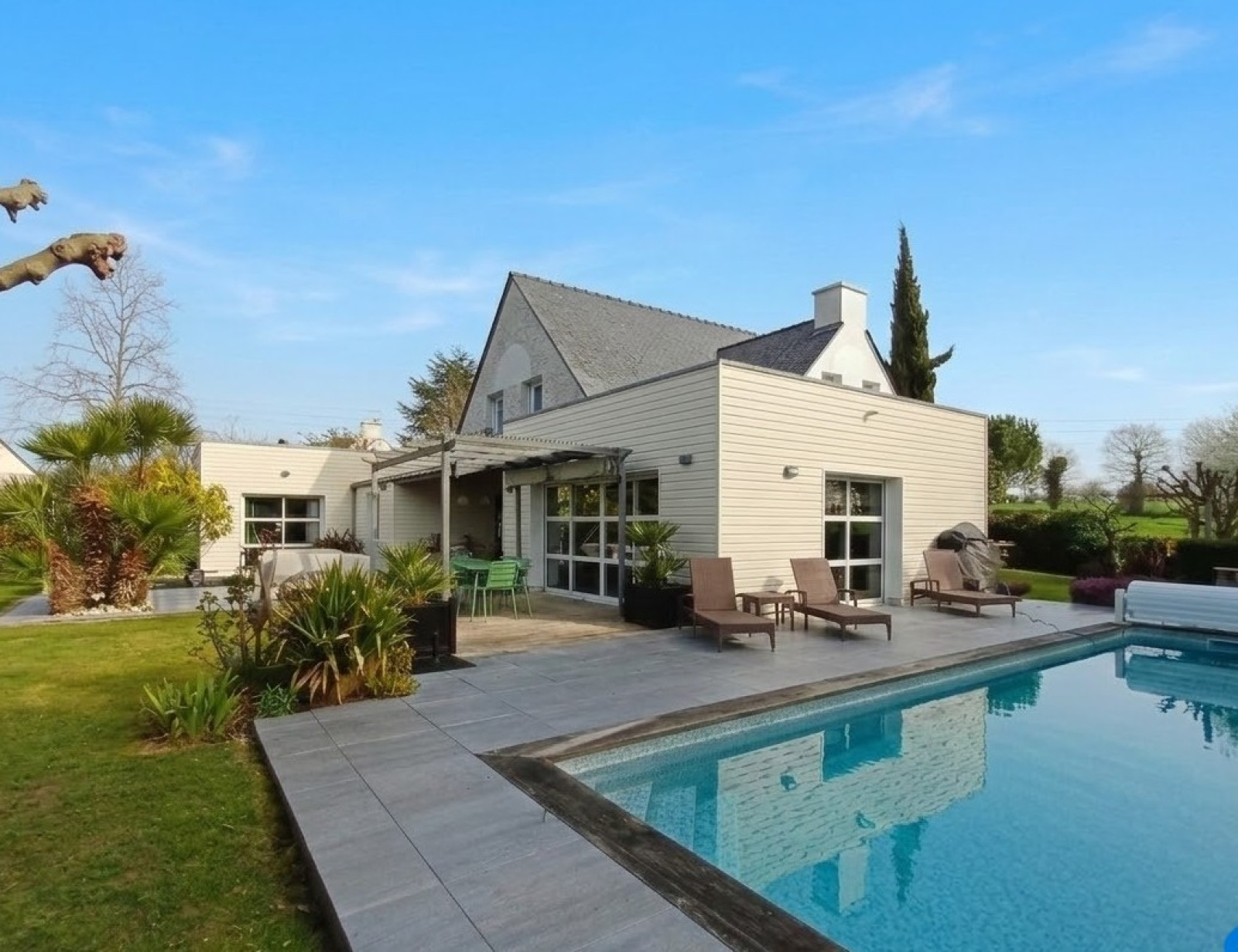 Située en campagne de Saint-Grégoire, dans un environnement résidentiel calme et préservé, cette maison d'architecte construite en 1996 développe 240 m2 habitables, pour environ 275 m2 au sol, sur une parcelle close et arborée d'environ 1700 m2.