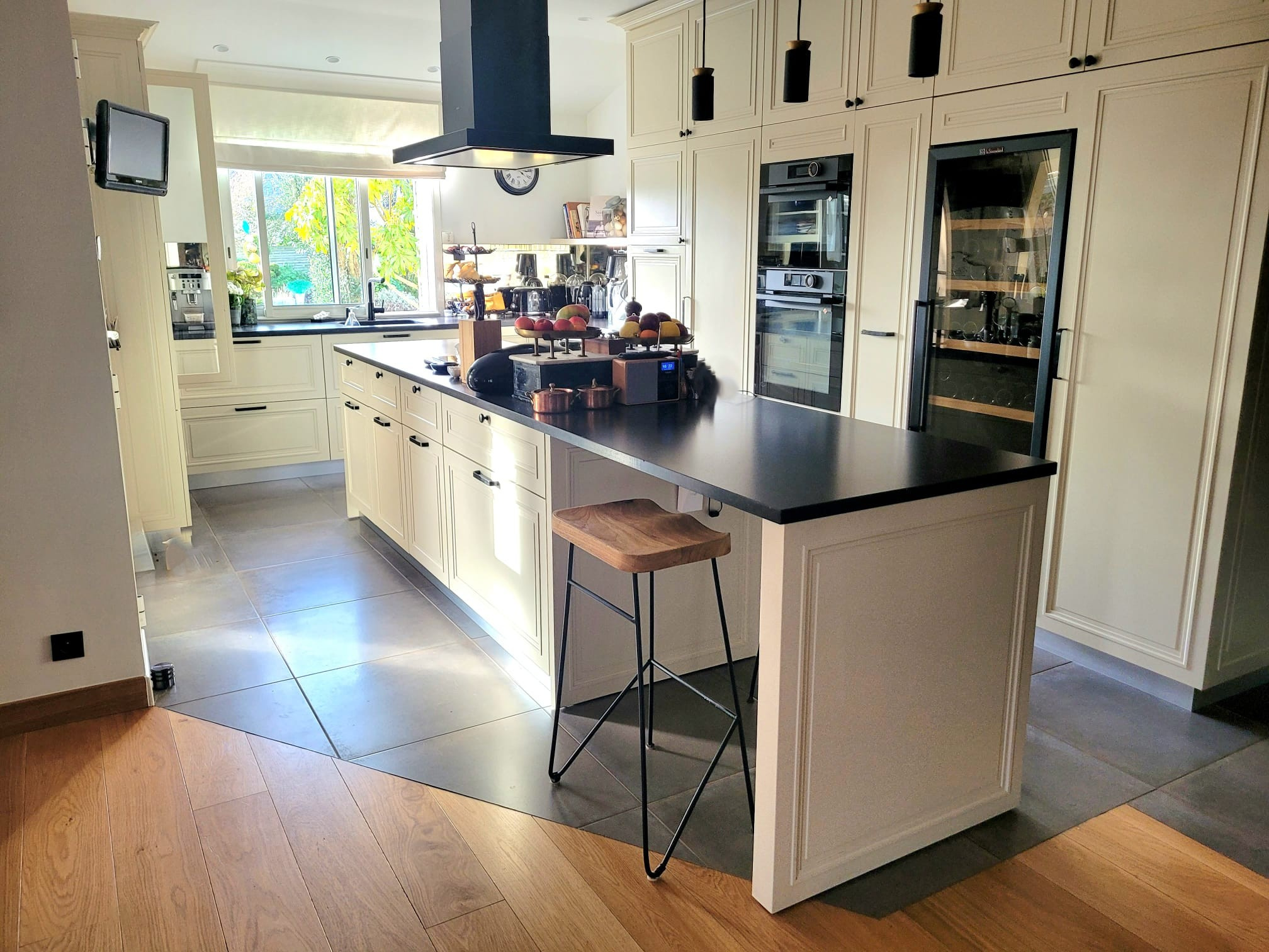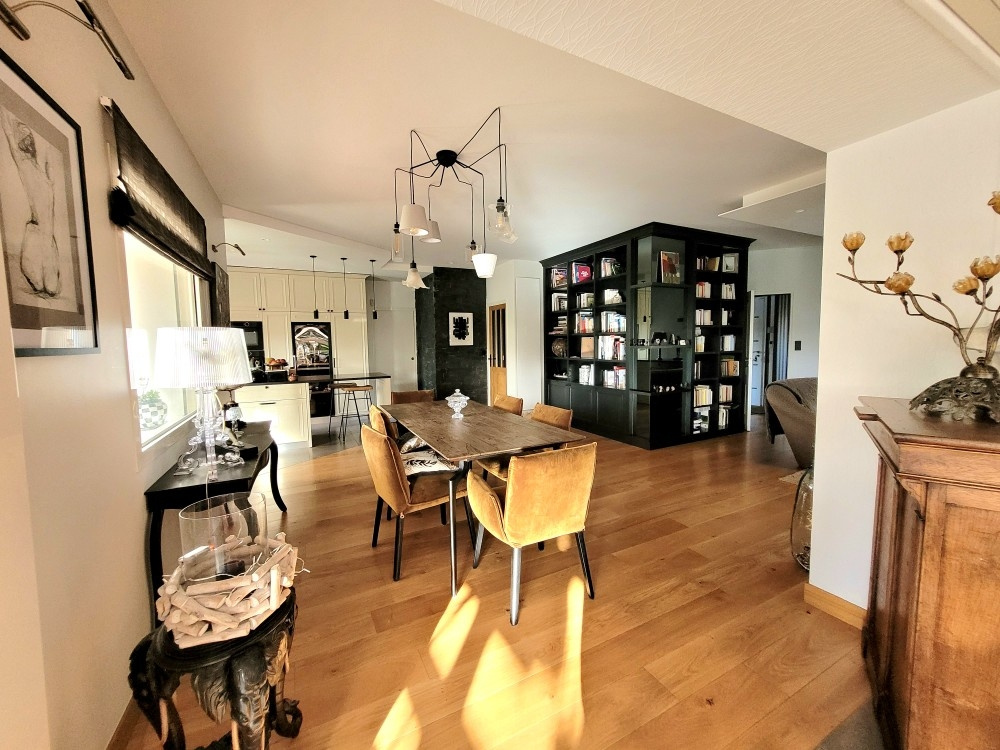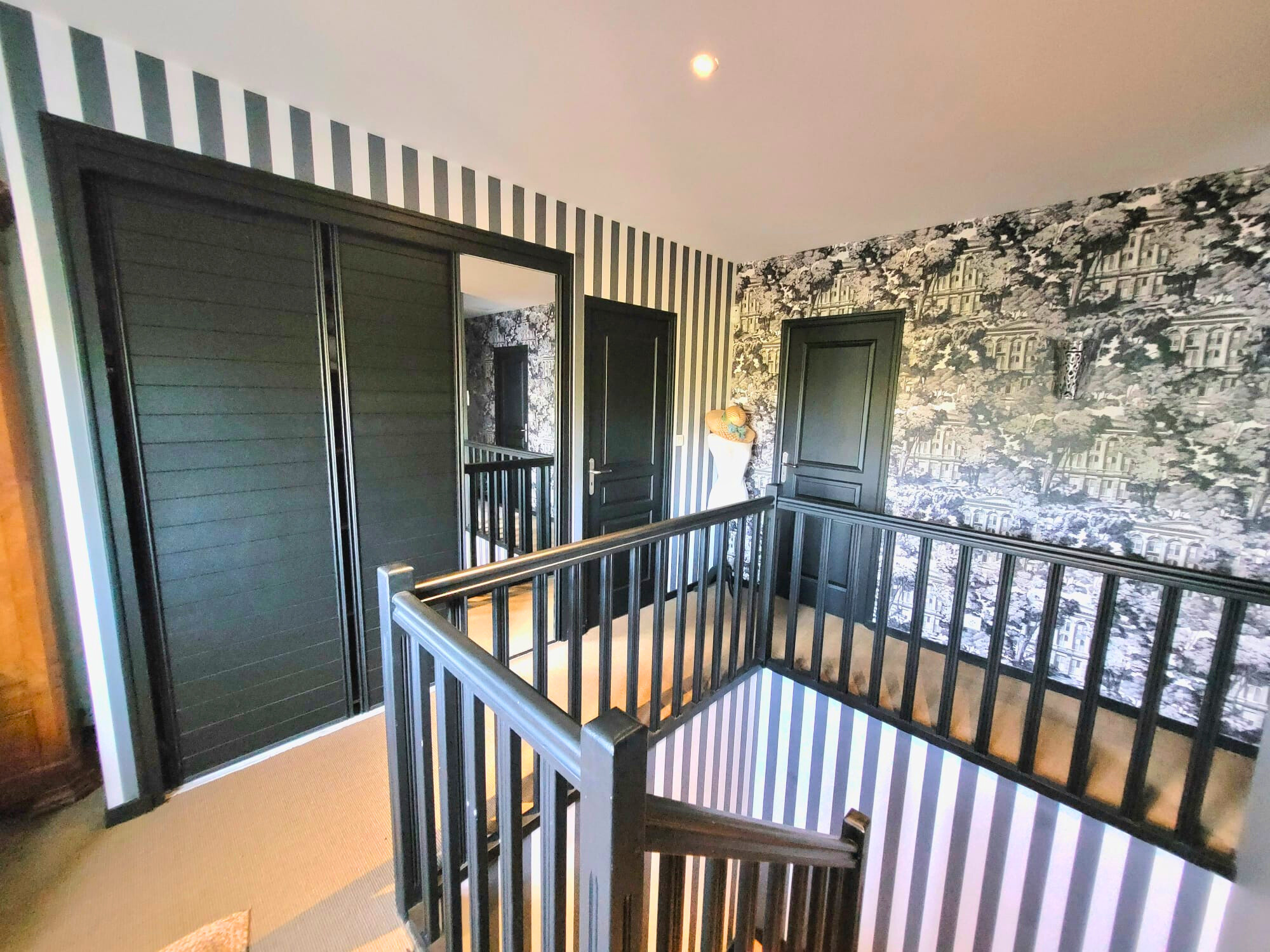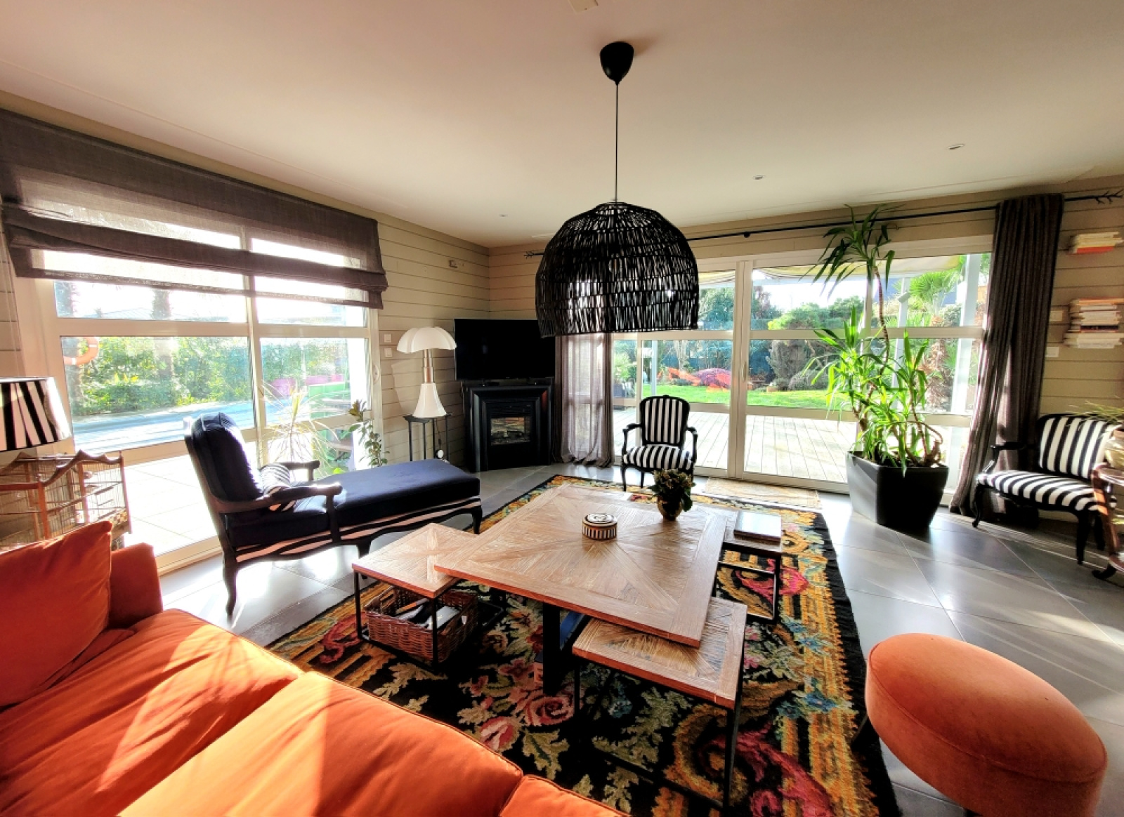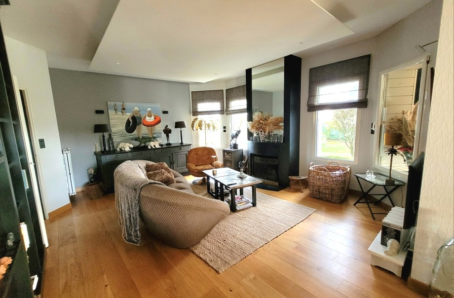 Le rez-de-chaussée s'organise autour d'une pièce de vie d'environ 93 m2 comprenant deux espaces salon, dont un avec cheminée, une salle à manger et une cuisine ouverte aménagée et équiepée. Les volumes sont ouverts et fonctionnels. Une suite parentale avec dressing et salle d'eau permet une vie de plain-pied. Un bureau indépendant, une buanderie et WC complétent ce niveau.