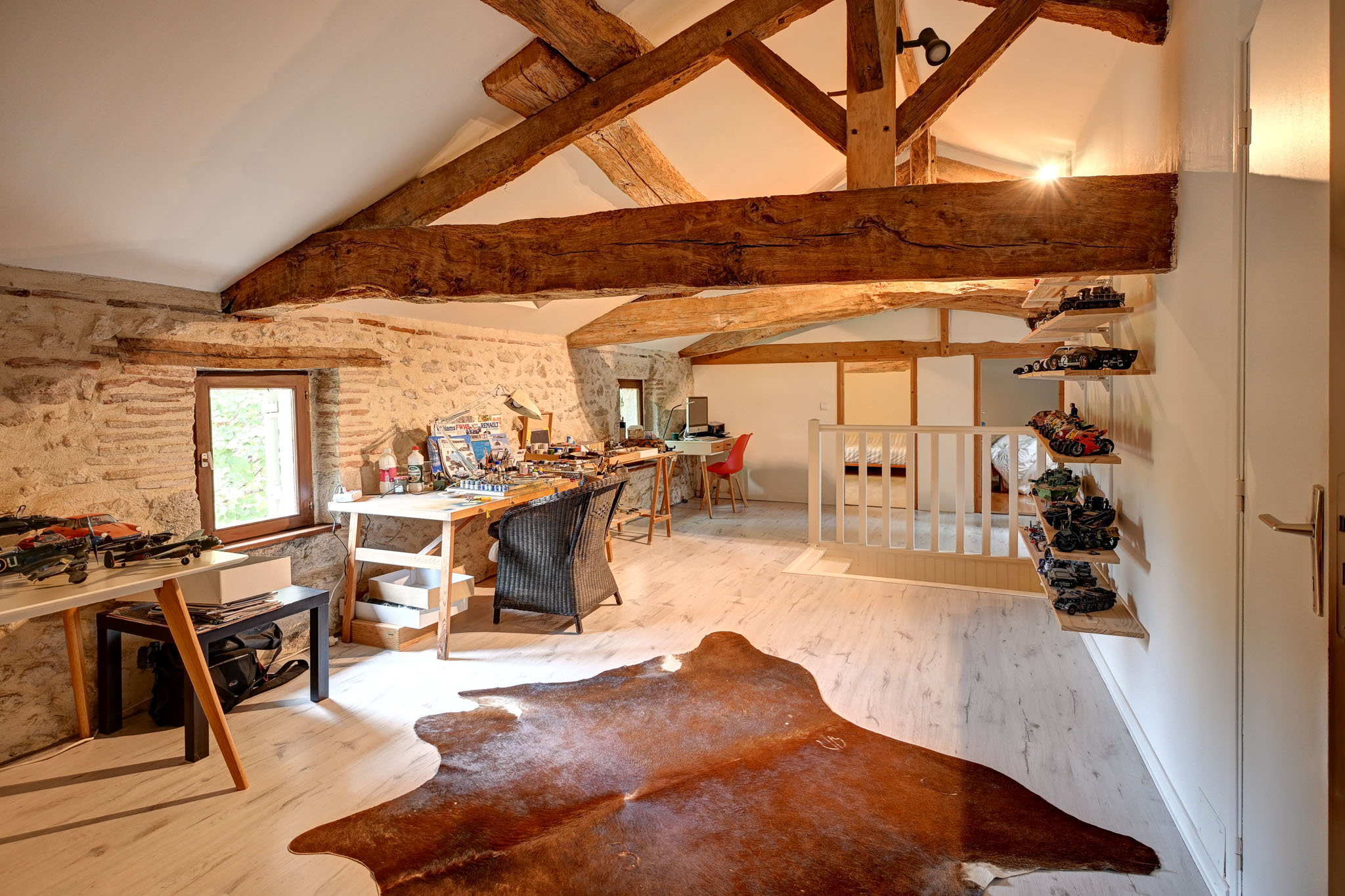 À l’étage, un grand palier pouvant faire office de second salon, de bureau ou de salle de jeux dessert trois chambres, dont une avec dressing. On y trouve également une salle de bains équipée d’une baignoire, d’une douche à l’italienne et de toilettes.