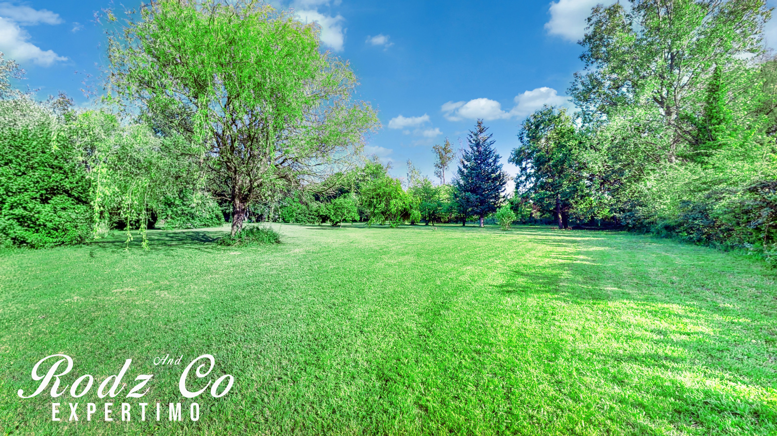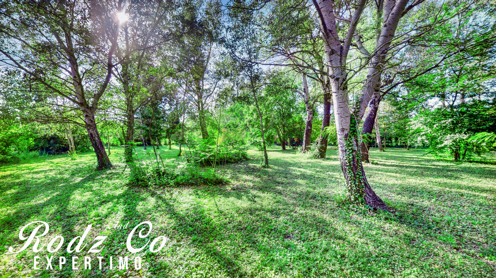 Le terrain est un parc arboré entretenu, bordé par un ruisseau agricole.