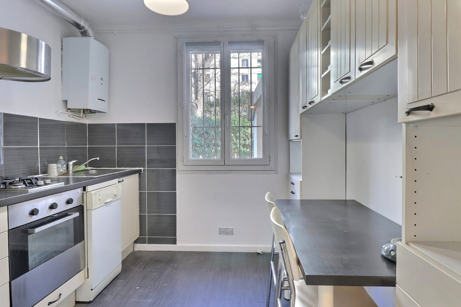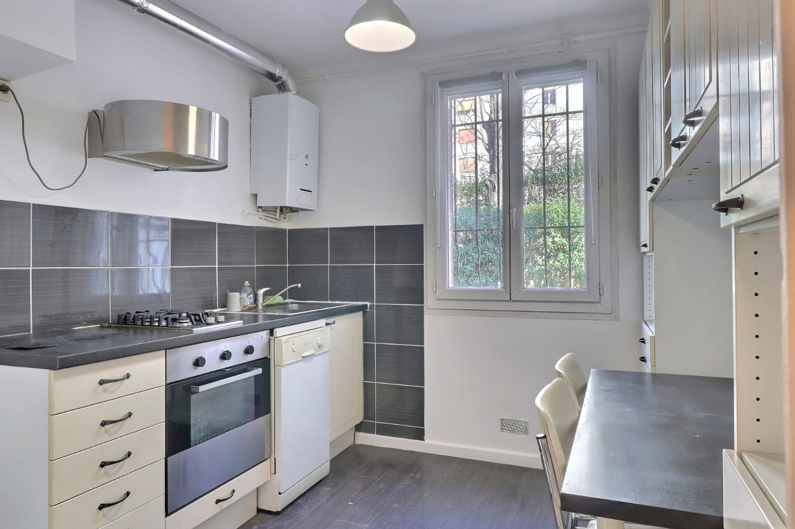 Les charges de copropriété incluent le chauffage, l’entretien des espaces verts, la présence d’un gardien ainsi que les portails sécurisés. La production d’eau chaude est assurée par une chaudière individuelle.