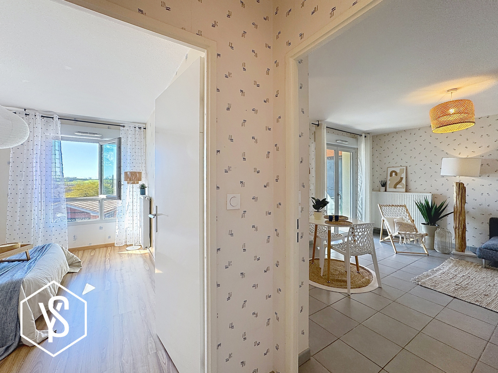 Pièce de vie de 24m², chambre séparée de 12,30m², entrée, salle d'eau/WC et balcon de 5m².