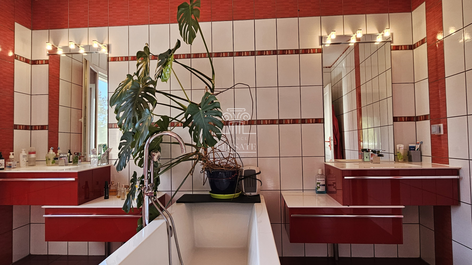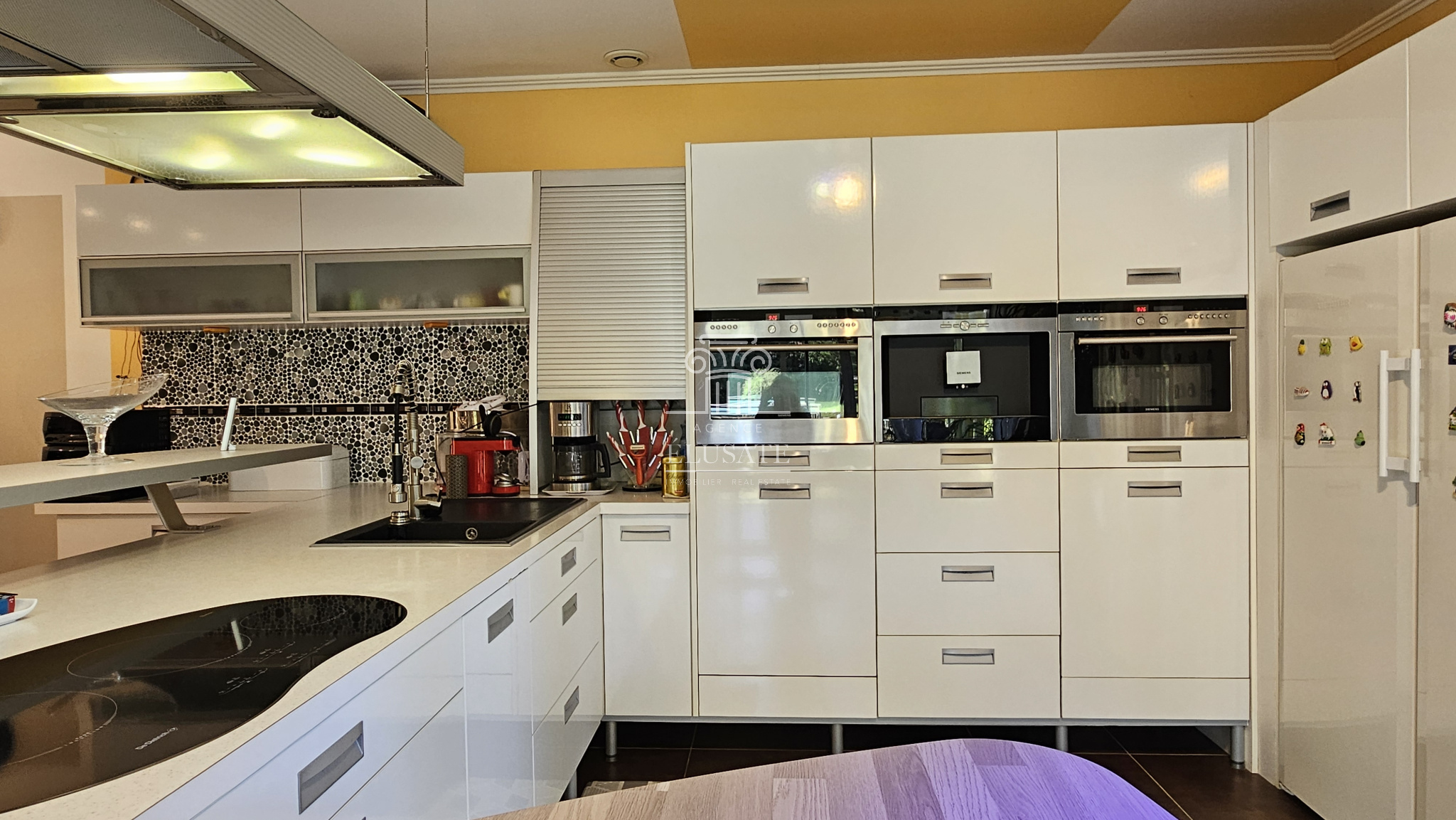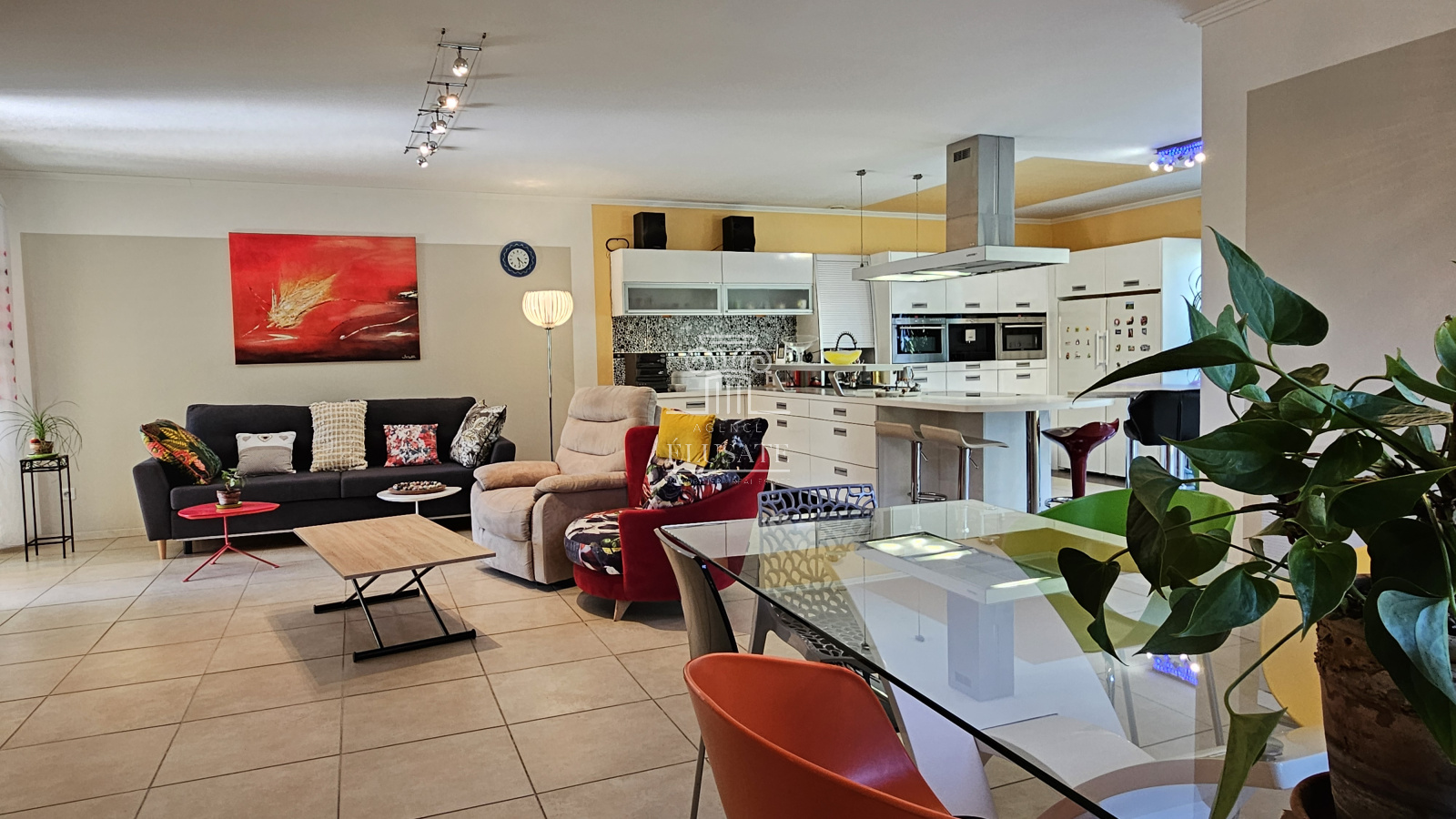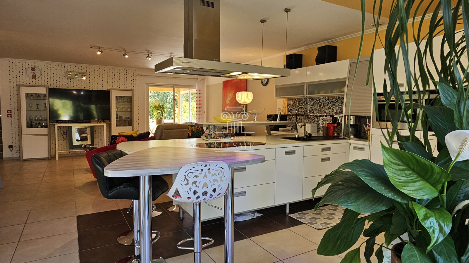 Au rdc, vous entrez dans une belle pièce de vie de 60m² lumineuse et spacieuse avec une large cuisine américaine, moderne et entièrement équipée. La pièce de vie donne sur une véranda côté cuisine et une 2ème terrasse côté salon, ce qui offre une belle luminosité à la pièce