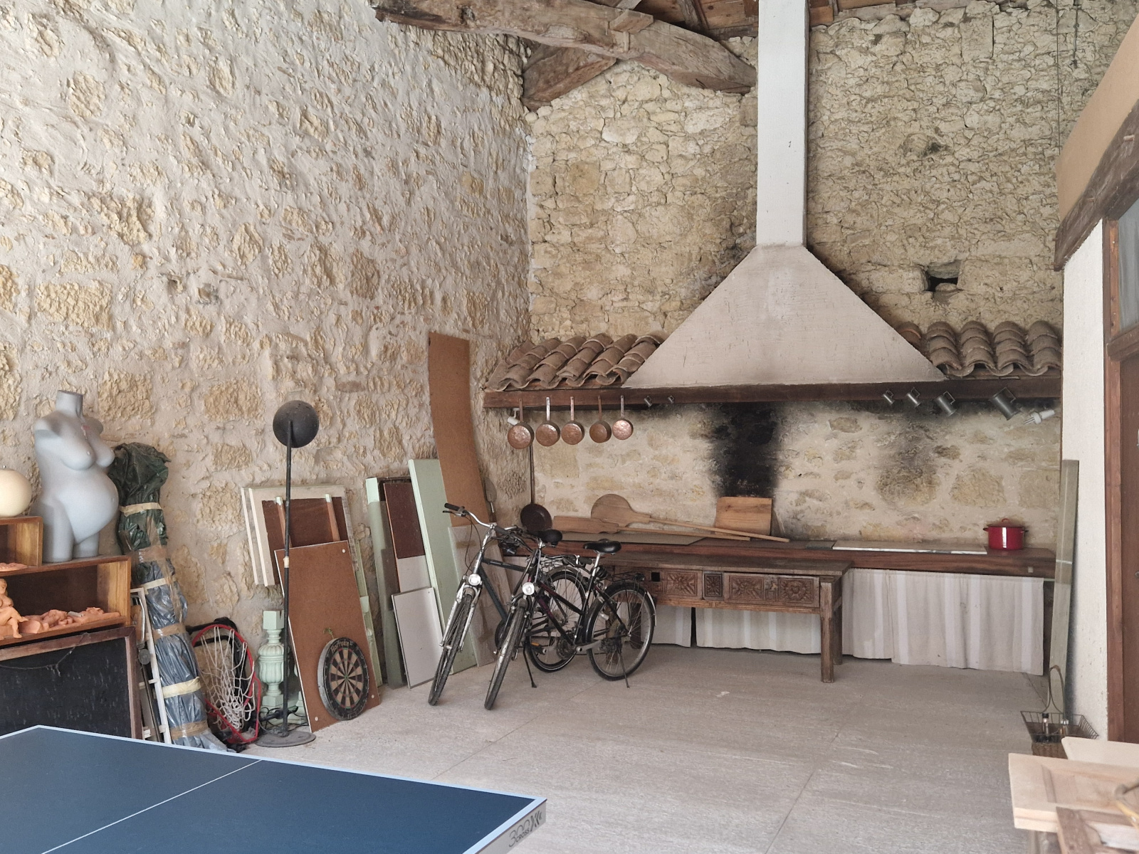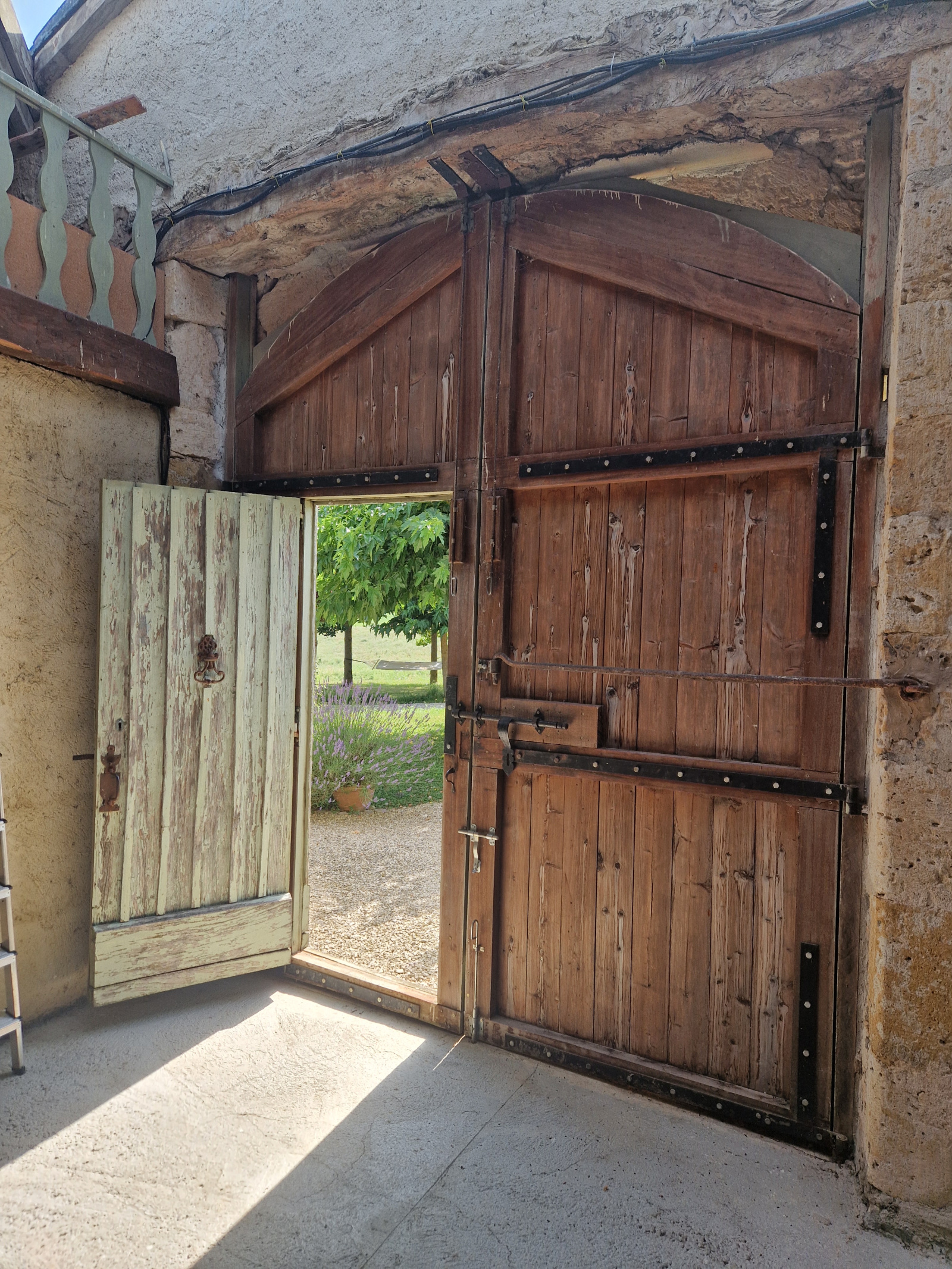À l’arrière de la cuisine, on découvre une fabuleuse cour intérieure de 65 m², avec une vaste cheminée ouverte et un four à pain à une extrémité, et une porte cintrée allant du sol au plafond à l’autre. Elle évoque immédiatement des images de fraîches rencontres estivales ou de chaleureux rassemblements d’hiver, que ce soit pour les amis et la famille ou pour des hôtes payants.