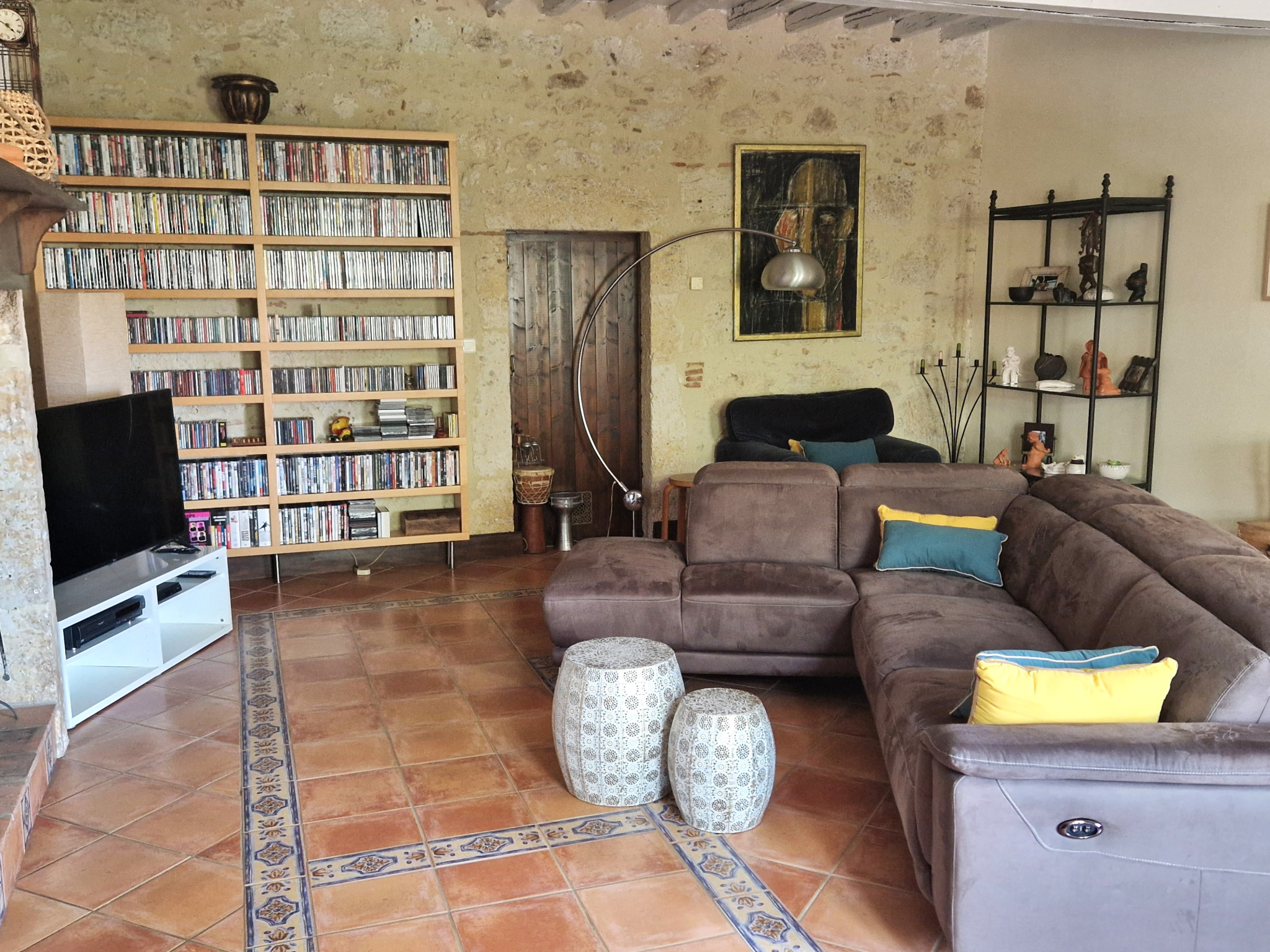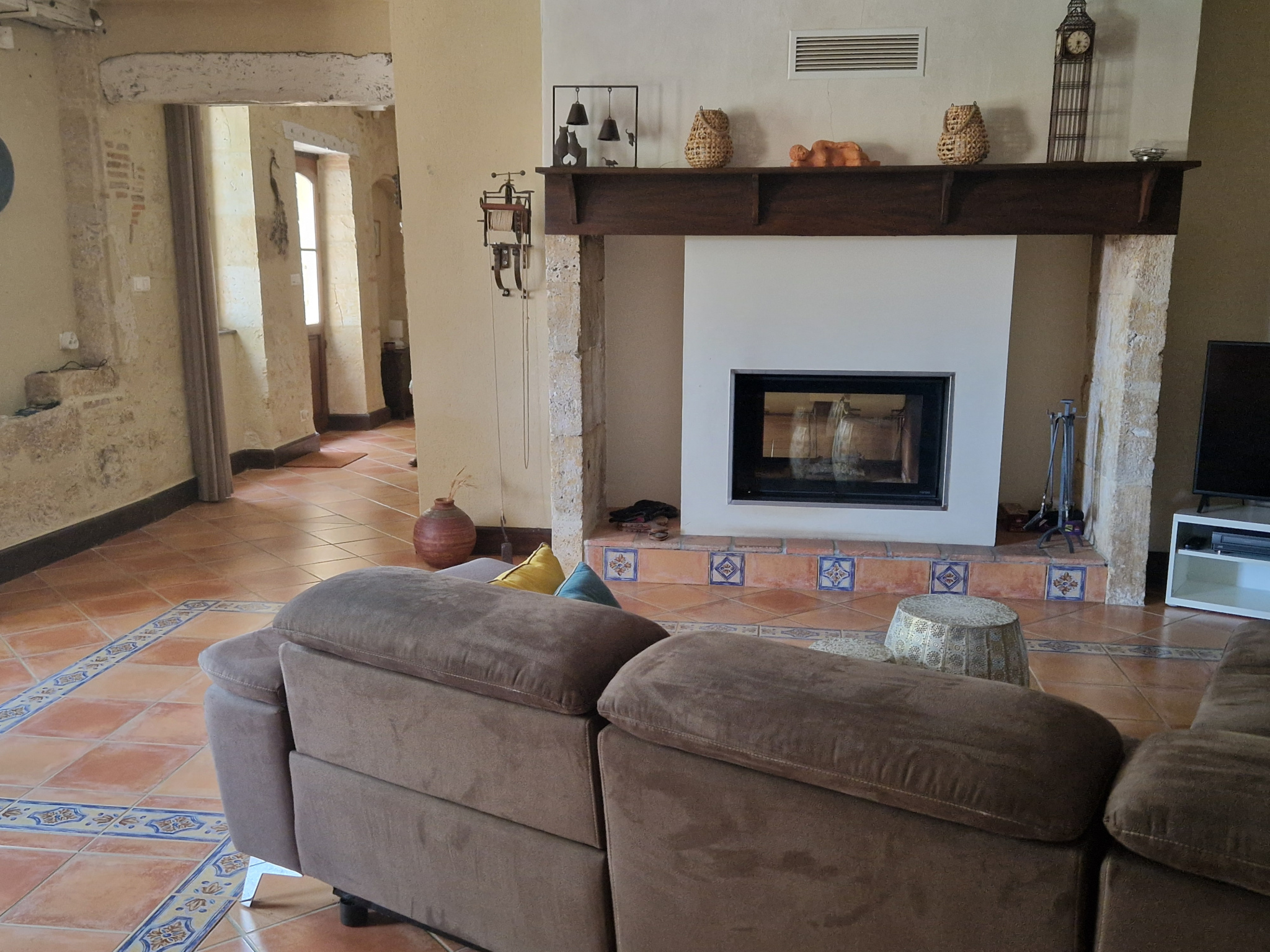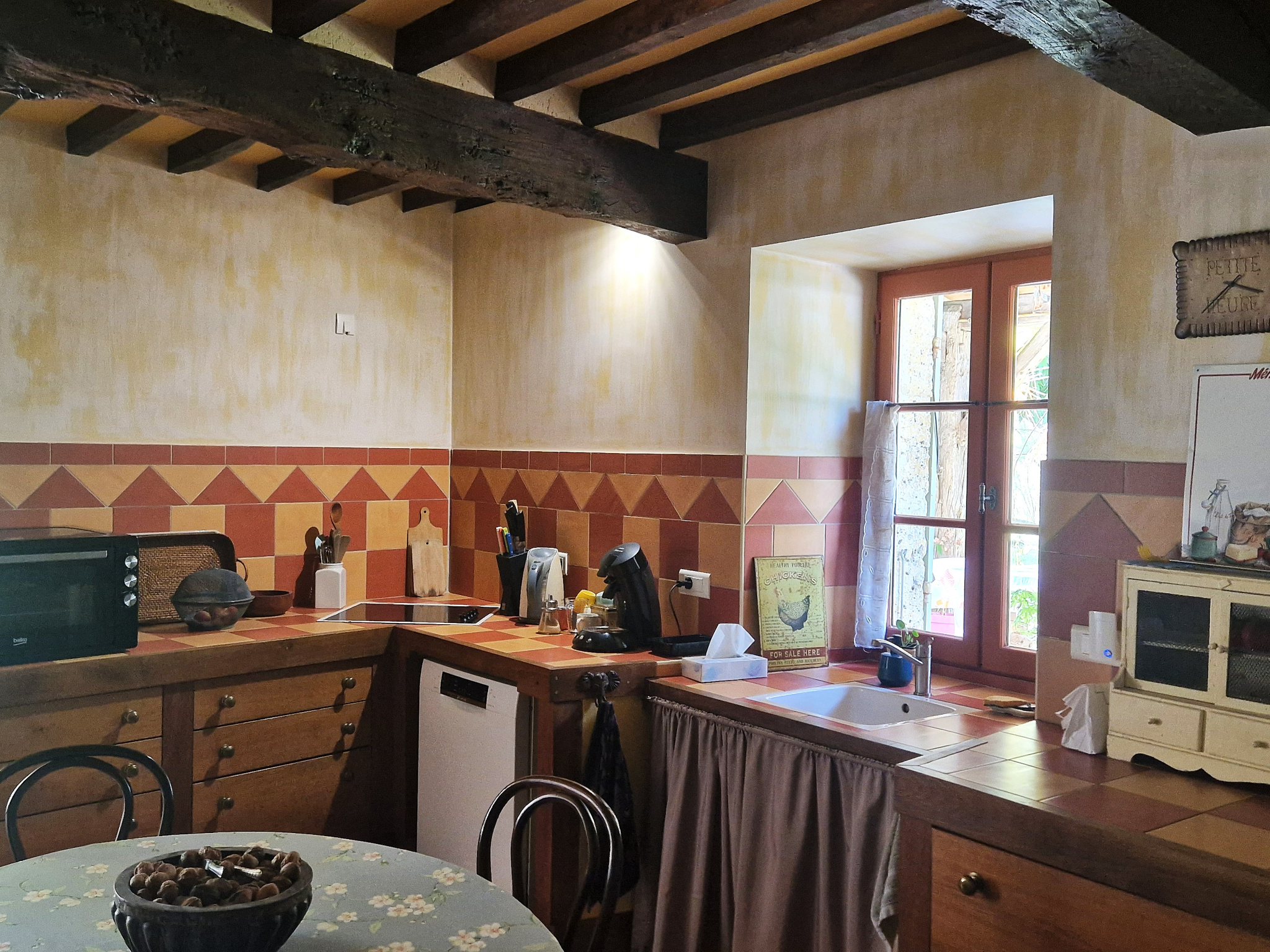 À l’intérieur, la cuisine est actuellement divisée en deux parties : la partie fonctionnelle avec tous les appareils de cuisine intégrés habituels, et l’espace plus convivial du « petit-déjeuner », doté d’un four à pain d’origine. Quelques marches plus haut, on trouve la vaste salle à manger qui partage un nouvel insert avec le salon cosy adjacent. Toutes ces pièces donnent directement sur la terrasse ombragée.