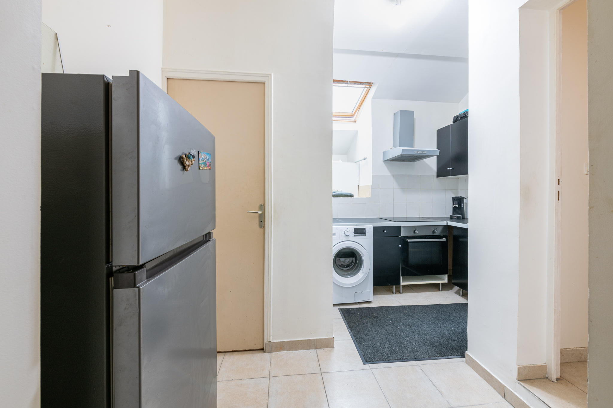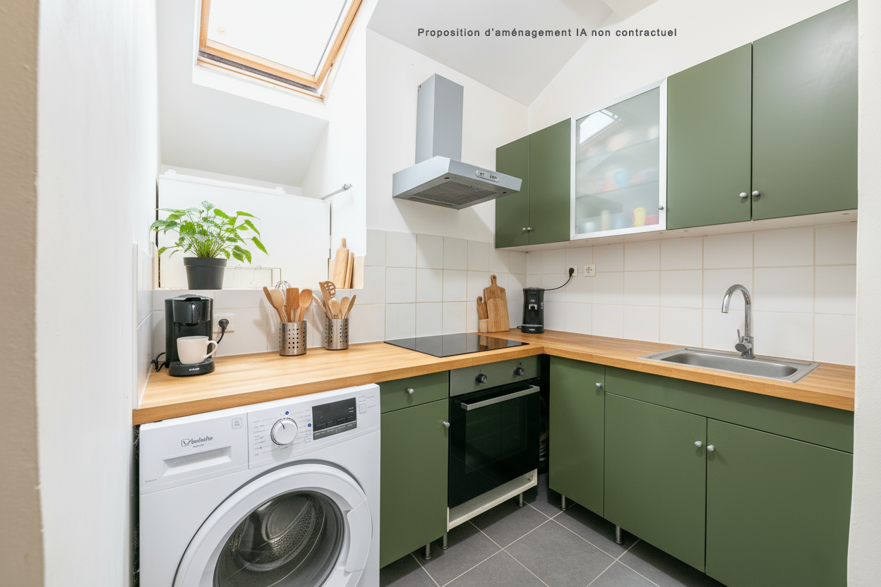 Carrelage au sol, équipée : plaque, hotte, four, lave linge