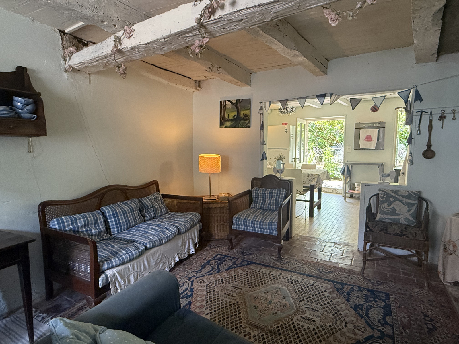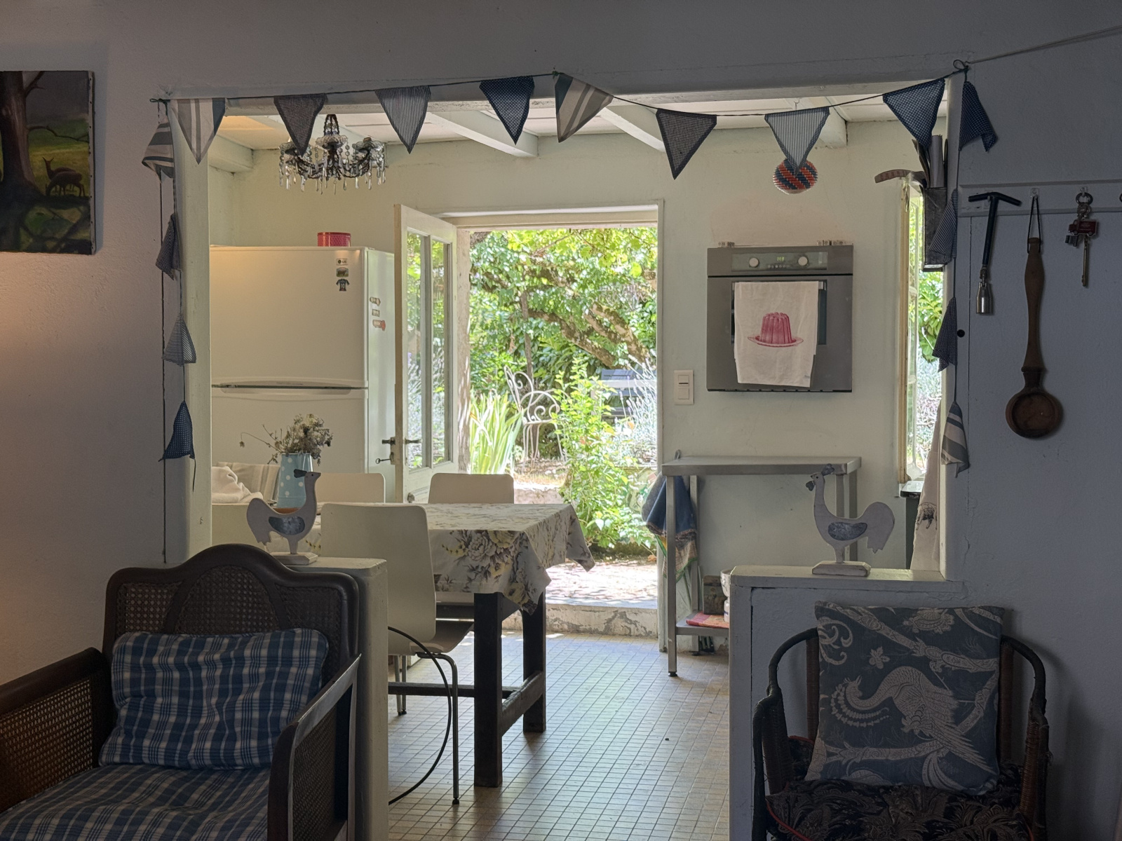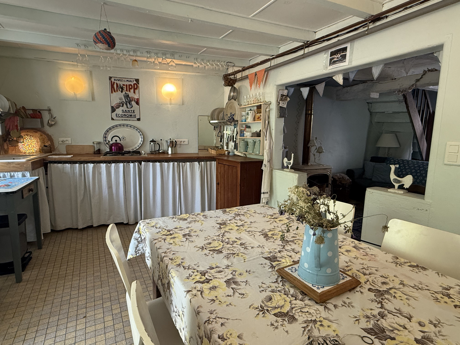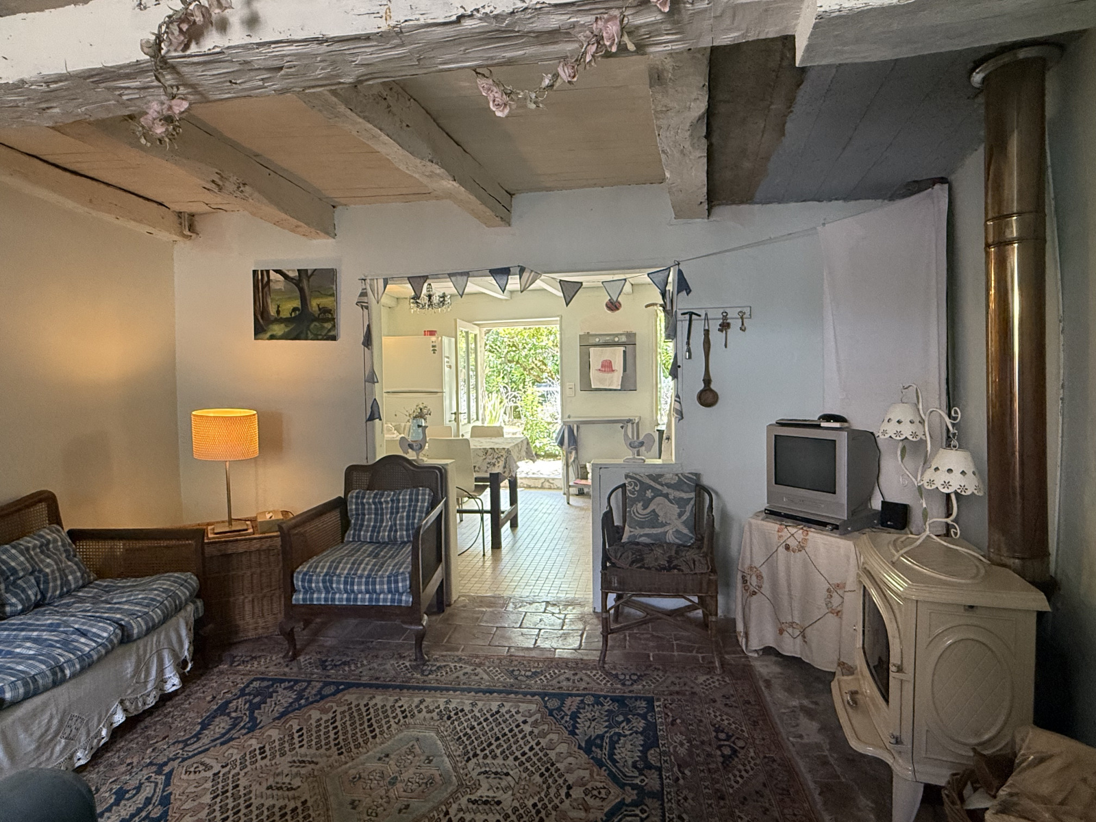 Salon lumineux (18 m²) avec poêle à bois et carreaux de terre cuite anciens, cuisine fonctionnelle (13 m²) avec espace repas et accès direct au jardin. Portillon donnant sur les champs.