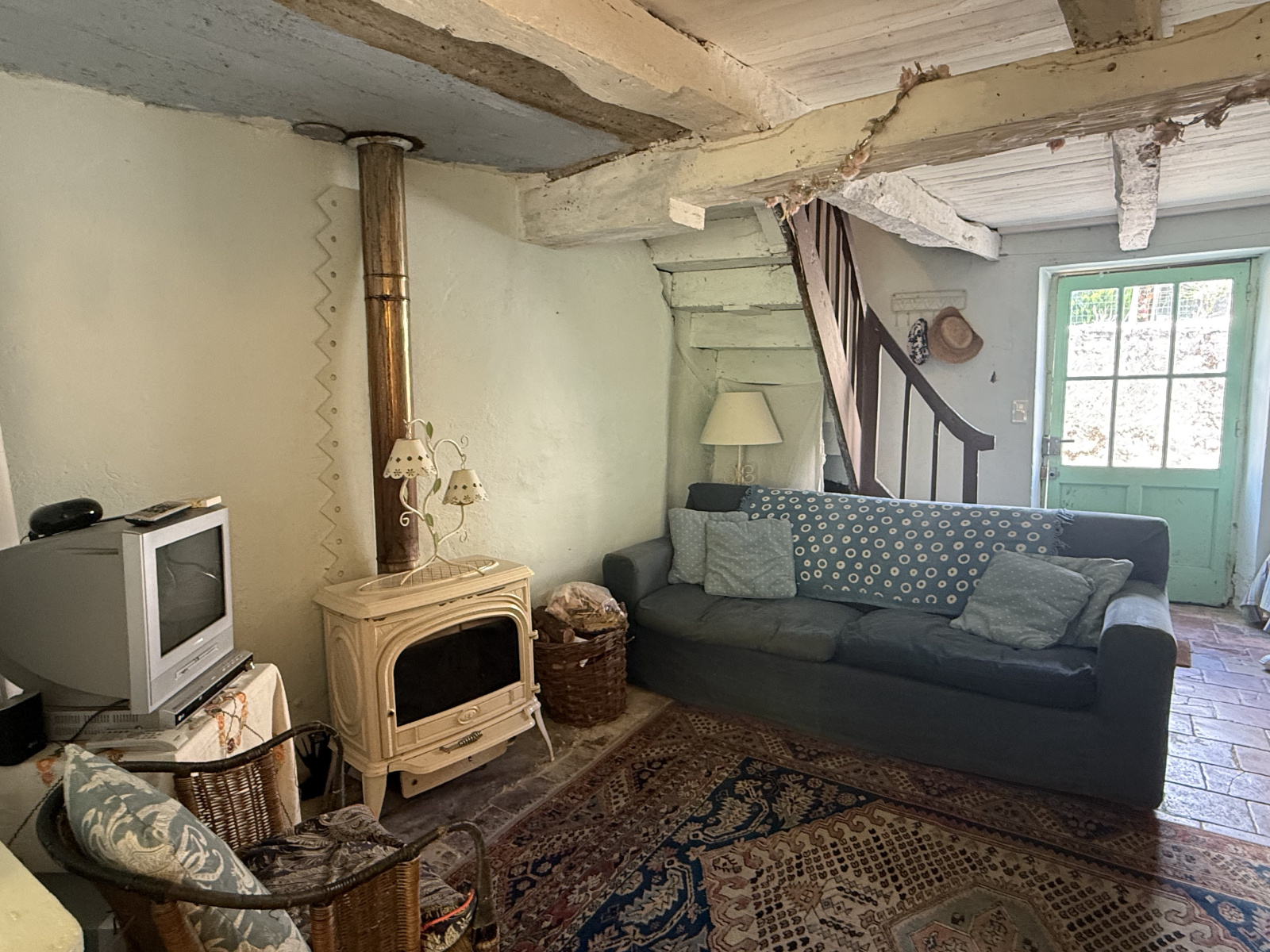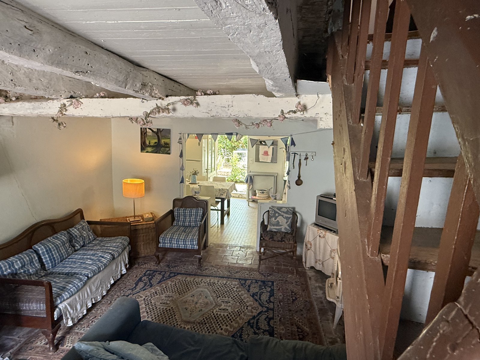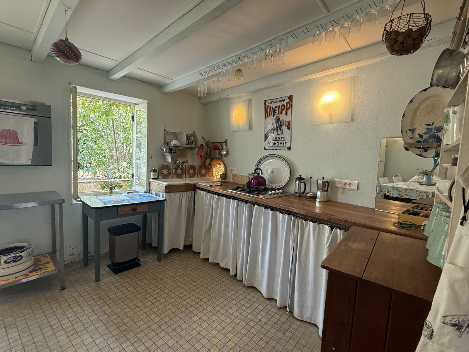 Salon lumineux (18 m²) avec poêle à bois et carreaux de terre cuite anciens, cuisine fonctionnelle (13 m²) avec espace repas et accès direct au jardin. Portillon donnant sur les champs.