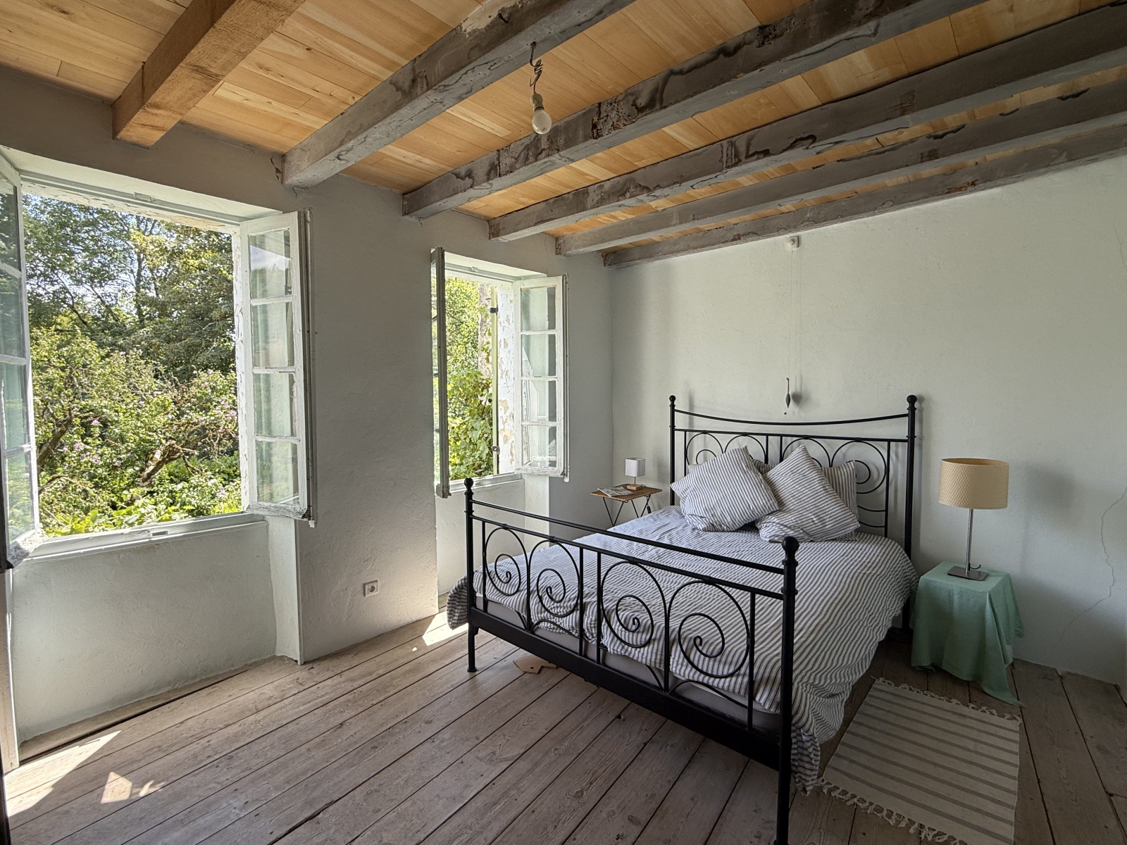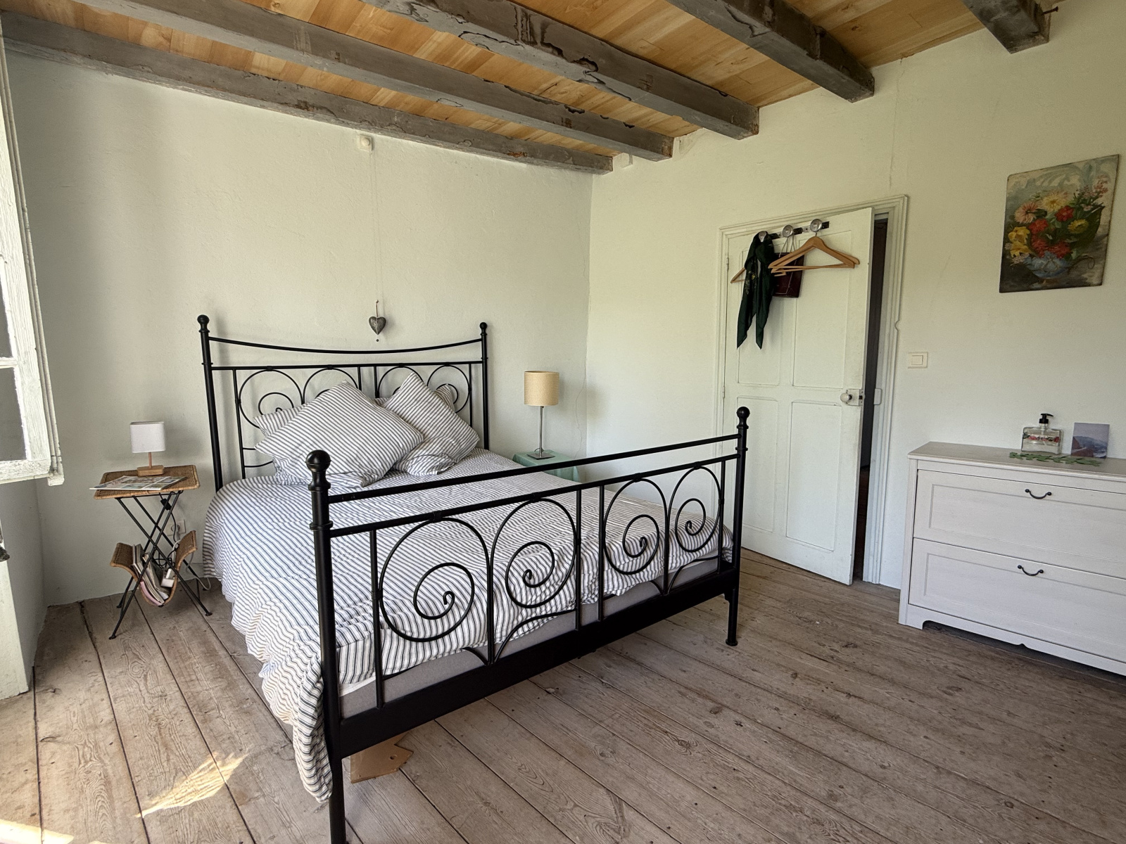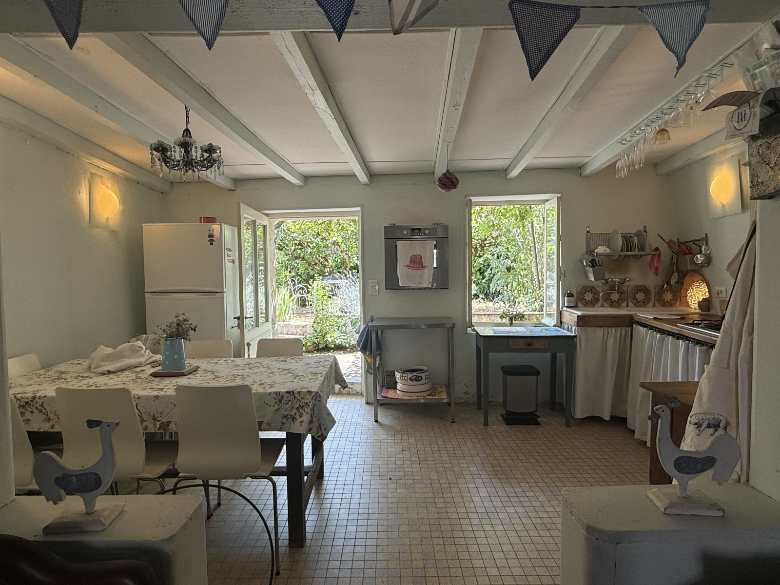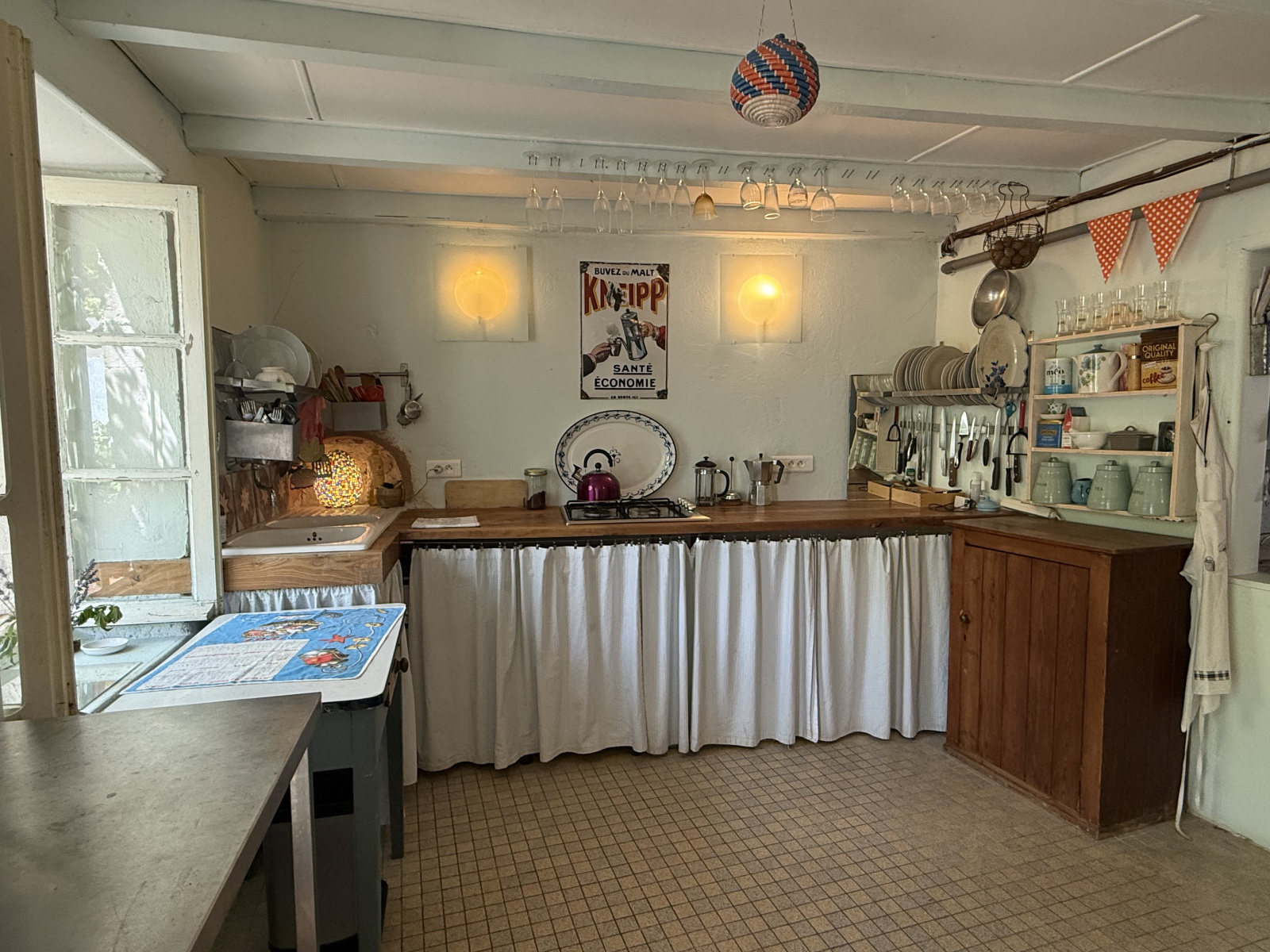 Salon lumineux (18 m²) avec poêle à bois et carreaux de terre cuite anciens, cuisine fonctionnelle (13 m²) avec espace repas et accès direct au jardin. Portillon donnant sur les champs.