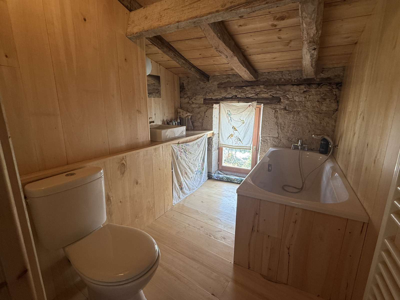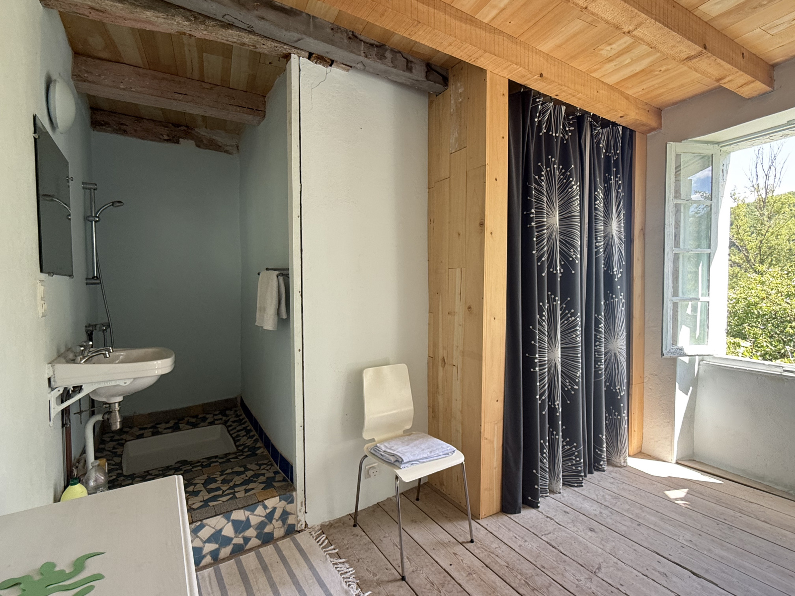 Bel espace ouvert (33 m²) avec 5 m de hauteur sous plafond, baigné de lumière, salle de bain attenante (6 m²) avec baignoire et WC.