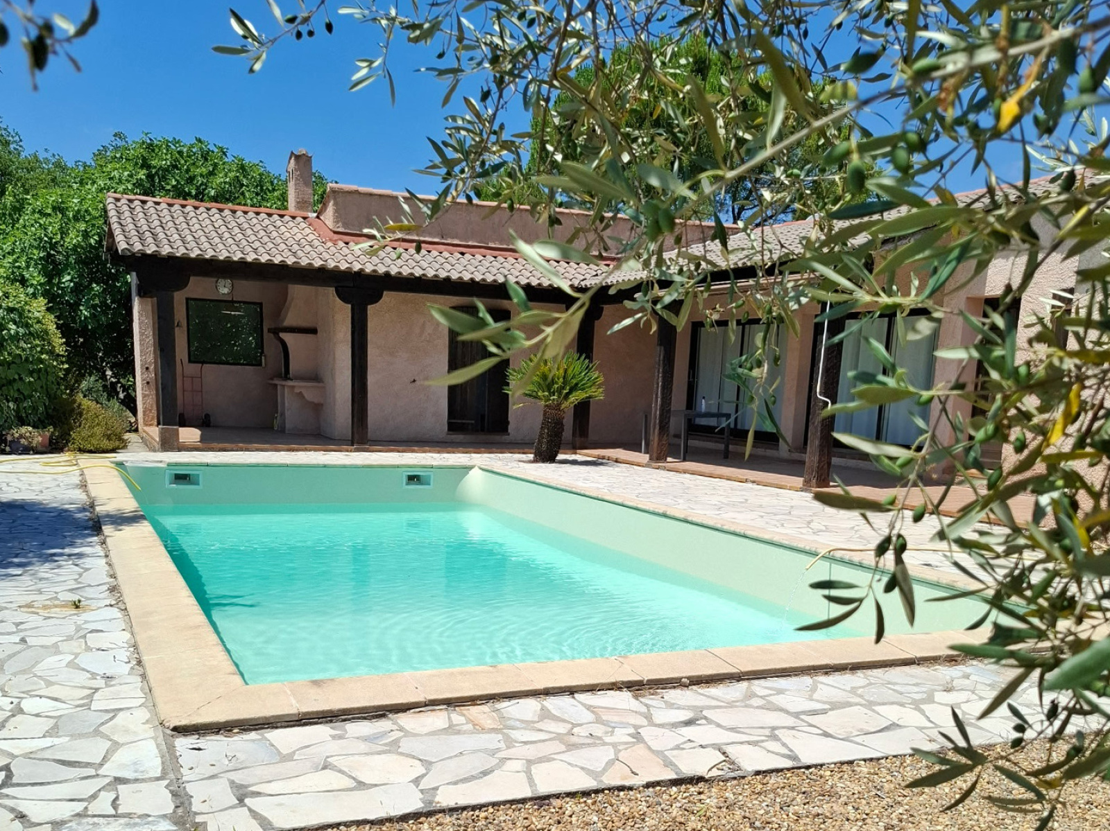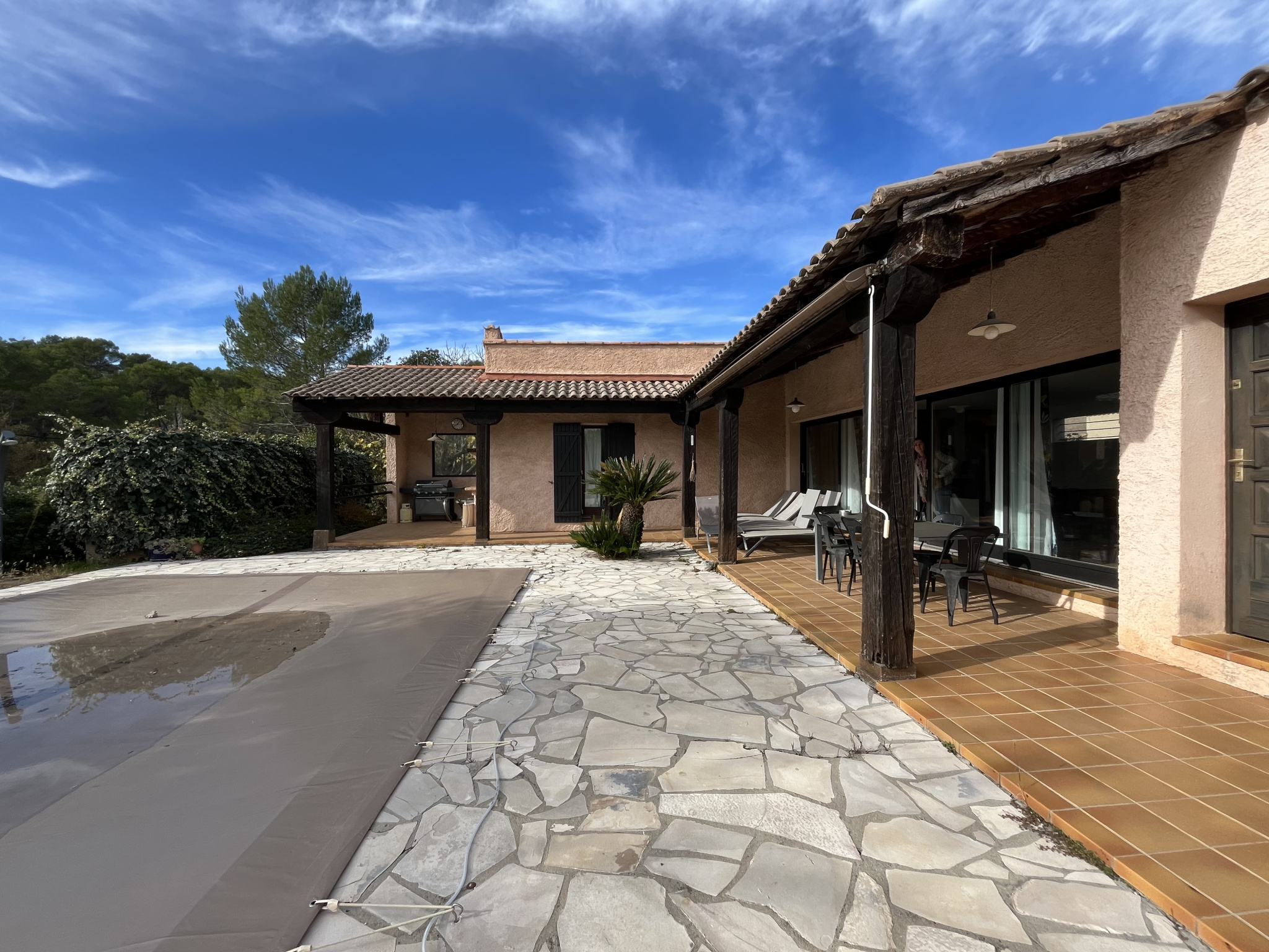 Terrasse couverte avec espace barbecue donnant directement sur la piscine chauffée (solaire), liner changé en 2025.