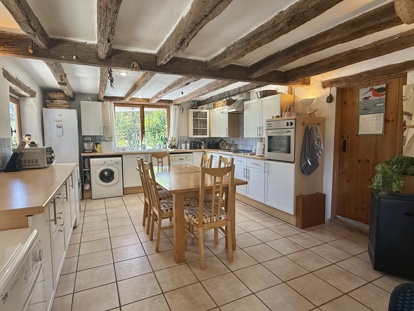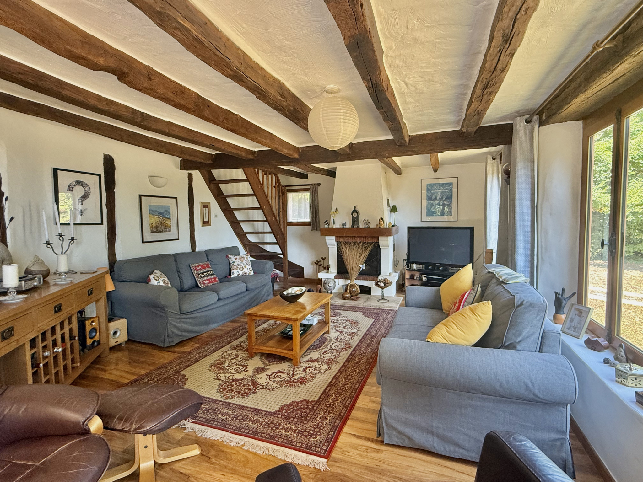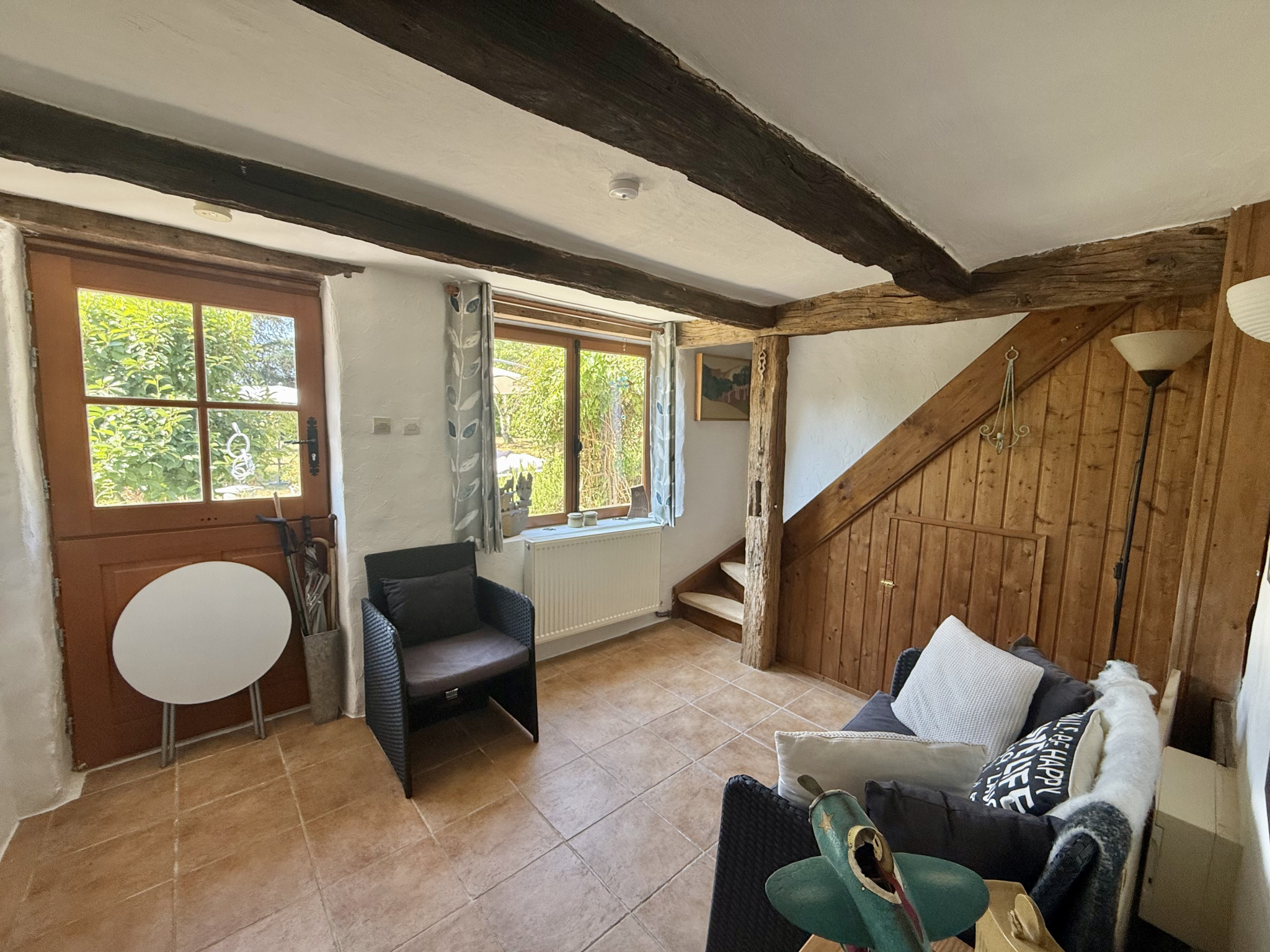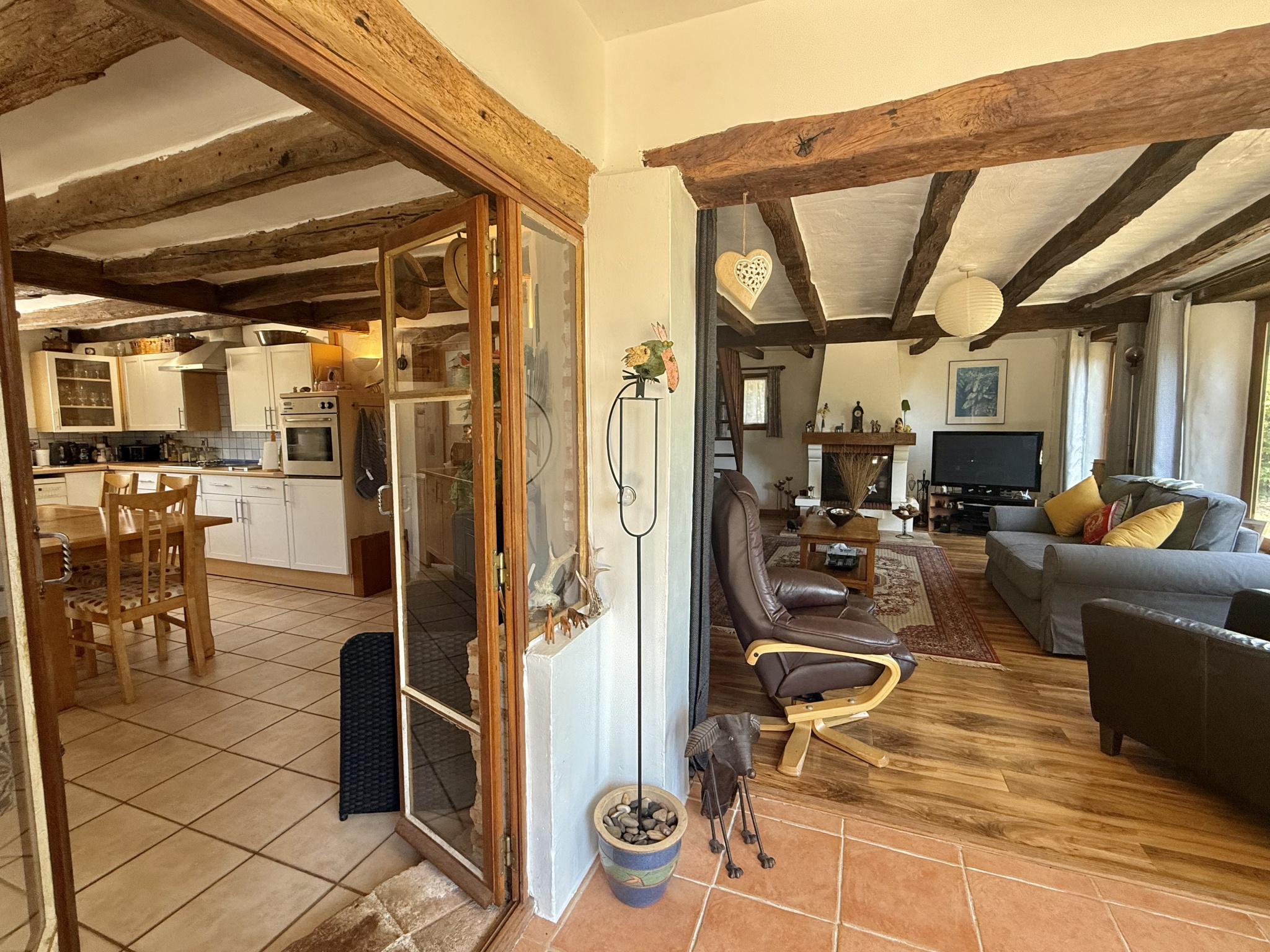Le rez-de-chaussée s’ouvre sur un hall d’entrée accueillant avec porte écurie et escalier, menant à une salle d’eau avec WC ainsi qu’à une cuisine entièrement équipée, baignée de lumière grâce à ses fenêtres à double exposition. Le salon spacieux dispose de portes-fenêtres donnant sur la terrasse et bénéficie de la chaleur de l’insert. À l’étage, la chambre principale, avec ses poutres apparentes et ses grandes fenêtres offrant une vue dégagée, dispose d’une salle de bain attenante avec baignoire, lavabo, bidet et WC. Un palier sert actuellement de deuxième chambre, tandis que la troisième chambre profite également de belles dimensions et d’une luminosité généreuse.