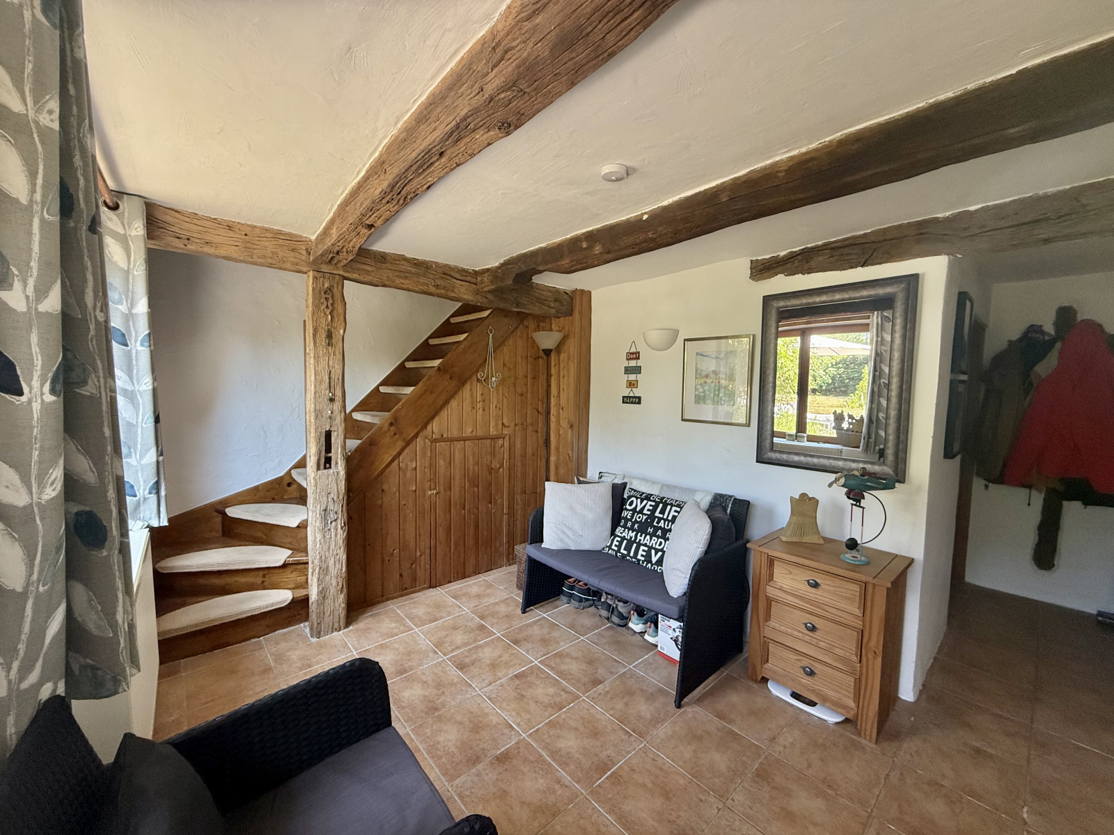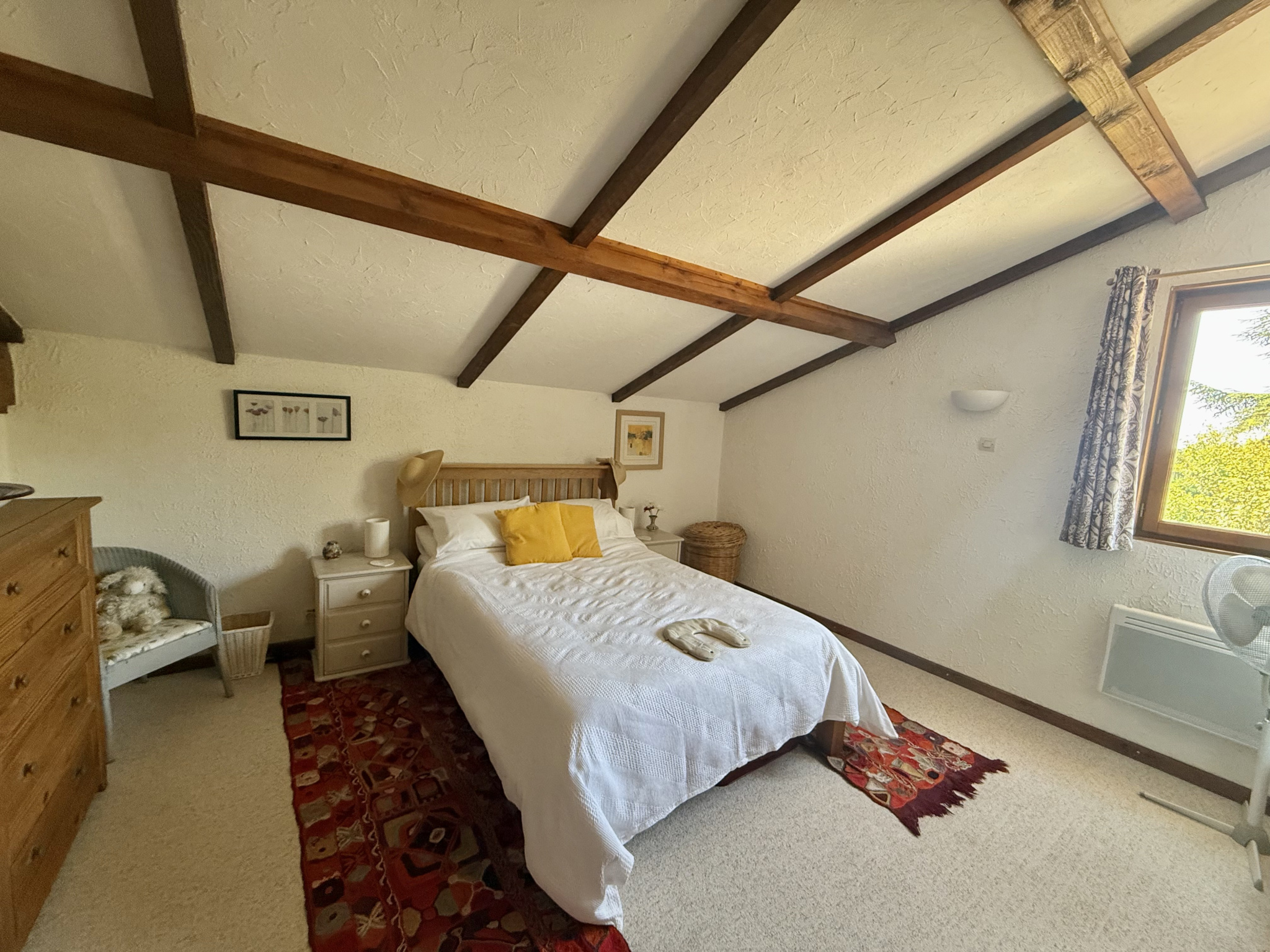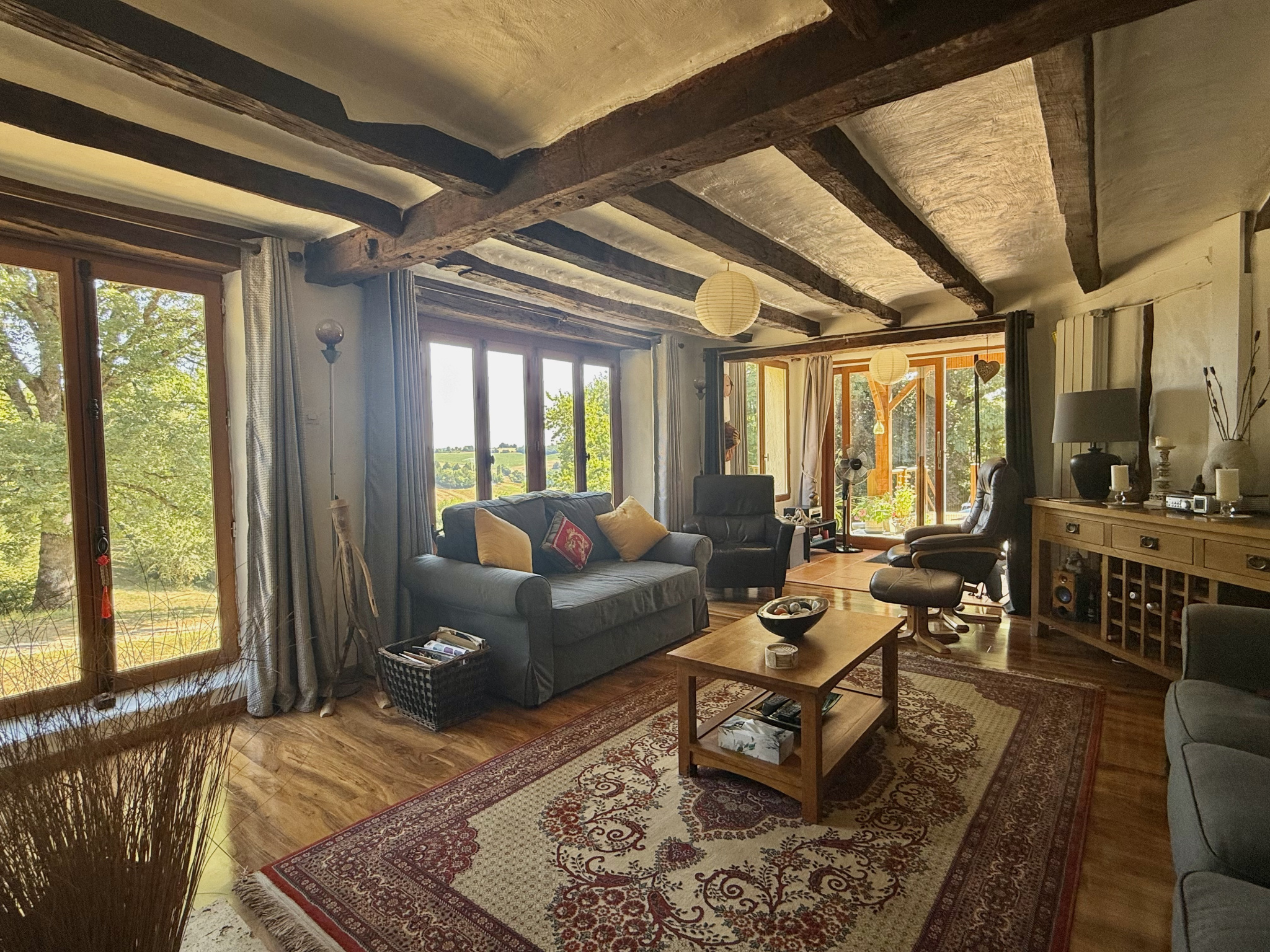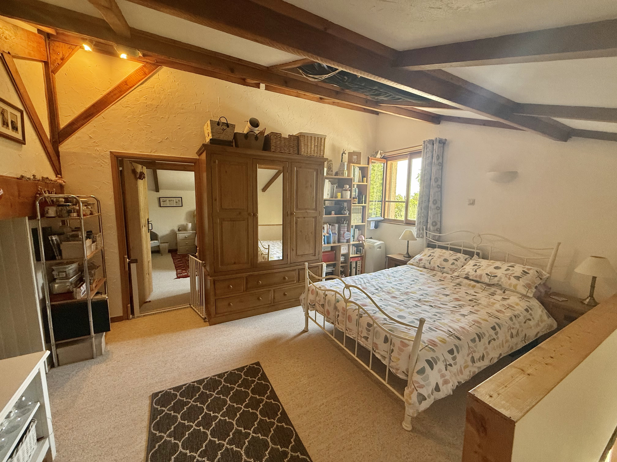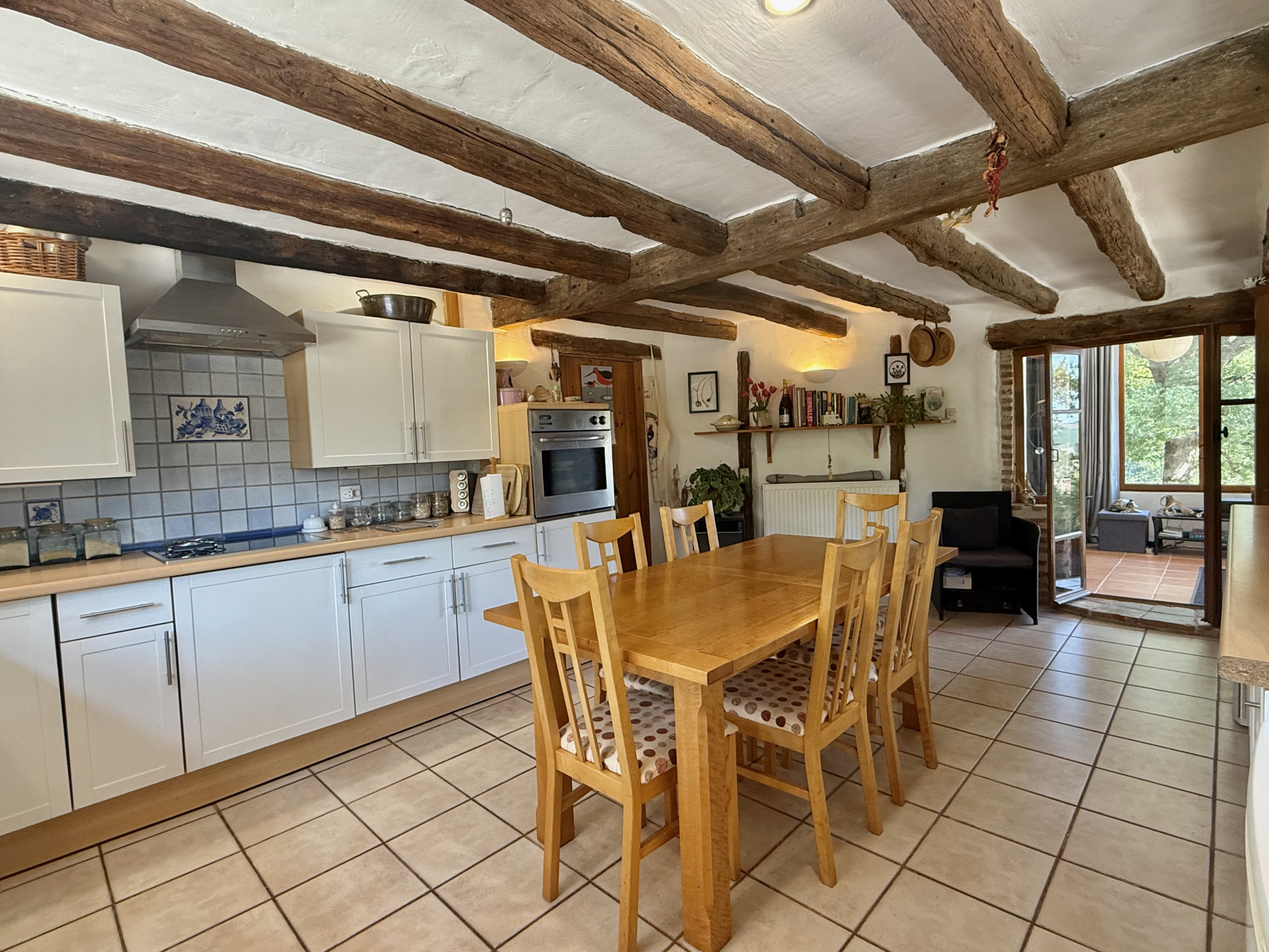 Le rez-de-chaussée s’ouvre sur un hall d’entrée accueillant avec porte écurie et escalier, menant à une salle d’eau avec WC ainsi qu’à une cuisine entièrement équipée, baignée de lumière grâce à ses fenêtres à double exposition. Le salon spacieux dispose de portes-fenêtres donnant sur la terrasse et bénéficie de la chaleur de l’insert. À l’étage, la chambre principale, avec ses poutres apparentes et ses grandes fenêtres offrant une vue dégagée, dispose d’une salle de bain attenante avec baignoire, lavabo, bidet et WC. Un palier sert actuellement de deuxième chambre, tandis que la troisième chambre profite également de belles dimensions et d’une luminosité généreuse.